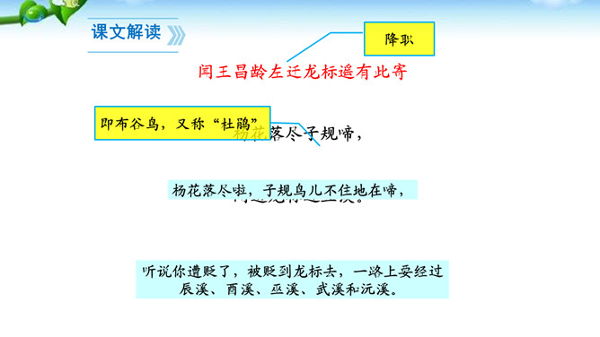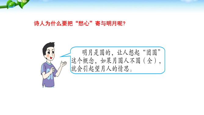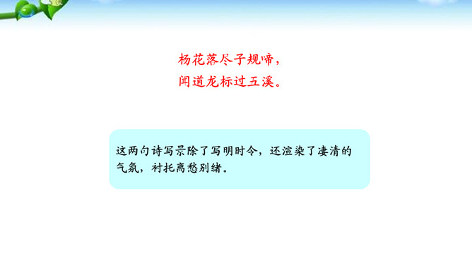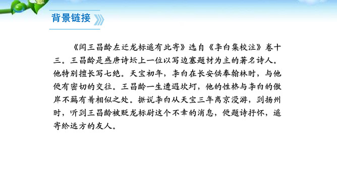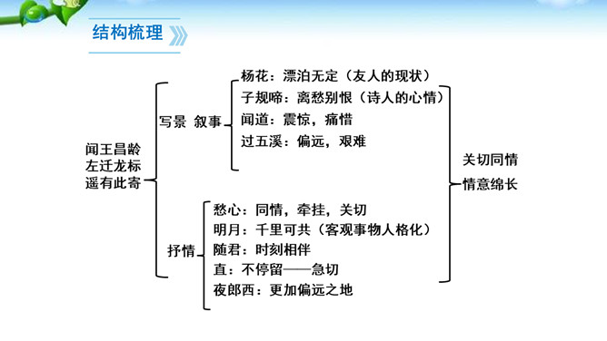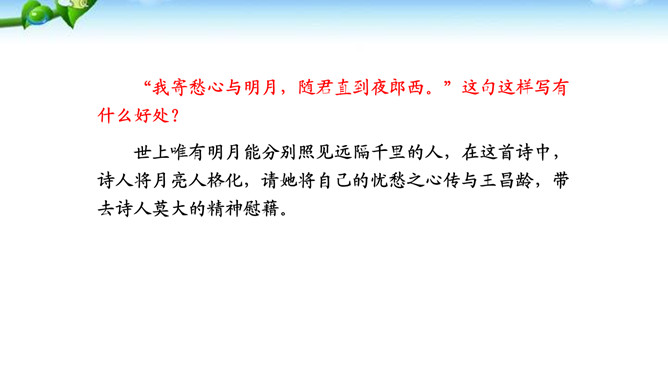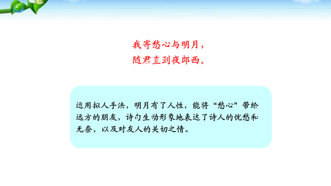 这两句诗写景除了写明时令,还渲染了凄清的气氛,衬托离愁别绪。“我寄愁心与明月,随君直到夜郎西。”这句这样写有什么好处?世上唯有明月能分别照见远隔千里的人,在这首诗中,诗人将月亮人格化,请她将自己的忧愁之心传与王昌龄,带去诗人莫大的精神慰藉。运用拟人手法,明月有了人性,能将“愁心”带给远方的朋友,诗句生动形象地表达了诗人的忧愁和无奈,以及对友人的关切之情。所属专题:闻王昌龄左迁龙标遥有此寄ppt。