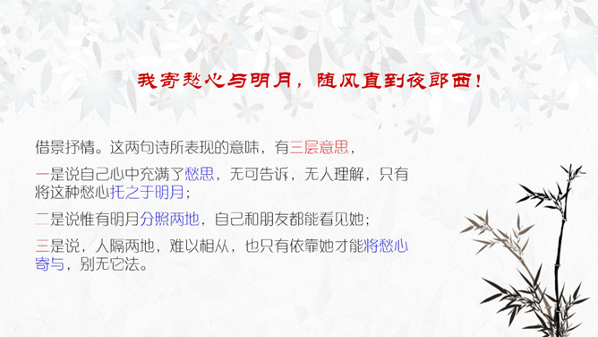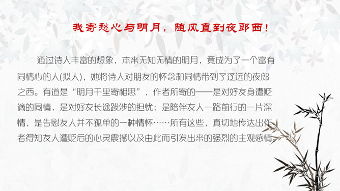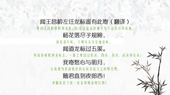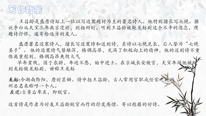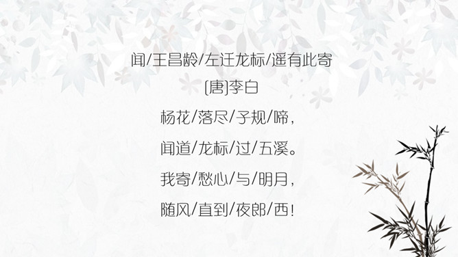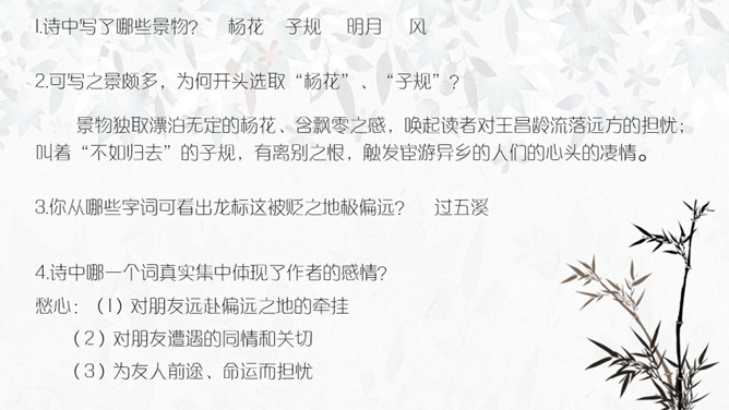 1.诗中写了哪些景物?杨花、子规、明月、风。2.可写之景颇多,为何开头选取“杨花”、“子规”?景物独取漂泊无定的杨花、含飘零之感,唤起读者对王昌龄流落远方的担忧;叫着“不如归去”的子规,有离别之恨,触发宦游异乡的人们的心头的凄情。3.你从哪些字词可看出龙标这被贬之地极偏远?过五溪。4.诗中哪一个词真实集中体现了作者的感情? 愁心:(1)对朋友远赴偏远之地的牵挂。(2)对朋友遭遇的同情和关切。所属专题:闻王昌龄左迁龙标遥有此寄ppt。