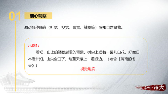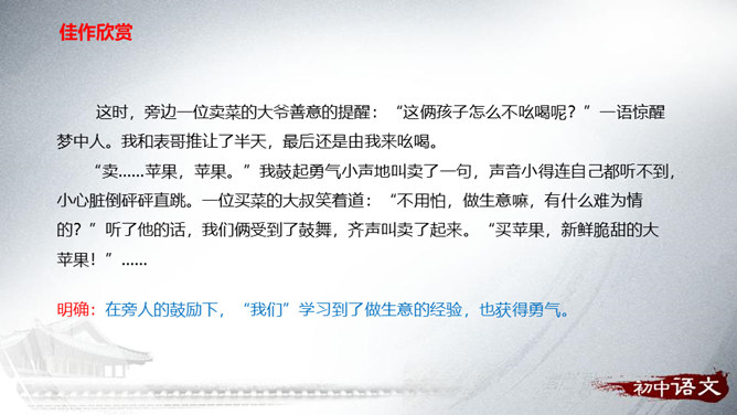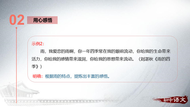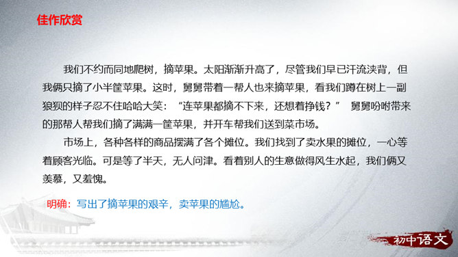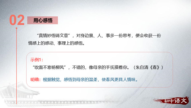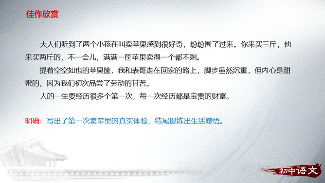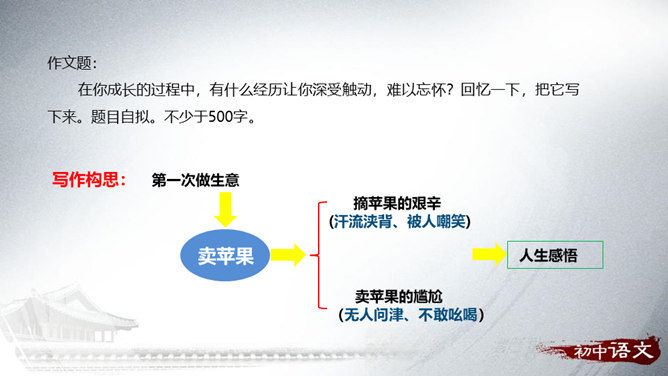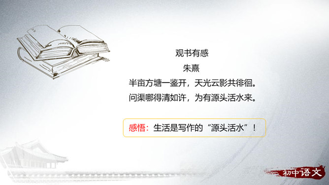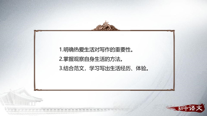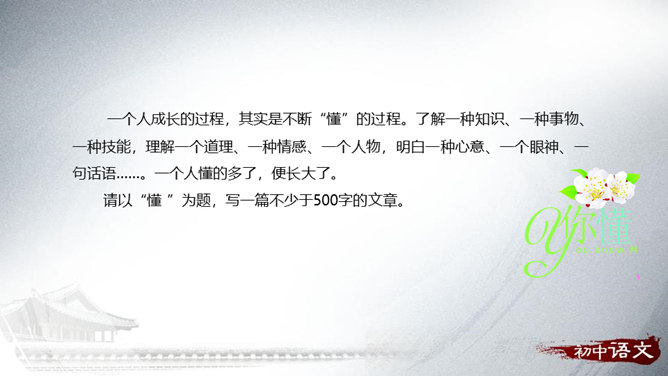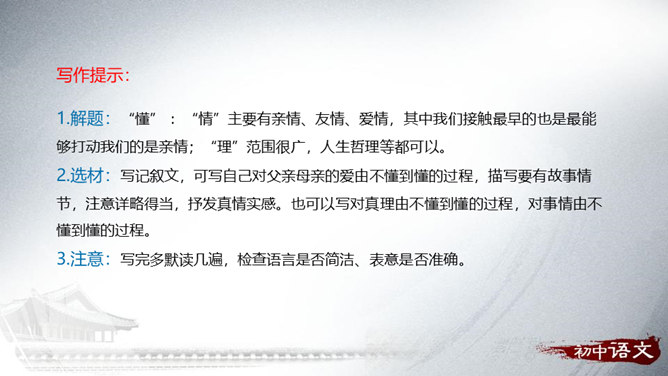 掌握观察自身生活的方法。结合范文,学习写出生活经历、体验。调动各种感官(听觉、视觉、嗅觉、触觉等)感知自然景物。“真情妙悟铸文章”,对身边景、人、事多一份思考,便会收获一份情感上的感动、事理上的感悟。 解题:“懂” :“情”主要有亲情、友情、爱情,其中我们接触最早的也是最能够打动我们的是亲情;“理”范围很广,人生哲理等都可以。 选材:写记叙文,可写自己对父亲母亲的爱由不懂到懂的过程,描写要有故事情节,注意详略得当,抒发真情实感。也可以写对真理由不懂到懂的过程,对事情由不懂到懂的过程。所属专题:热爱生活热爱写作ppt。