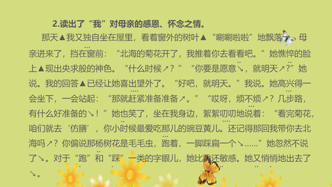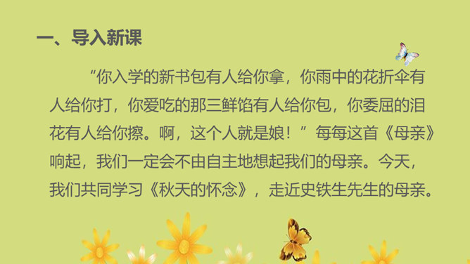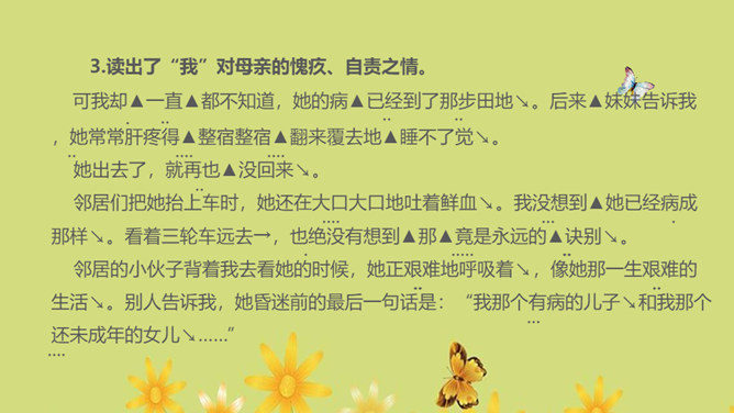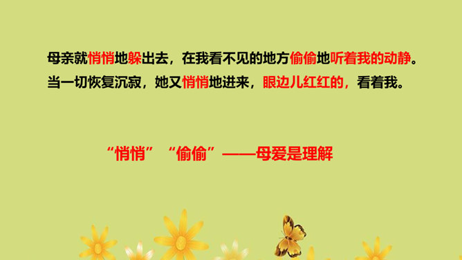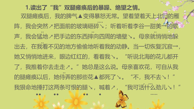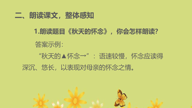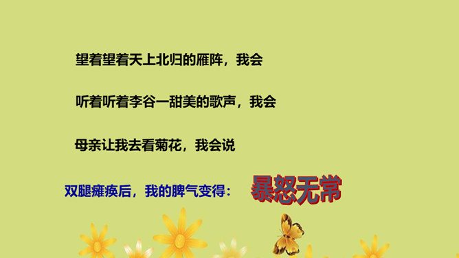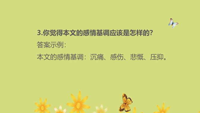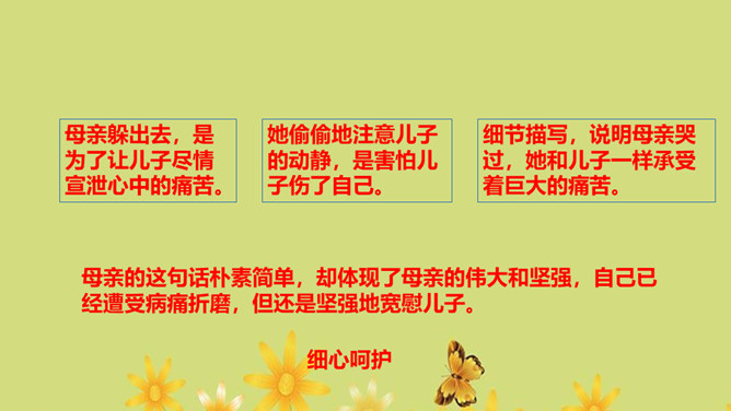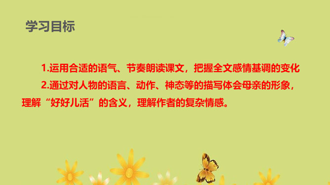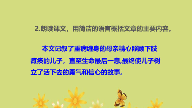 1.运用合适的语气、节奏朗读课文,把握全文感情基调的变化2.通过对人物的语言、动作、神态等的描写体会母亲的形象,理解“好好儿活”的含义,理解作者的复杂情感。朗读课文,用简洁的语言概括文章的主要内容。本文记叙了重病缠身的母亲精心照顾下肢瘫痪的儿子,直至生命最后一息,最终使儿子树立了活下去的勇气和信心的故事。你觉得本文的感情基调应该是怎样的?本文的感情基调:沉痛、感伤、悲慨、压抑。所属专题:秋天的怀念ppt。