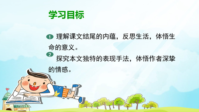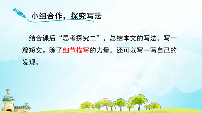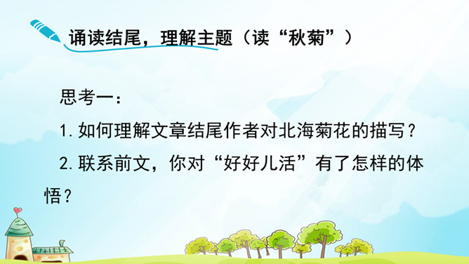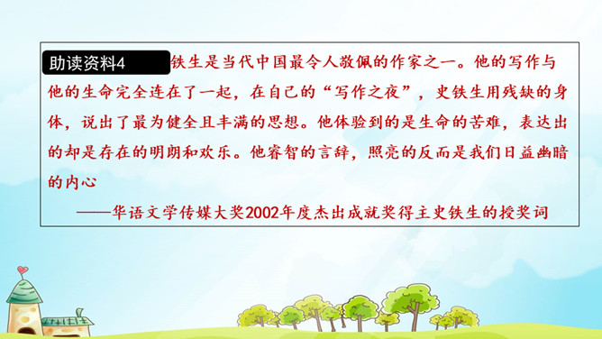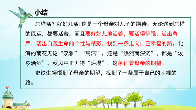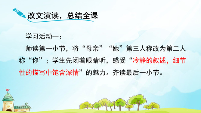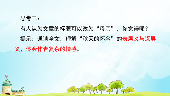 有人认为文章的标题可以改为“母亲”,你觉得呢?提示:通读全文,理解“秋天的怀念”的表层义与深层义,体会作者复杂的情感。结合课后“思考探究二”,总结本文的写法,写一篇短文。除了细节描写的力量,还可以写一写自己的发现。师读第一小节,将“母亲”“她”第三人称改为第二人称“你”;学生先闭着眼睛听,感受“冷静的叙述,细节性的描写中饱含深情”的魅力。齐读最后一小节。推荐阅读史铁生的《我与地坛》,并写出不少于600字的读后感。所属专题:秋天的怀念ppt。