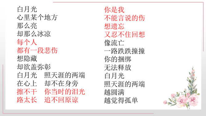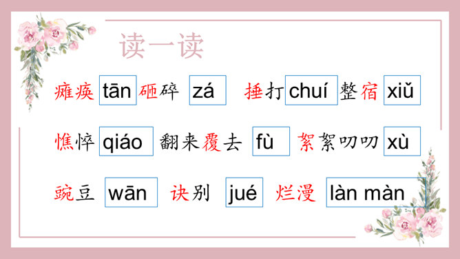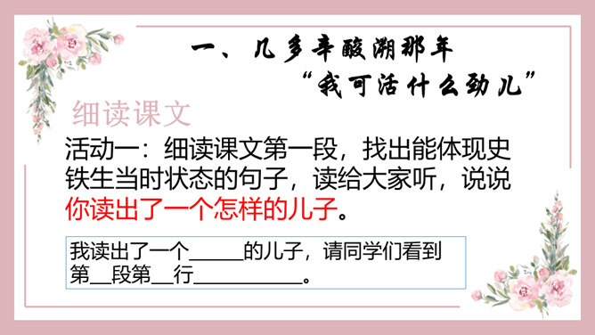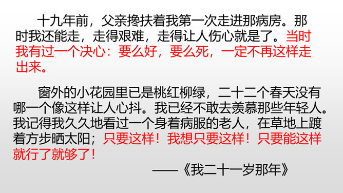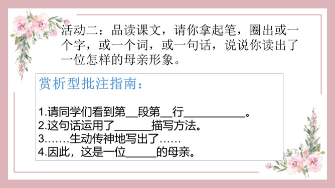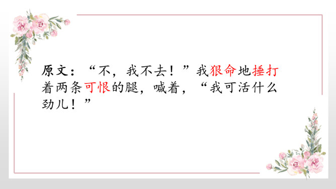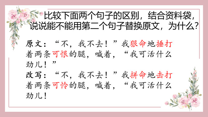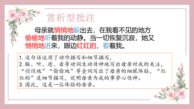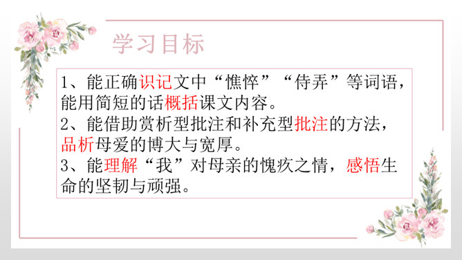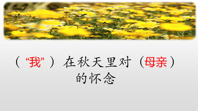 1、能正确识记文中“憔悴”“侍弄”等词语,能用简短的话概括课文内容。2、能借助赏析型批注和补充型批注的方法,品析母爱的博大与宽厚。3、能理解“我”对母亲的愧疚之情,感悟生命的坚韧与顽强。细读课文第一段,找出能体现史铁生当时状态的句子,读给大家听,说说你读出了一个怎样的儿子。比较下面两个句子的区别,结合资料袋,说说能不能用第二个句子替换原文,为什么?躲、听、进、看等动词生动传神地写出母亲对我的关注。所属专题:秋天的怀念ppt。