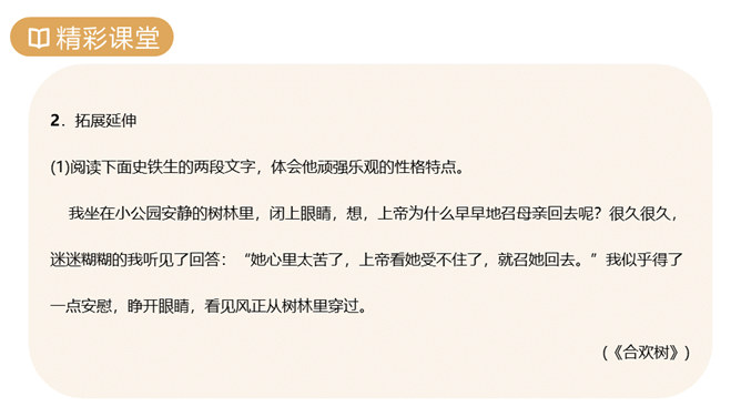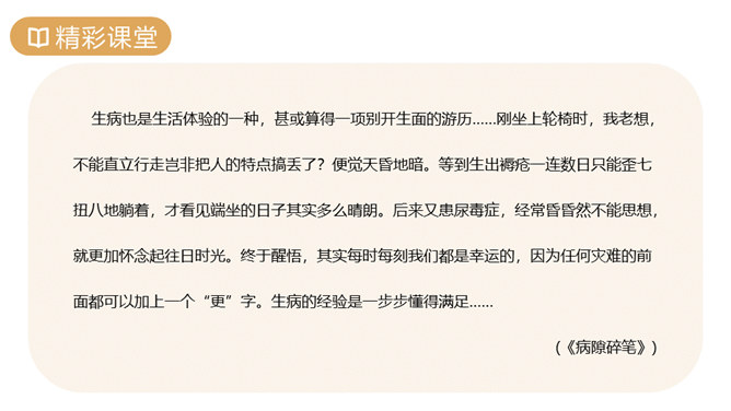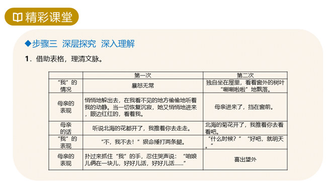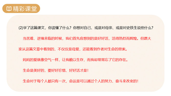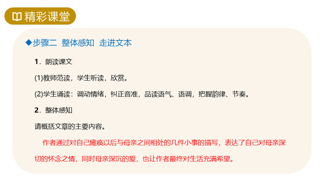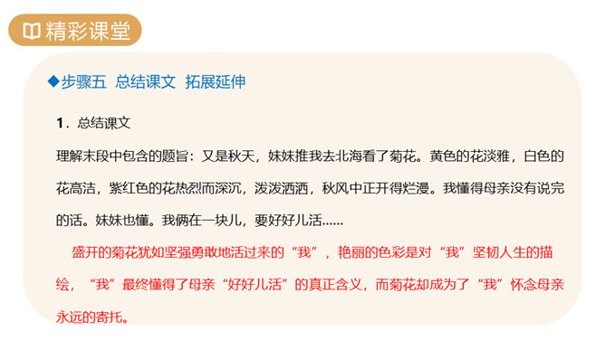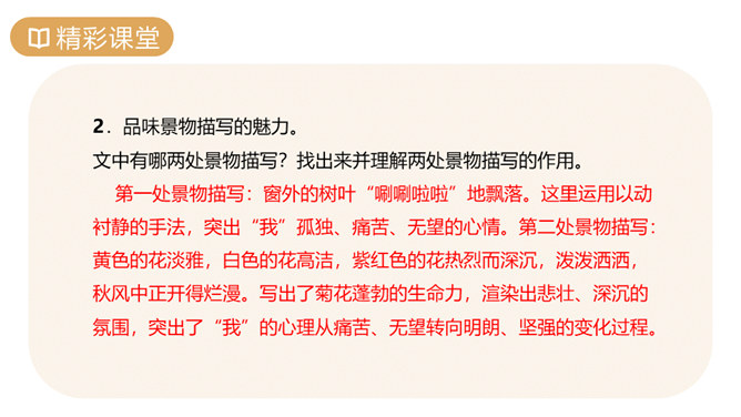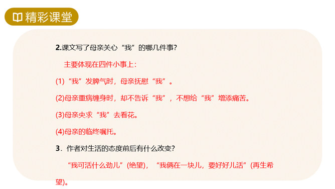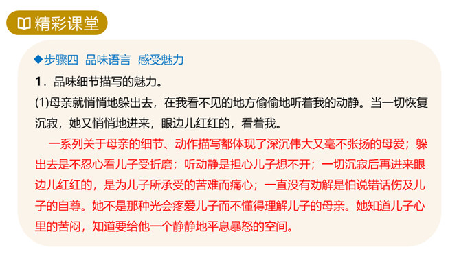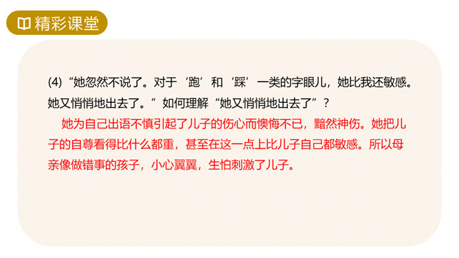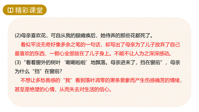 一系列关于母亲的细节、动作描写都体现了深沉伟大又毫不张扬的母爱;躲出去是不忍心看儿子受折磨;听动静是担心儿子想不开;一切沉寂后再进来眼边儿红红的,是为儿子所承受的苦难而痛心;一直没有劝解是怕说错话伤及儿子的自尊。她不是那种光会疼爱儿子而不懂得理解儿子的母亲。她知道儿子心里的苦闷,知道要给他一个静静地平息暴怒的空间。看似平淡无奇好像多余之笔的一句话,却写出了母亲为了儿子放弃了自己最喜欢的东西,一颗心全部放在了儿子身上。不能不让人为之深深感动。所属专题:秋天的怀念ppt。