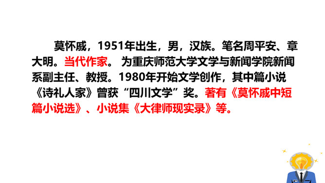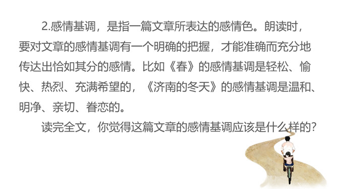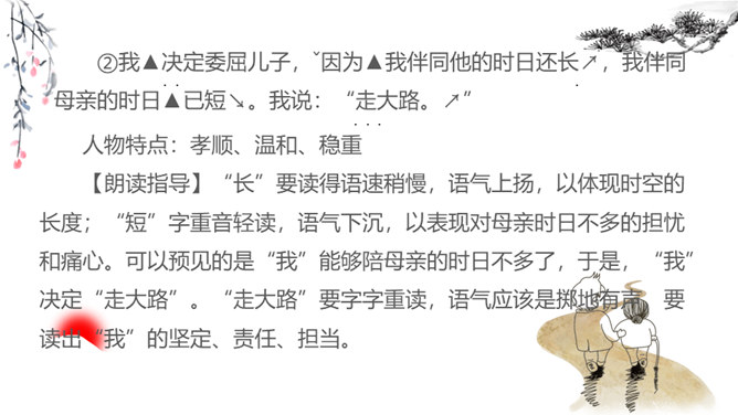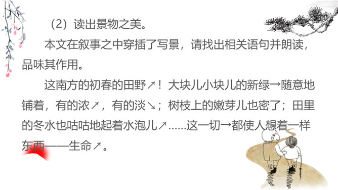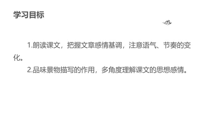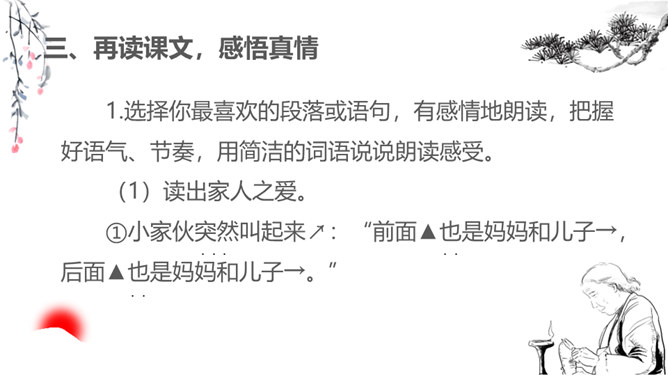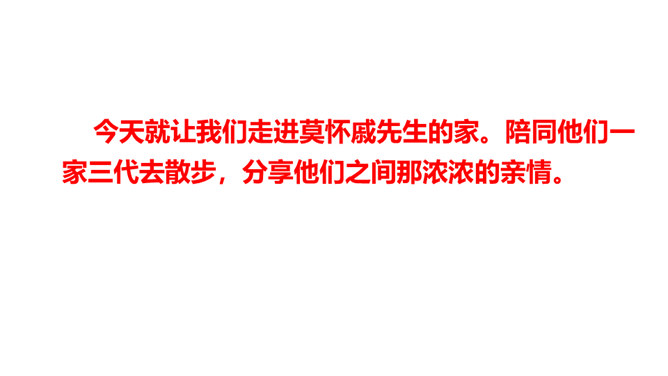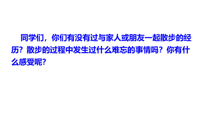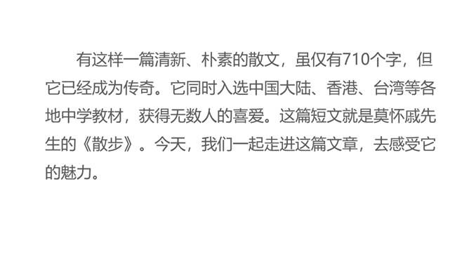 1.朗读课文,把握文章感情基调,注意语气、节奏的变化。2.品味景物描写的作用,多角度理解课文的思想感情。同学们,你们有没有过与家人或朋友一起散步的经历?散步的过程中发生过什么难忘的事情吗?你有什么感受呢?今天就让我们走进莫怀戚先生的家。陪同他们一家三代去散步,分享他们之间那浓浓的亲情。有这样一篇清新、朴素的散文,虽仅有710个字,但它已经成为传奇。它同时入选中国大陆、香港、台湾等各地中学教材,获得无数人的喜爱。这篇短文就是莫怀戚先生的《散步》。今天,我们一起走进这篇文章,去感受它的魅力。所属专题:散步ppt。