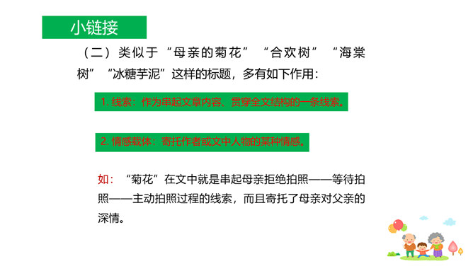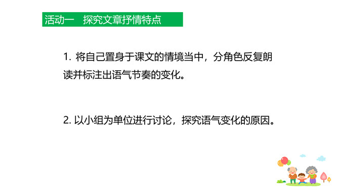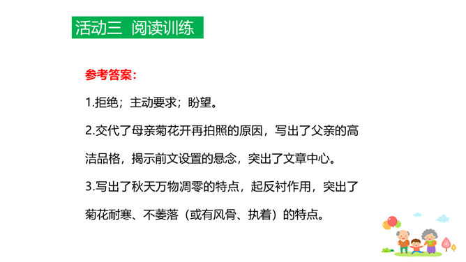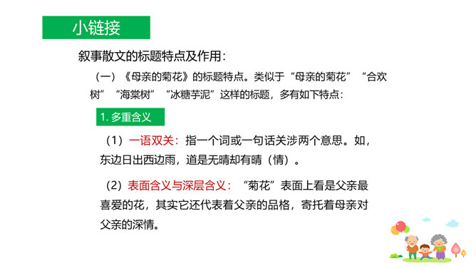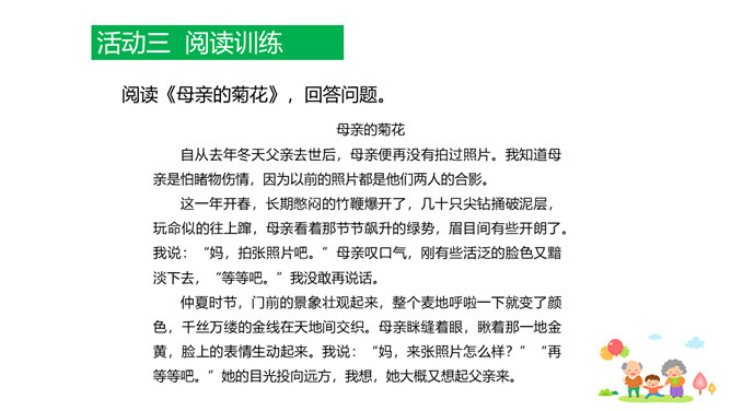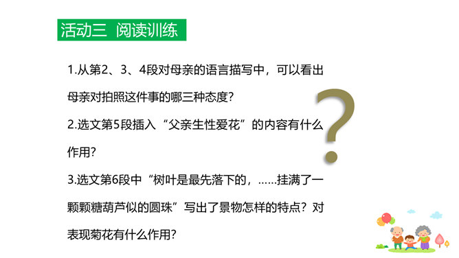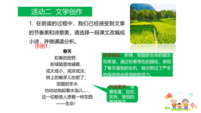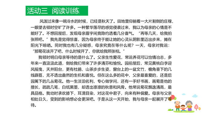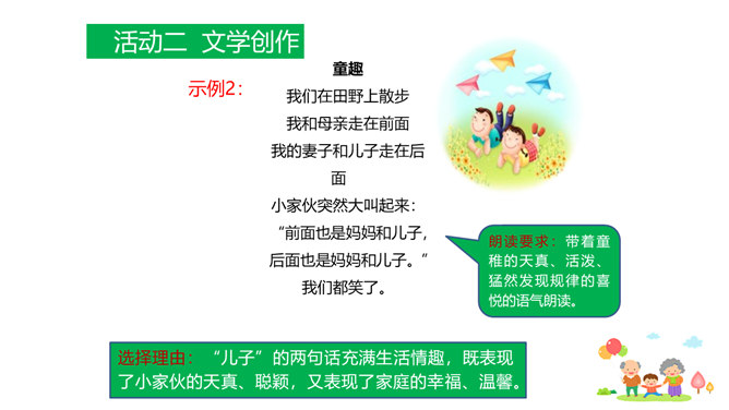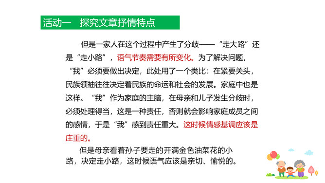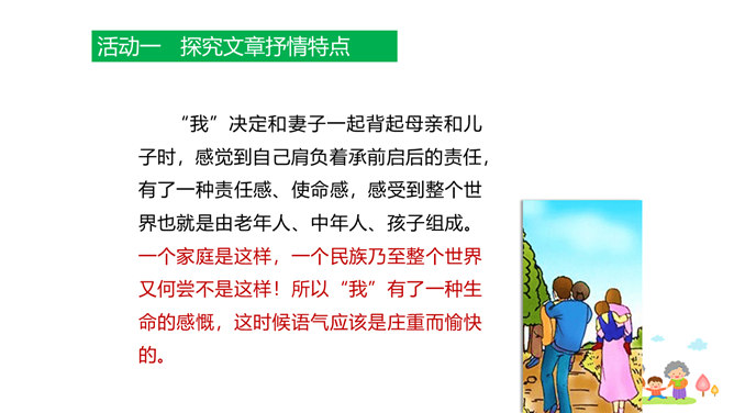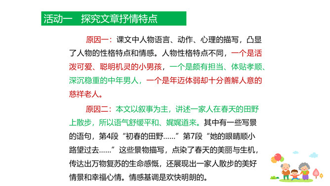 原因一:课文中人物语言、动作、心理的描写,凸显了人物的性格特点和情感。人物性格特点不同,一个是活泼可爱、聪明机灵的小男孩,一个是颇有担当、体贴孝顺、深沉稳重的中年男人,一个是年迈体弱却十分善解人意的慈祥老人。原因二:本文以叙事为主,讲述一家人在春天的田野上散步,所以语气舒缓平和、娓娓道来。其中有一些写景的语句,第4段“初春的田野……”第7段“她的眼睛顺小路望过去……”这些景物描写,点染了春天的美丽与生机,传达出万物复苏的生命感慨,还展现出一家人散步的美好情景和幸福心情。情感基调是欢快明朗的。所属专题:散步ppt。