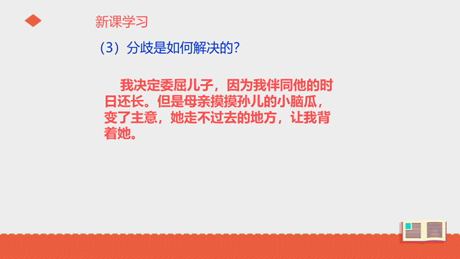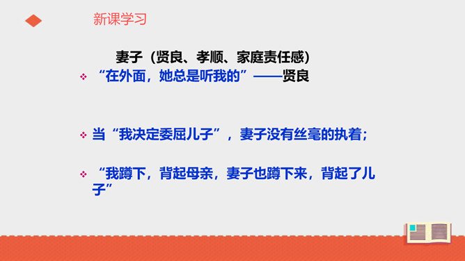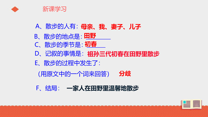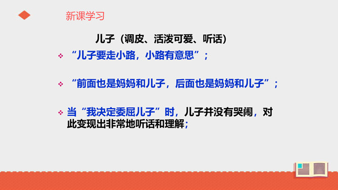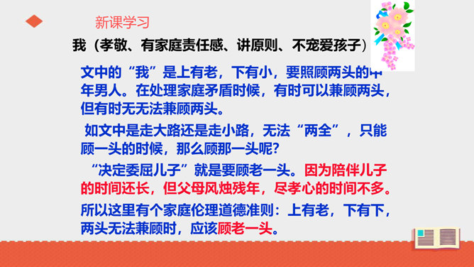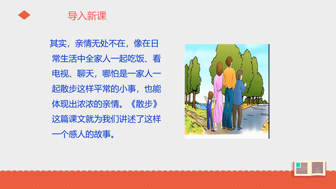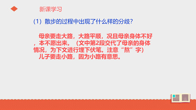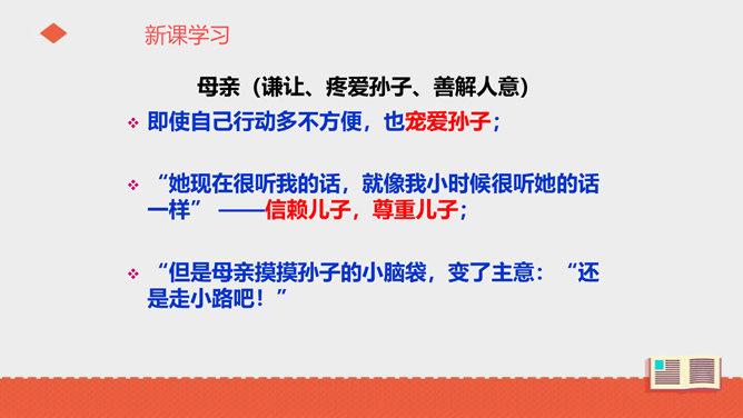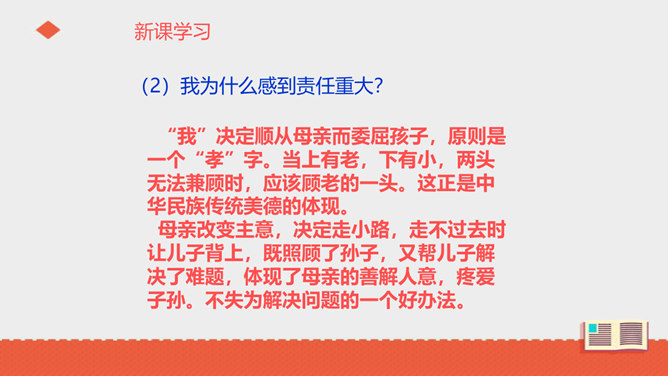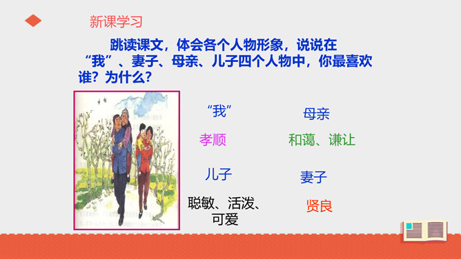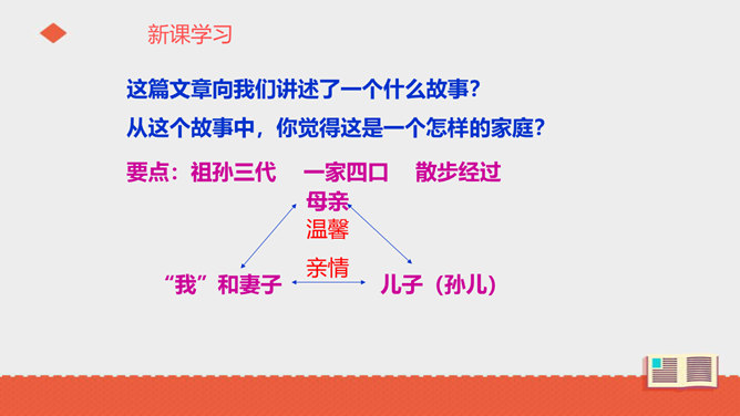 课文以“我”为中心人物,以“我”和母亲的关系为主线,用朴实的语言,展现了一家四口、祖孙三代、互敬互爱,融洽和睦的关系,体现了中华民族尊老爱幼的传统美德,渗透着肩负重任的中年人对于生活的高度的使命感。可见,本文写了一件“散步”的小事,却表现了“尊老爱幼”的大主题,这就是“以小见大”的写法。世界这个词是“大词小用”。从深层的意思看,这里的我和妻子代表着中年人,母亲代表着“过去”,儿子代表着“未来”所以对于一个国家,一个民族而言则象征着中年人肩负承前启后、继往开来的历史责任。所属专题:散步ppt。
