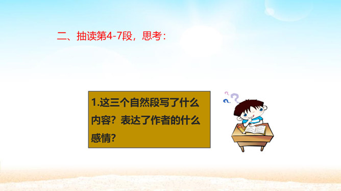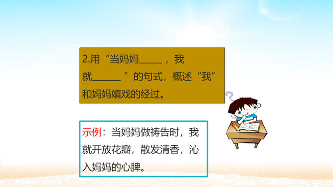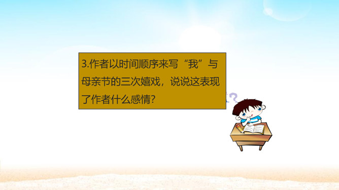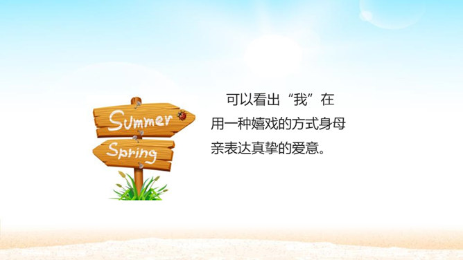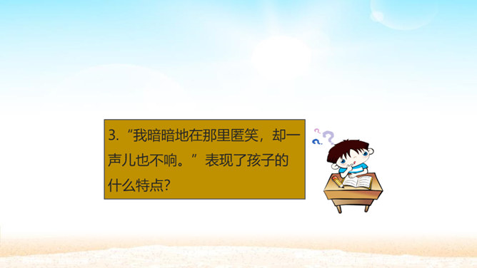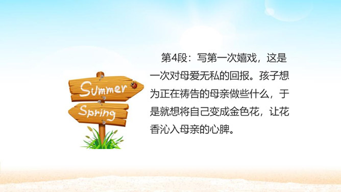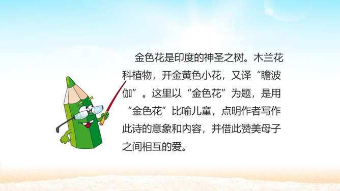 孩子为什么想变成一朵金色花,而且一而再、再而三地不让妈妈知道? 一是印度人喜欢用花比喻儿童,二是泰戈尔借美丽的圣树上的金色花赞美孩子可爱。那金黄的色彩,正反映着母爱的光辉。人们喜爱花儿,花儿也可以象征孩子回报母爱的心愿。泰戈尔的想象实在新奇而美妙。孩子总想为妈妈做点事,变成一朵金色花,可以看着妈妈工作,可以让妈妈嗅到花香,可以为妈妈遮挡住刺眼的阳光。孩子懂得,母爱的奉献是无私的,对母爱的回报也应该是无私的,他不图妈妈夸奖,但求妈妈生活得更加温馨。所以他只是撒娇,就是瞒着妈妈。所属专题:金色花ppt。