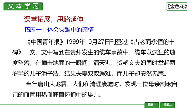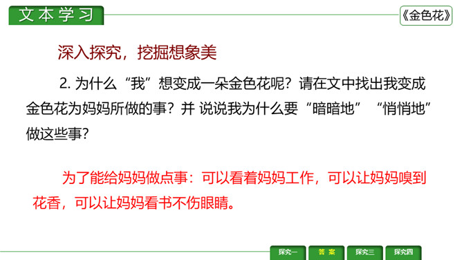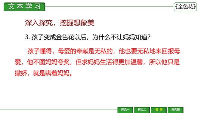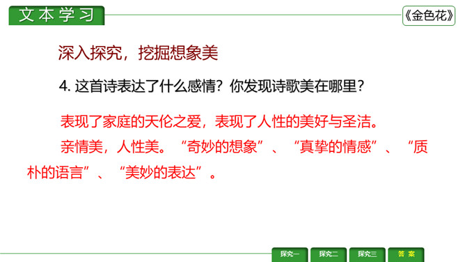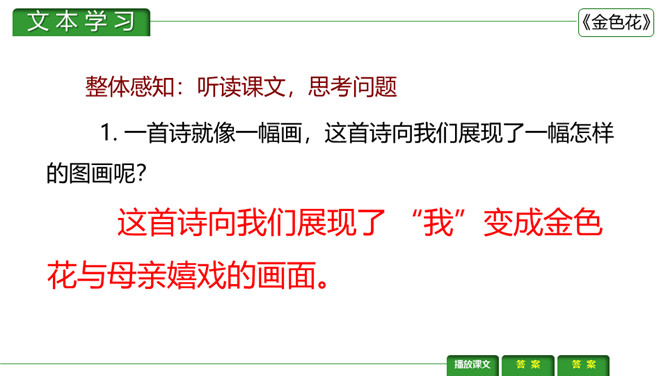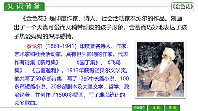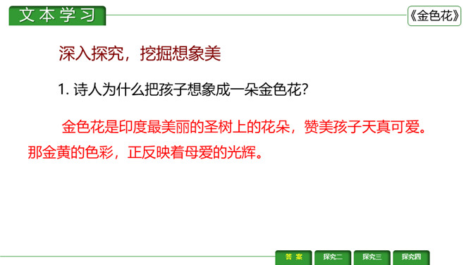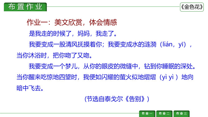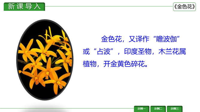 金色花,又译作“瞻波伽”或“占波”,印度圣物,木兰花属植物,开金黄色碎花。《金色花》是印度作家、诗人、社会活动家泰戈尔的作品。刻画出了一个天真可爱而又稍带顽皮的孩子形象,含蓄而巧妙地表达了孩子热爱妈妈的深厚感情。刻画出了一个天真可爱而又稍带顽皮的孩子形象,含蓄而巧妙地表达了孩子热爱妈妈的深厚感情。让我们一起来赏析一下这首诗。请同学们说说这首诗写了几个人物?写了他们之间的什么事?所属专题:金色花ppt。