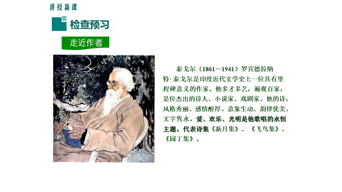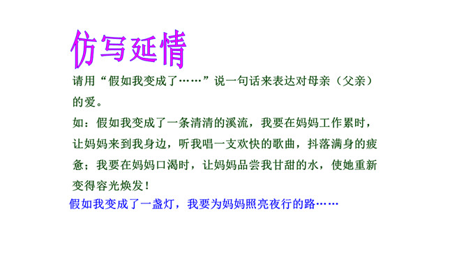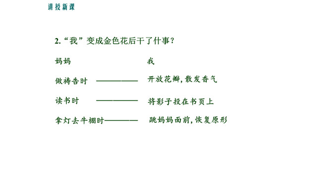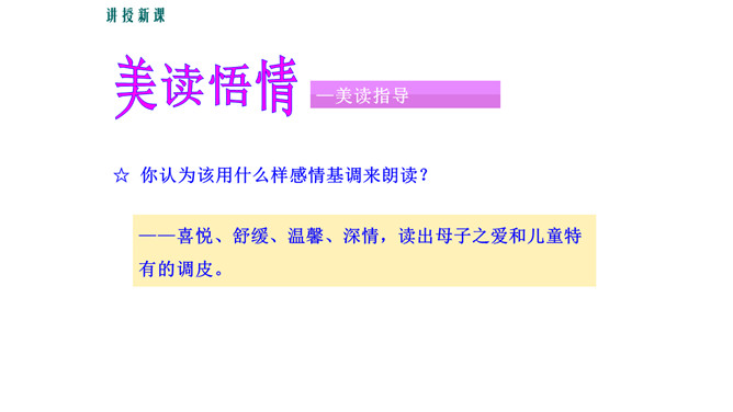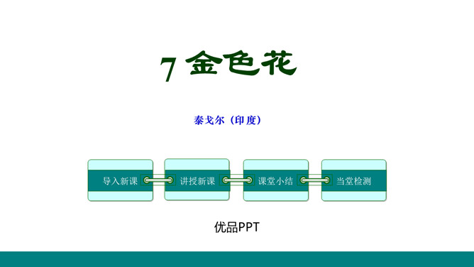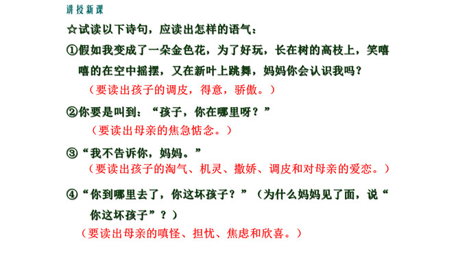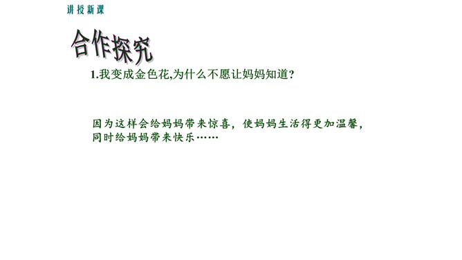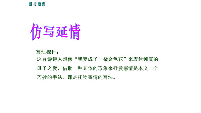 你认为该用什么样感情基调来朗读?喜悦、舒缓、温馨、深情,读出母子之爱和儿童特有的调皮。作者为什么把孩子想象为金色花?金色花是美丽的圣树上的花朵,赞美孩子可爱。那金黄的色彩,正反映着母爱的光辉。人们喜爱花儿,花儿也惠及人们,正可以象征孩子回报母爱的心愿。这首诗诗人想像“我变成了一朵金色花”来表达纯真的母子之爱,借助一种具体的形象来抒发感情是本文一个巧妙的手法。即是托物寄情的写法。所属专题:金色花ppt。