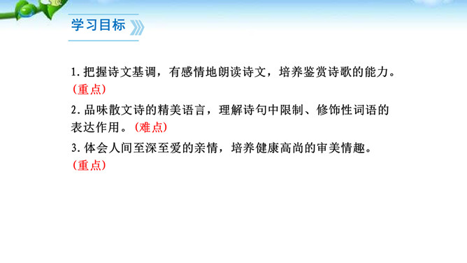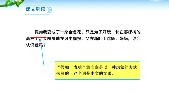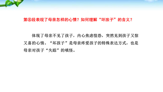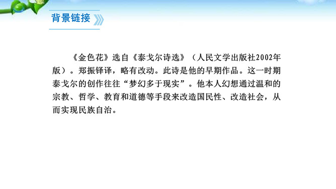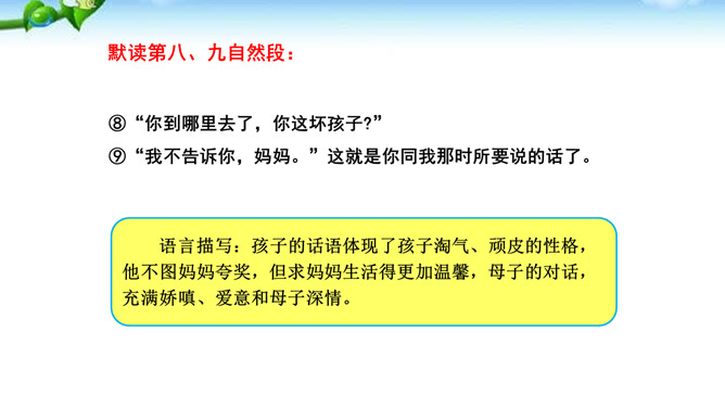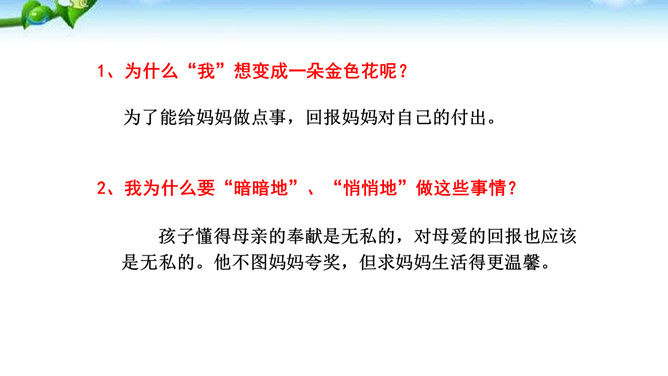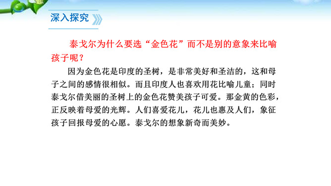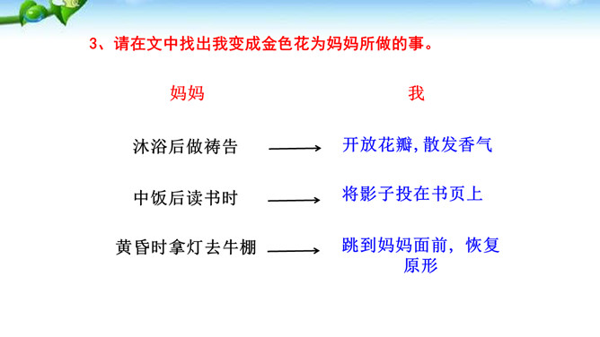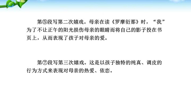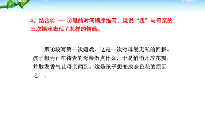 结合④ ~ ⑦段的时间顺序描写,说说“我”与母亲的三次嬉戏表现了怎样的情感。第④段写第一次嬉戏,这是一次对母爱无私的回报。孩子想为正在祷告的母亲做点什么,于是悄悄开放花瓣,并散发香气让母亲闻到。这是孩子想变成金色花的原因之一。第⑤段写第二次嬉戏。母亲在读《罗摩衍那》时,“我”为了不让正午的阳光损伤母亲的眼睛而将自己的影子投在书页上,从而表现了孩子对母亲的爱。第⑦段写第三次嬉戏。这是以孩子独特的纯真、调皮的行为方式来表现对母亲的热爱、依恋。所属专题:金色花ppt。