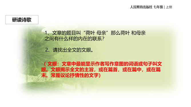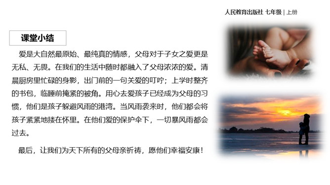 爱是大自然最原始、最纯真的情感,父母对于子女之爱更是无私、无畏。在我们的生活中随时都融入了父母浓浓的爱。清晨厨房里忙碌的身影,出门前的一句关爱的叮咛;上学时整齐的书包,临睡前掩紧的被角。用心去爱孩子已经成为父母的习惯,他们是孩子躲避风雨的港湾。当风雨袭来时,他们都会将孩子紧紧地搂在怀里。在他们爱的保护伞下,一切暴风雨都会过去。最后,让我们为天下所有的父母亲祈祷,愿他们幸福安康!所属专题:荷叶母亲ppt。