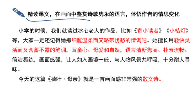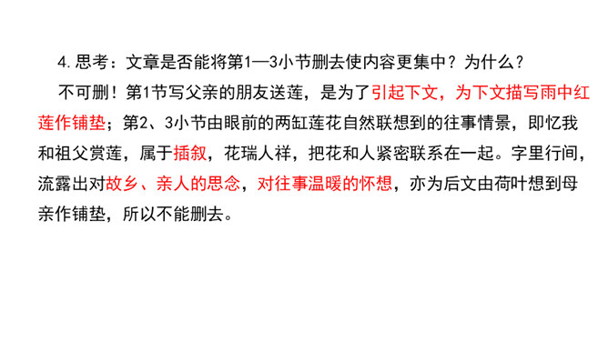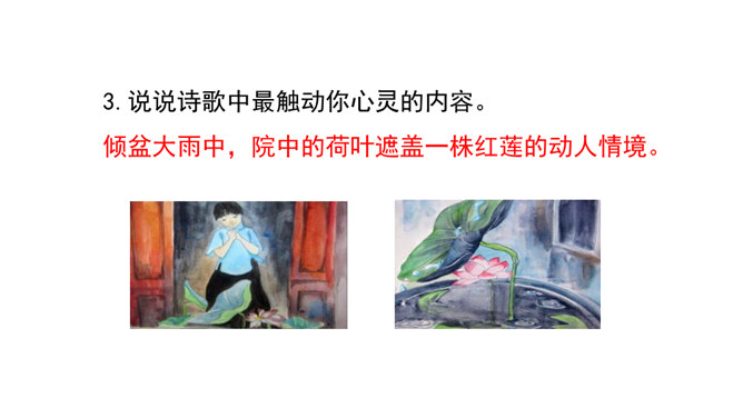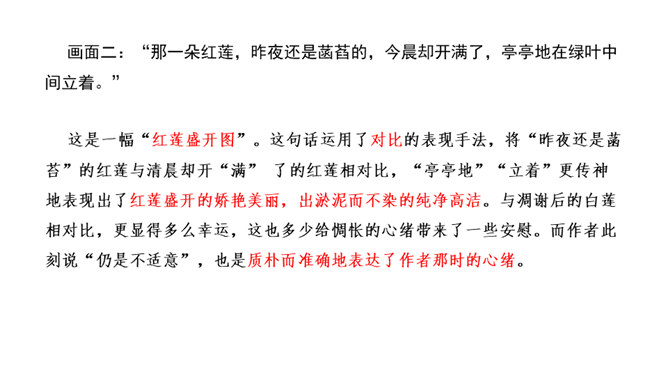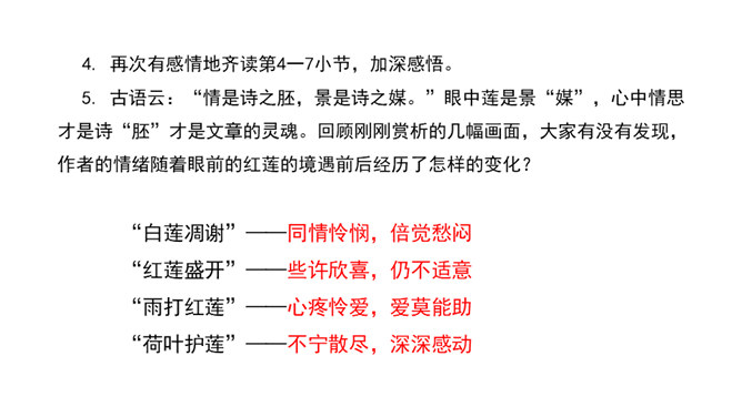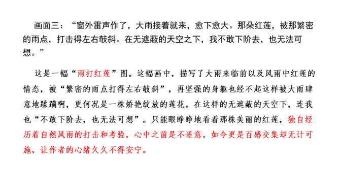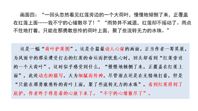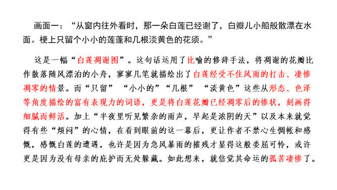 这句话运用了比喻的修辞手法,将凋谢的花瓣比作散落随风漂泊的小舟,寥寥几笔就描绘出了白莲经受不住风雨的打击、凄惨凋零的情景。而“只留” “小小的”“几根” “淡黄色”这些从形态、色泽等角度描绘的富有表现力的词语,更是将白莲花瓣已经凋零后的惨状,刻画得细腻而鲜活。加上“半夜里听见繁杂的雨声,早起是浓阴的天”以及本来就觉得有些“烦闷”的心情,在看到眼前的这一幕后,更让作者不禁心生惆帐和感慨,感慨白莲的遭遇,也许是因为急风暴雨的摧残才显得这般委屈可怜,或许更是因为没有母亲的庇护而无处躲藏。如此想来,就倍觉其命运的孤苦凄惨了。所属专题:荷叶母亲ppt。