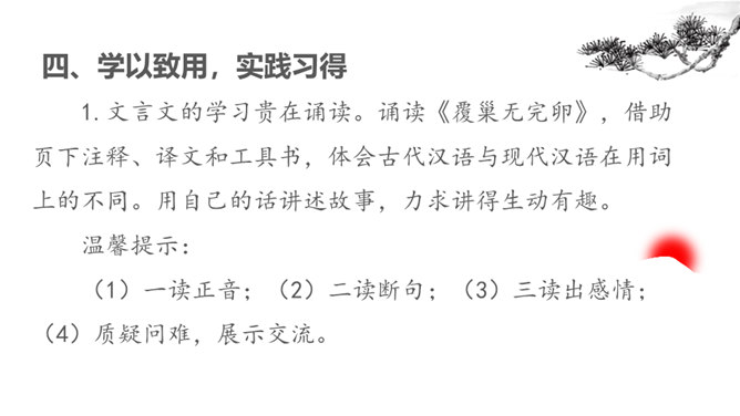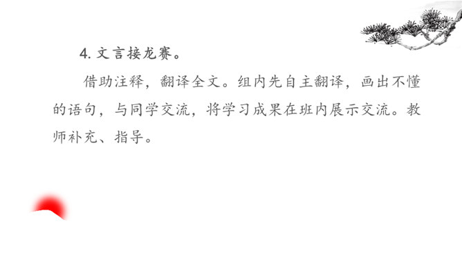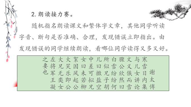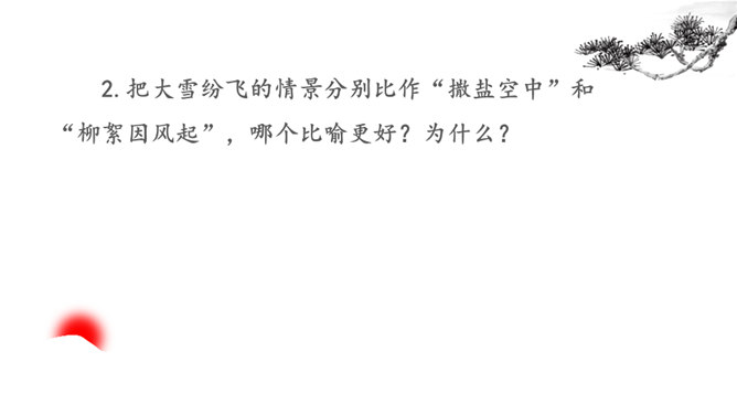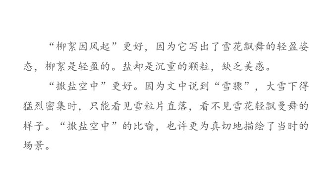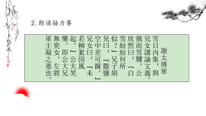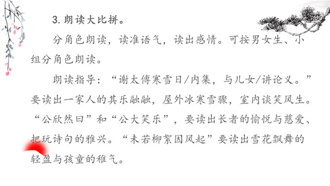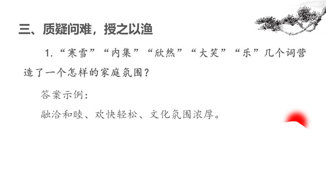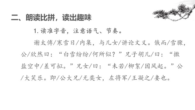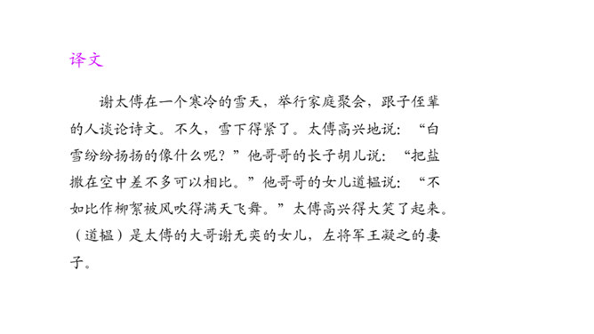 1.诵读古文,积累文言词语,培养文言语感。2.感受古代儿童的聪慧机敏和良好的家庭教养。随机指名朗读课文和繁体字文章,其他同学听读字音、断句是否准确、合理,发现错误立即指出。由发现错误的同学继续朗读,看哪位同学读得又多又好。借助注释,翻译全文。组内先自主翻译,画出不懂的语句,与同学交流,将学习成果在班内展示交流。教师补充、指导。“寒雪”“内集”“欣然”“大笑”“乐”几个词营造了一个怎样的家庭氛围?所属专题:咏雪ppt。