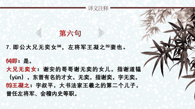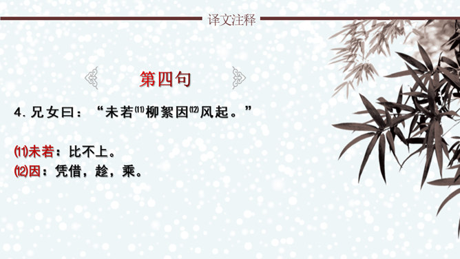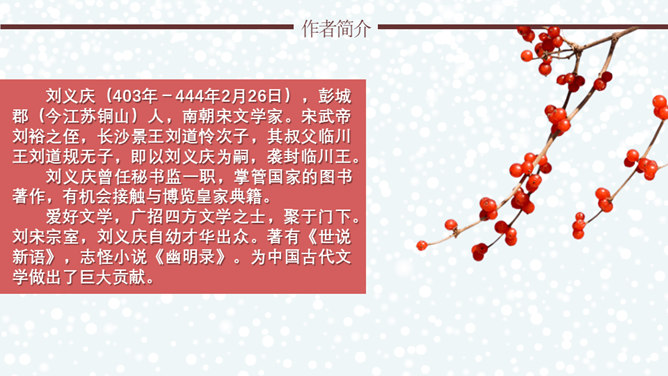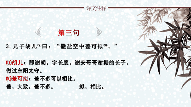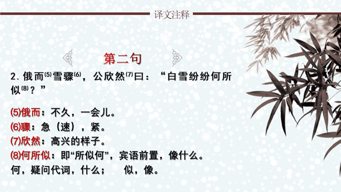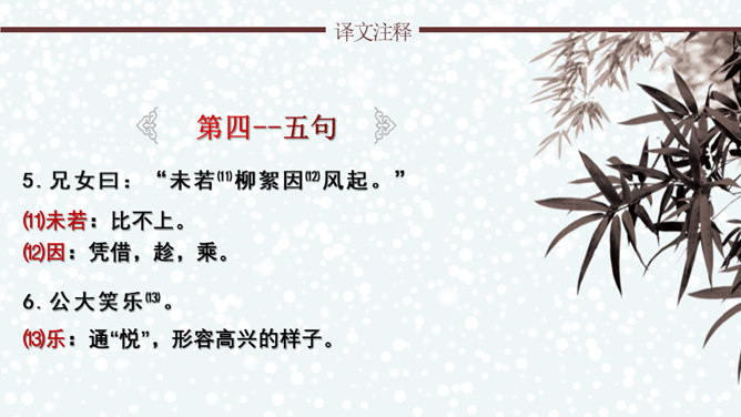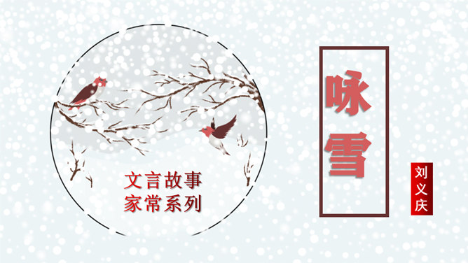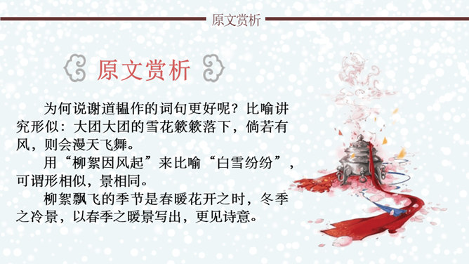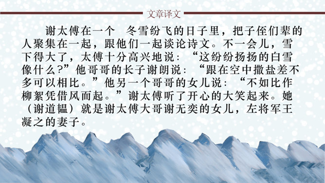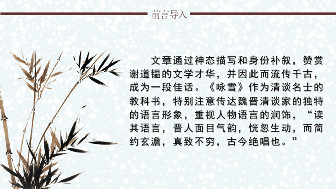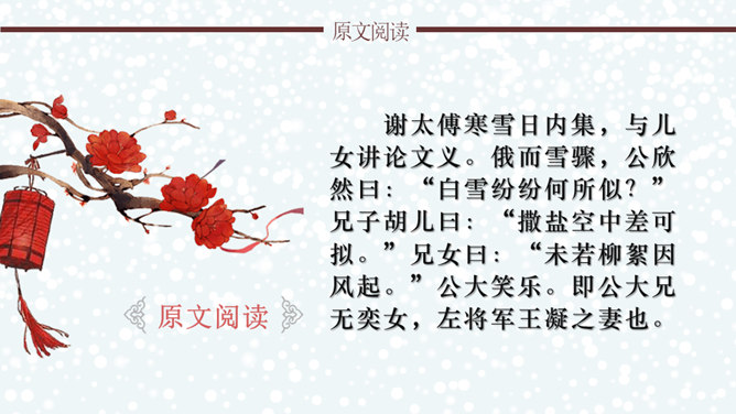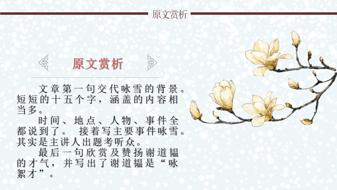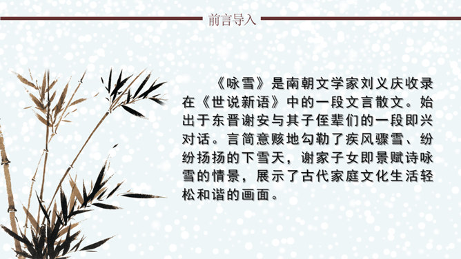 文章通过神态描写和身份补叙,赞赏谢道韫的文学才华,并因此而流传千古,成为一段佳话。《咏雪》作为清谈名士的教科书,特别注意传达魏晋清谈家的独特的语言形象,重视人物语言的润饰,“读其语言,晋人面目气韵,恍忽生动,而简约玄澹,真致不穷,古今绝唱也。”《咏雪》是南朝文学家刘义庆收录在《世说新语》中的一段文言散文。始出于东晋谢安与其子侄辈们的一段即兴对话。言简意赅地勾勒了疾风骤雪、纷纷扬扬的下雪天,谢家子女即景赋诗咏雪的情景,展示了古代家庭文化生活轻松和谐的画面。所属专题:咏雪ppt。