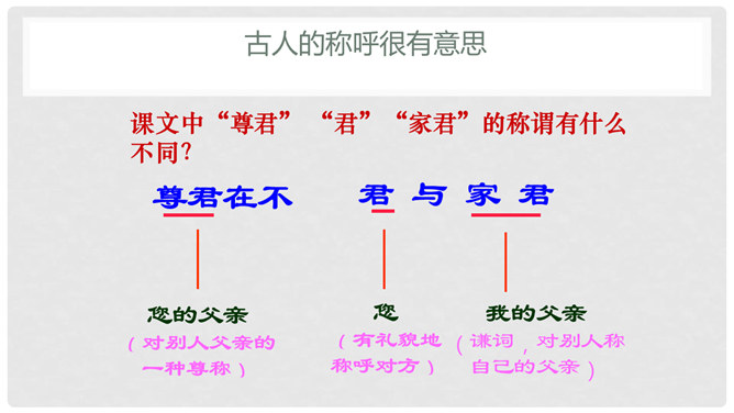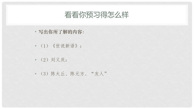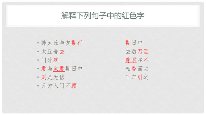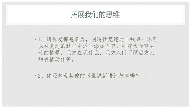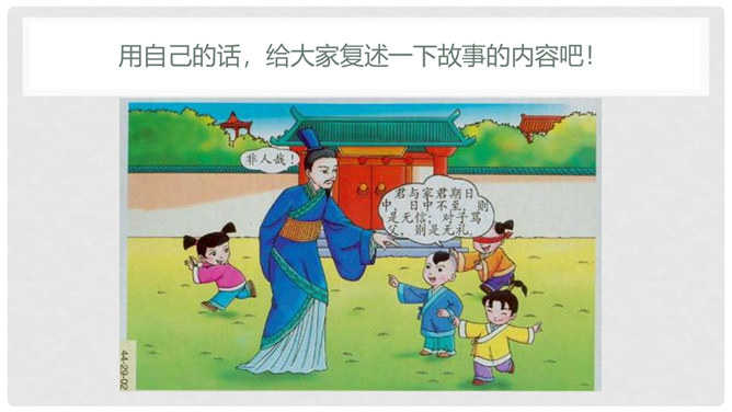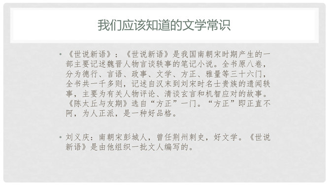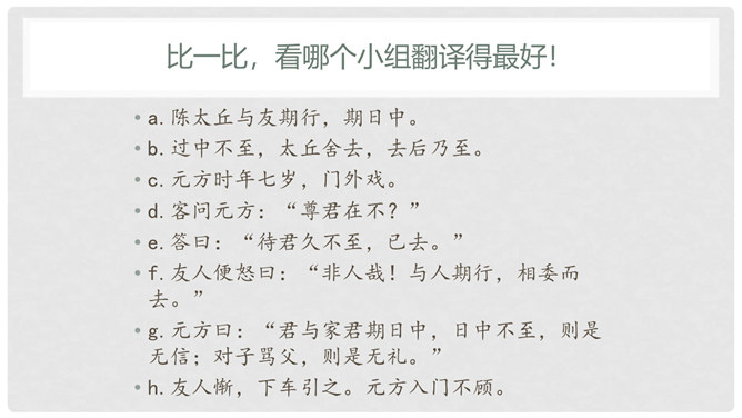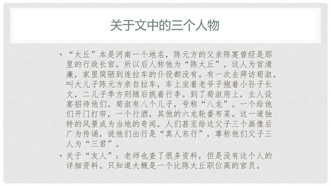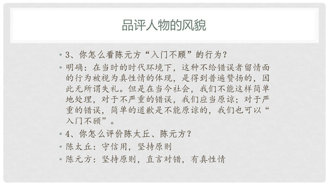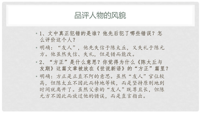 默读课文,遇到不懂的地方看课下注释和工具书,凭自己的能力解释清楚每一个字词。1、文中真正犯错的是谁?他先后犯了哪些错误?怎么评价这个人?明确:“友人”,他先失信于陈太丘,又失礼于陈元方。他虽然失信、失礼,但是错而能改。2、“方正”是什么意思?你觉得为什么《陈太丘与友期》这篇文章被放在《世说新语》的“方正”篇里?明确:方正是正直不阿的意思。虽然“友人”官位较高,但陈太丘不因此而特地等候,而是坚持原则地到时间就离开了。虽然父亲的“友人”既尊且长,但陈元方不因此而放过他的错误,而是直言指出。所属专题:陈太丘与友期行ppt。