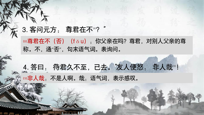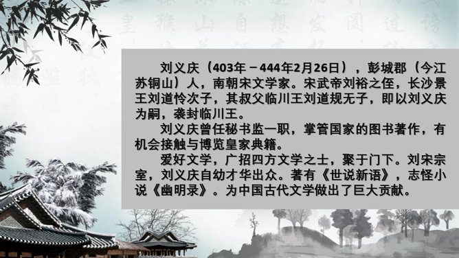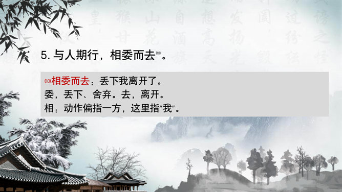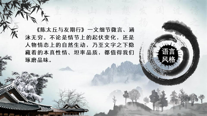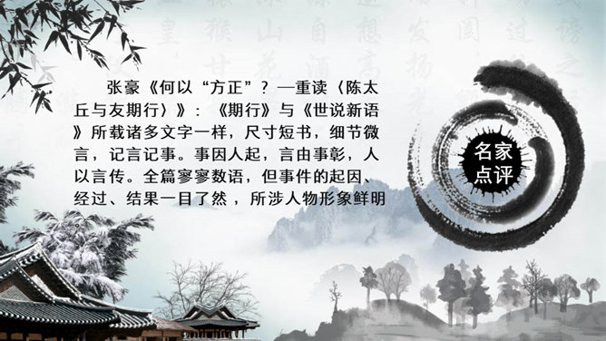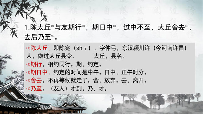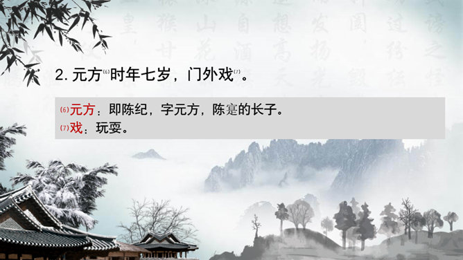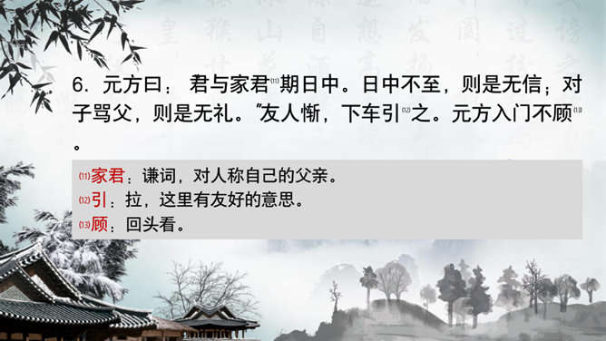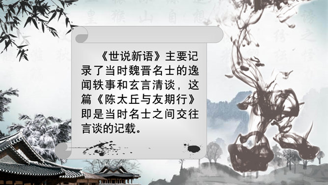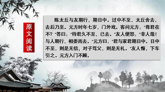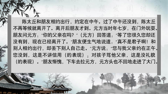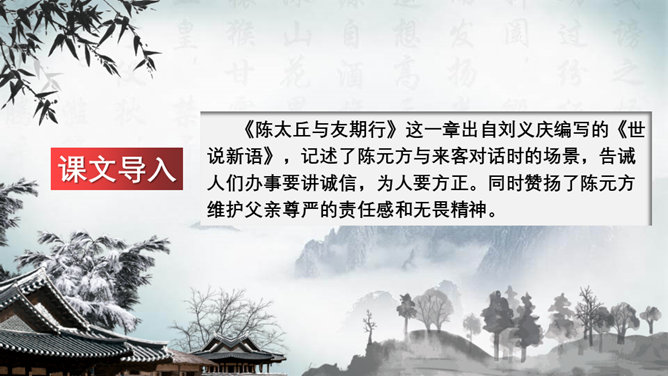 这一章出自刘义庆编写的《世说新语》,记述了陈元方与来客对话时的场景,告诫人们办事要讲诚信,为人要方正。同时赞扬了陈元方维护父亲尊严的责任感和无畏精神。全文仅有103个字,却叙述了一个完整的故事,刻画鲜明,言简意赅。精炼语言,体现在文章的始终。文章的结尾,虽只客寥数语,但却字字生辉。主题思想:主要是通过人物的对话来揭示的。文章写元方与友人的对话也有三句,抓住实质,击中要害。使友人失去辩驳的根据。所属专题:陈太丘与友期行ppt。
