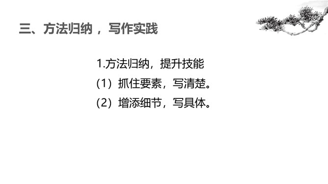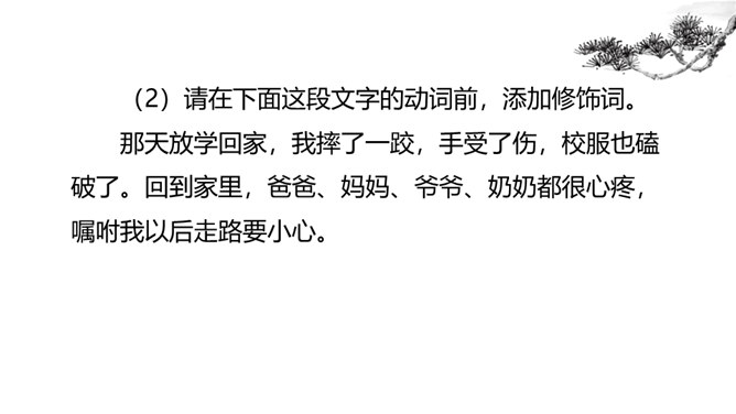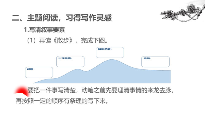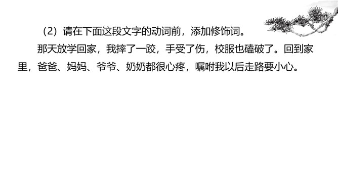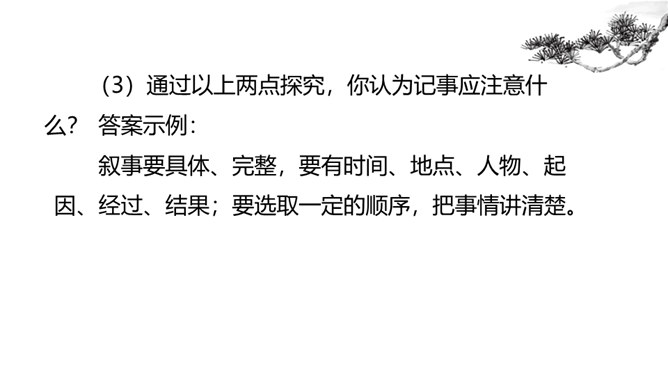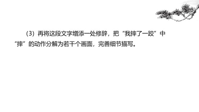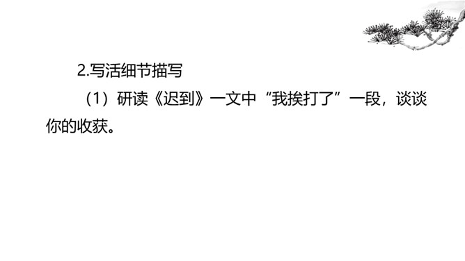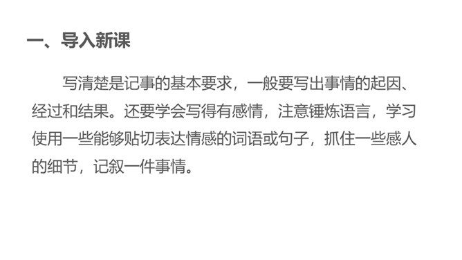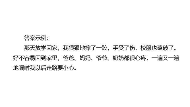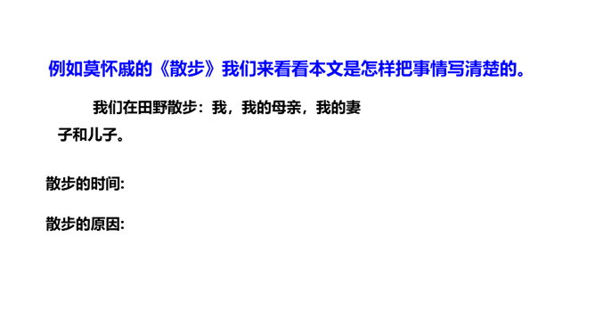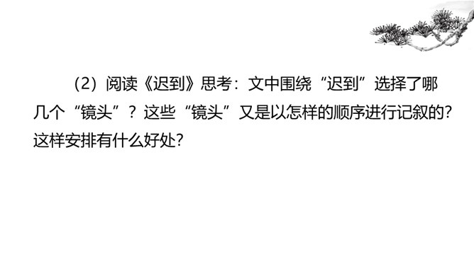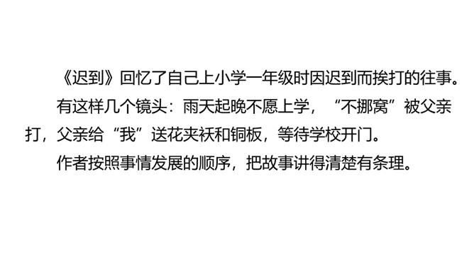 阅读《迟到》思考:文中围绕“迟到”选择了哪几个“镜头”?这些“镜头”又是以怎样的顺序进行记叙的?这样安排有什么好处?回忆了自己上小学一年级时因迟到而挨打的往事。有这样几个镜头:雨天起晚不愿上学,“不挪窝”被父亲打,父亲给“我”送花夹袄和铜板,等待学校开门。作者按照事情发展的顺序,把故事讲得清楚有条理。通过以上两点探究,你认为记事应注意什么?请在下面这段文字的动词前,添加修饰词。所属专题:学会记事ppt。
