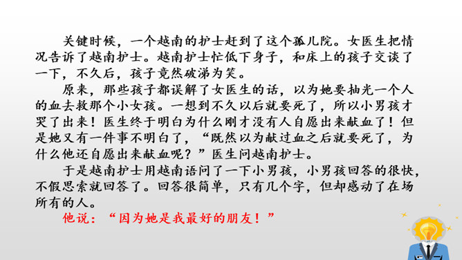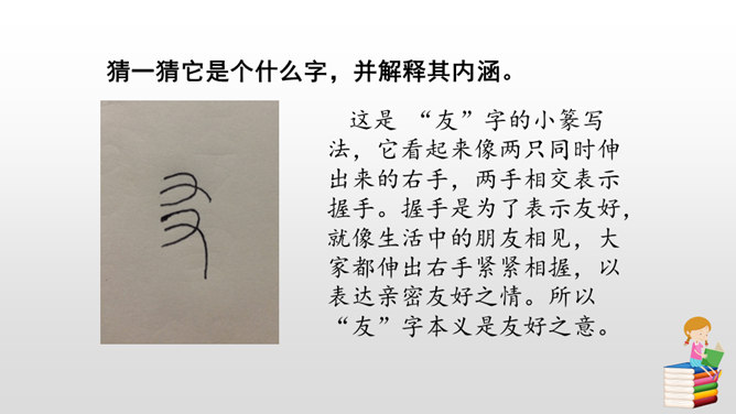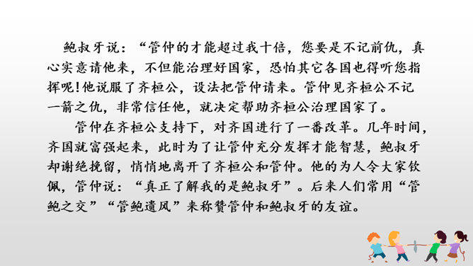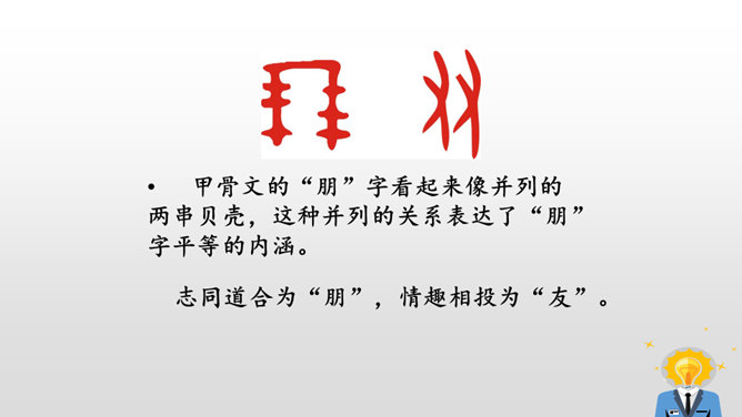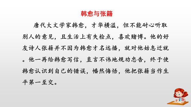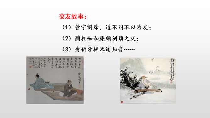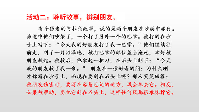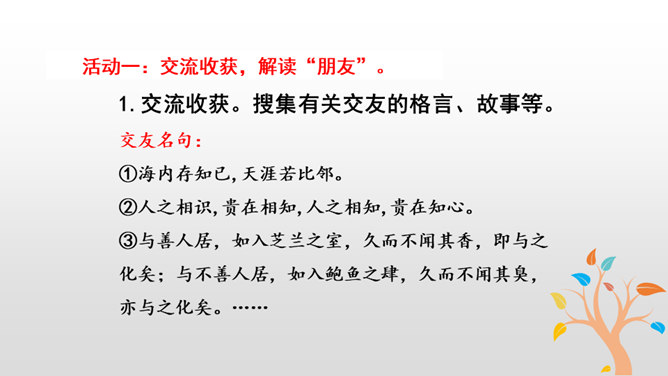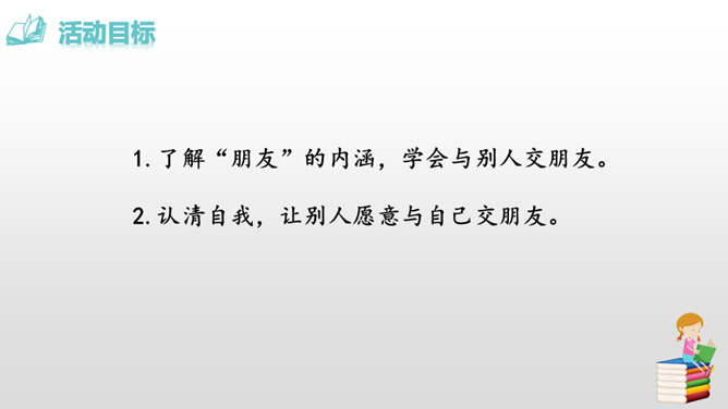 思考:最受欢迎的同学有什么共同的特点?如何让自己成为受欢迎的人?友谊技巧:1.平等互惠,学会体谅朋友的难处,相互给予与分担。2.宽容他人,尊重差异,加强沟通。3.坦诚相待,坚持原则,绝不能以牺牲原则为代价维持所谓的友情。总结:交友看起来很难,但如果你真正明白了“朋友”的真谛,并积极在生活中去实践它,平等而友好地对待身边的同学,想必会有很多同学都愿意与你为友!正所谓,爱人者,人恒爱之;敬人者,人恒敬之。交友之道也就在于此。最后祝大家尽快交到越来越多的好朋友。所属专题:有朋自远方来ppt。