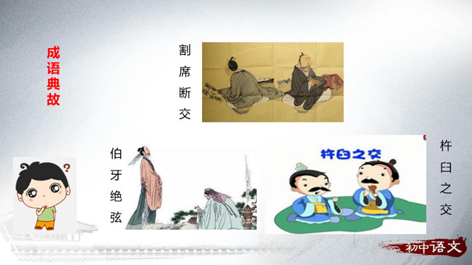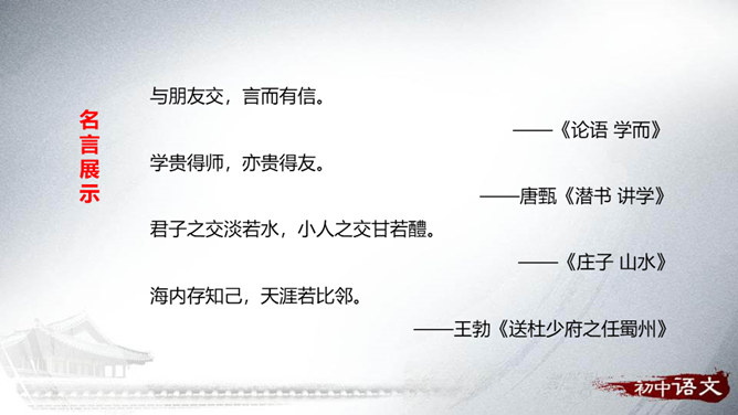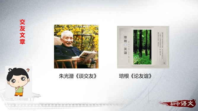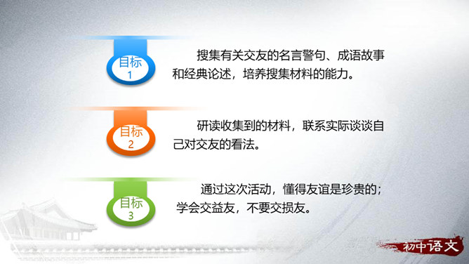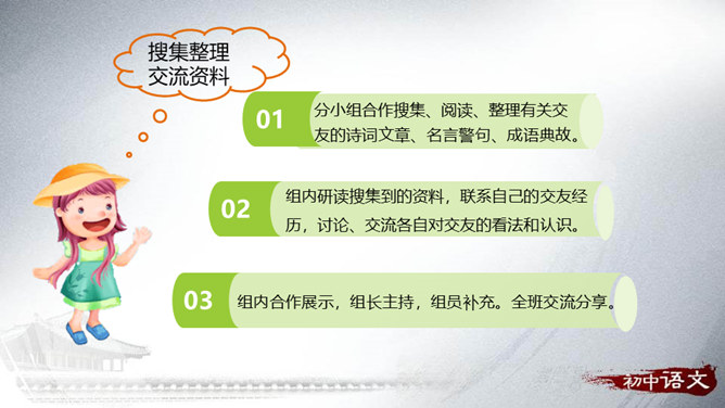 搜集有关交友的名言警句、成语故事和经典论述,培养搜集材料的能力。研读收集到的材料,联系实际谈谈自己对交友的看法。通过这次活动,懂得友谊是珍贵的;学会交益友,不要交损友。分小组合作搜集、阅读、整理有关交友的诗词文章、名言警句、成语典故。组内研读搜集到的资料,联系自己的交友经历,讨论、交流各自对交友的看法和认识。组内合作展示,组长主持,组员补充。全班交流分享。所属专题:有朋自远方来ppt。