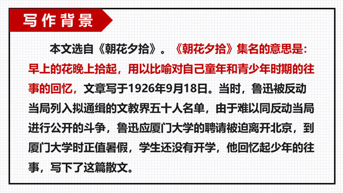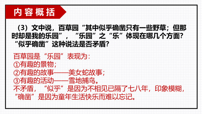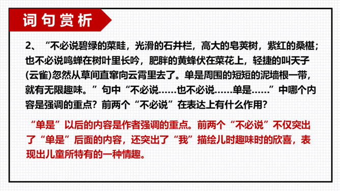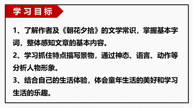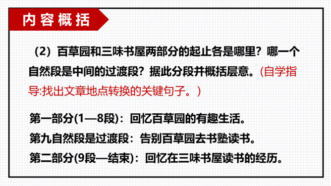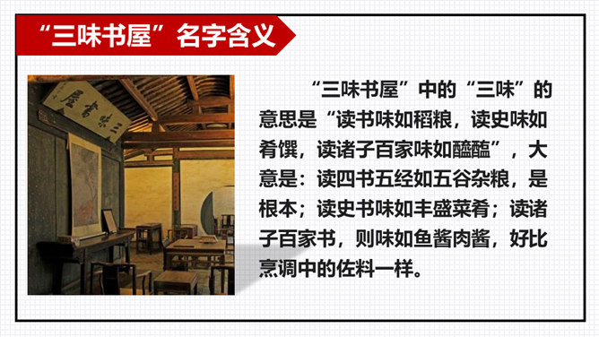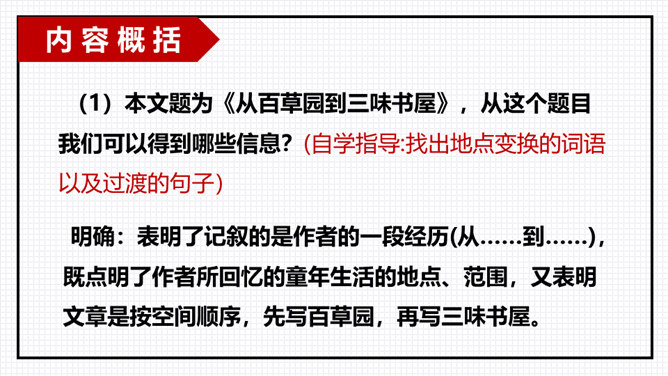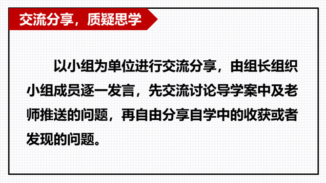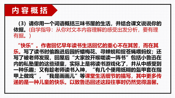 以小组为单位进行交流分享,由组长组织小组成员逐一发言,先交流讨论导学案中及老师推送的问题,再自由分享自学中的收获或者发现的问题。“三味书屋”中的“三味”的意思是“读书味如稻粮,读史味如肴馔,读诸子百家味如醯醢”,大意是:读四书五经如五谷杂粮,是根本;读史书味如丰盛菜肴;读诸子百家书,则味如鱼酱肉酱,好比烹调中的佐料一样。请你用一个词语概括三味书屋的生活,并结合课文说说你的依据。所属专题:从百草园到三味书屋ppt。