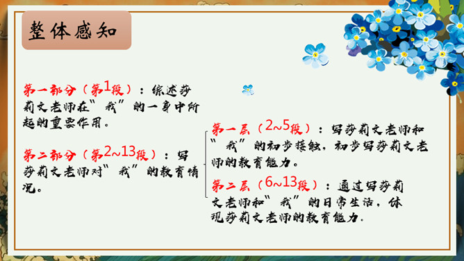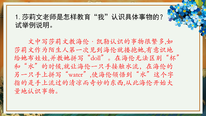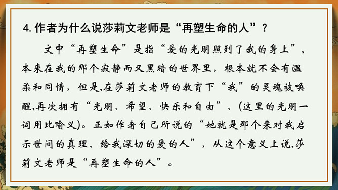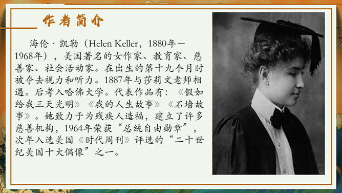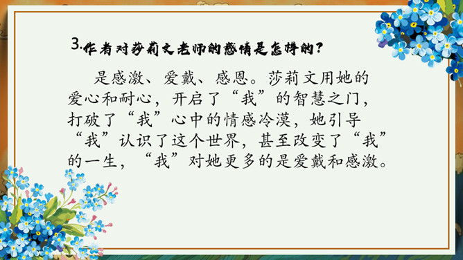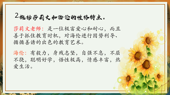 概括莎莉文和海伦的性格特点。莎莉文老师:是一位极富爱心和耐心,而且善于抓住教育时机,对海伦进行因势利导、循循善诱的出色的教育艺术。海伦:有毅力,身残志坚,自强不息,不屈不挠,聪明好学,悟性极高,情感丰富,热爱生活。作者对莎莉文老师的感情是怎样的?是感激、爱戴、感恩。莎莉文用她的爱心和耐心,开启了“我”的智慧之门,打破了“我”心中的情感冷漠,她引导“我”认识了这个世界,甚至改变了“我”的一生,“我”对她更多的是爱戴和感激。所属专题:再塑生命的人ppt。