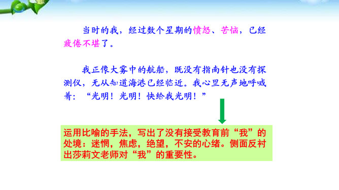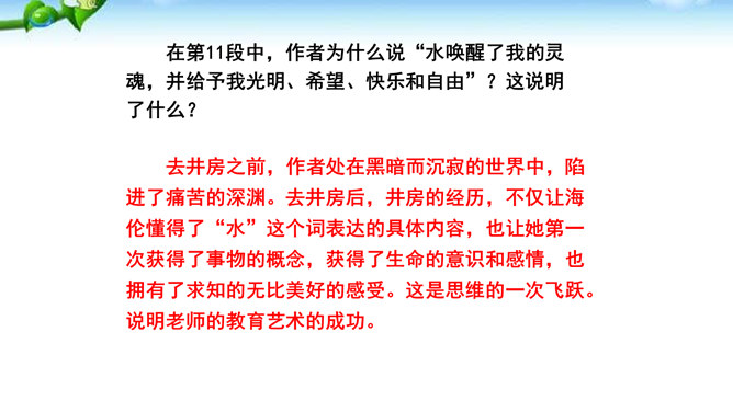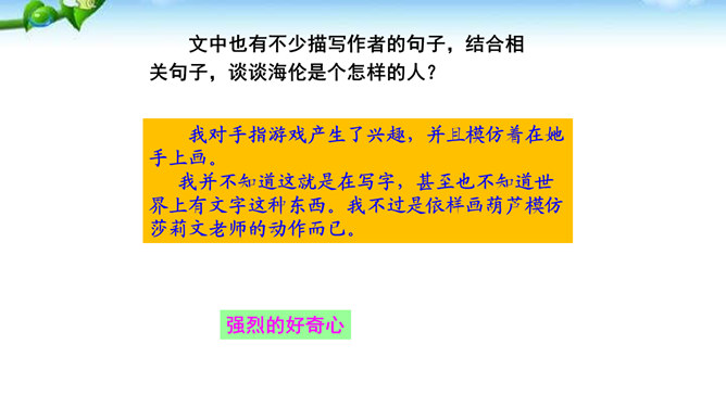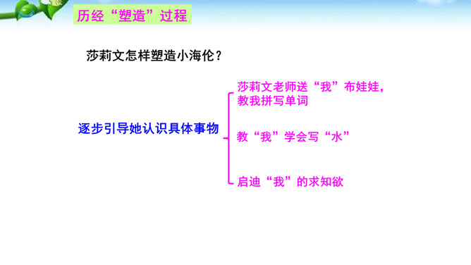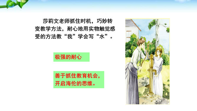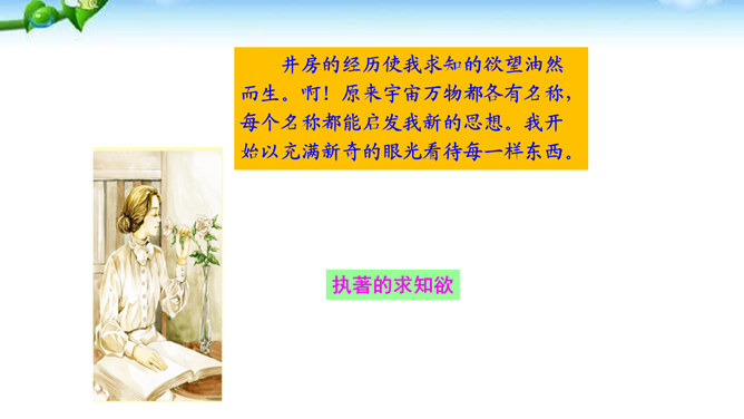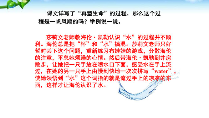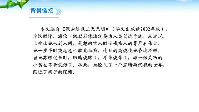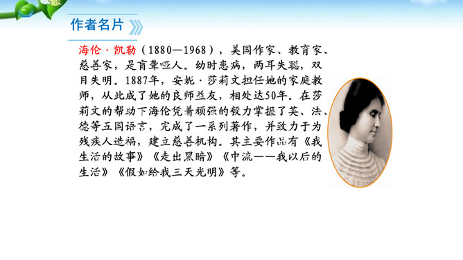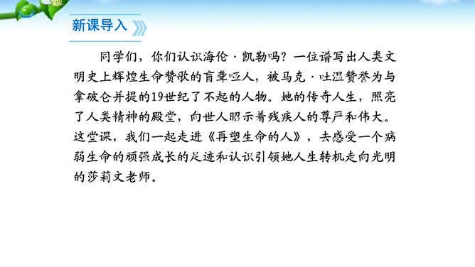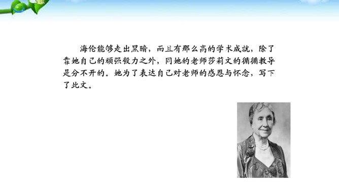 同学们,你们认识海伦·凯勒吗?一位谱写出人类文明史上辉煌生命赞歌的盲聋哑人,被马克·吐温赞誉为与拿破仑并提的19世纪了不起的人物。她的传奇人生,照亮了人类精神的殿堂,向世人昭示着残疾人的尊严和伟大。这堂课,我们一起走进课文,去感受一个病弱生命的顽强成长的足迹和认识引领她人生转机走向光明的莎莉文老师。海伦能够走出黑暗,而且有那么高的学术成就,除了靠她自己的顽强毅力之外,同她的老师莎莉文的循循教导是分不开的。她为了表达自己对老师的感恩与怀念,写下了此文。所属专题:再塑生命的人ppt。