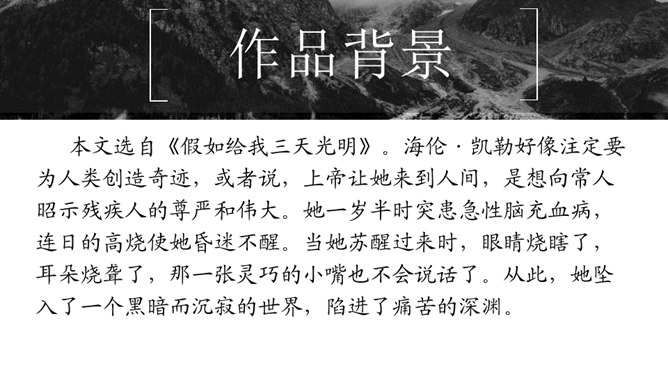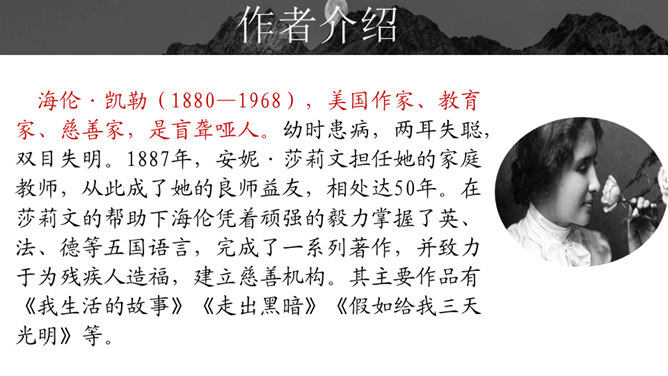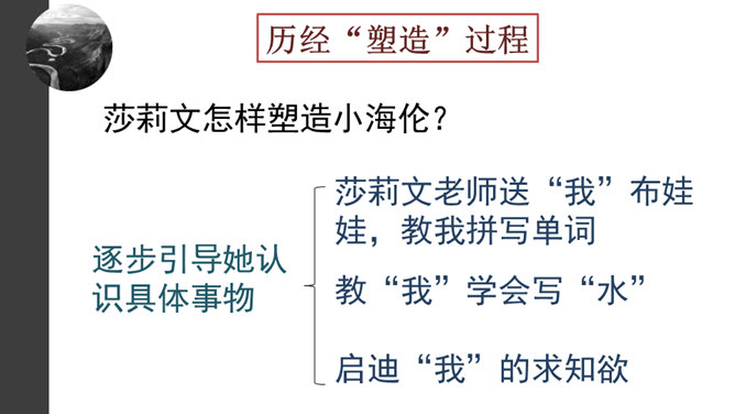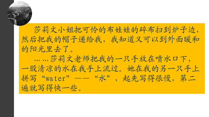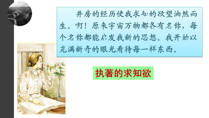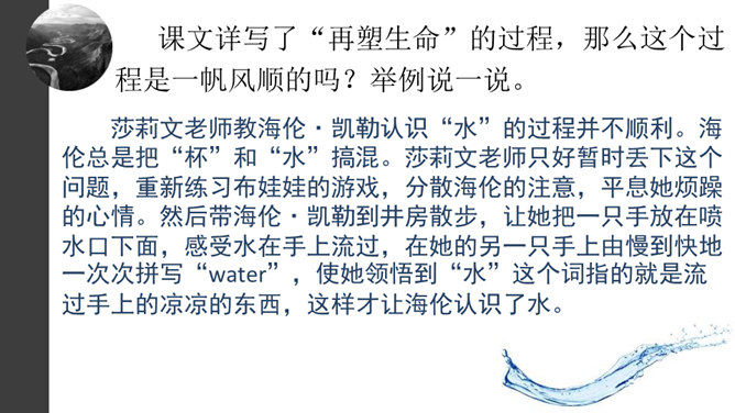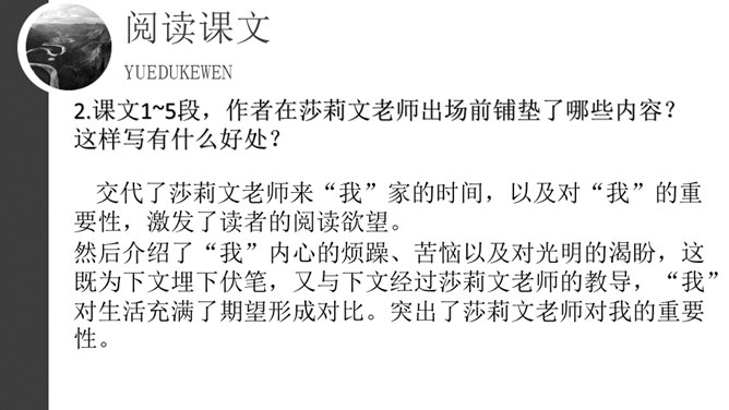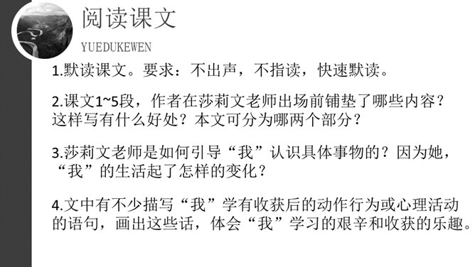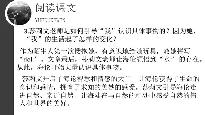 1.默读课文。要求:不出声,不指读,快速默读。2.课文1~5段,作者在莎莉文老师出场前铺垫了哪些内容?这样写有什么好处?本文可分为哪两个部分?3.莎莉文老师是如何引导“我”认识具体事物的?因为她,“我”的生活起了怎样的变化?4.文中有不少描写“我”学有收获后的动作行为或心理活动的语句,画出这些话,体会“我”学习的艰辛和收获的乐趣。课文1~5段,作者在莎莉文老师出场前铺垫了哪些内容?这样写有什么好处?所属专题:再塑生命的人ppt。