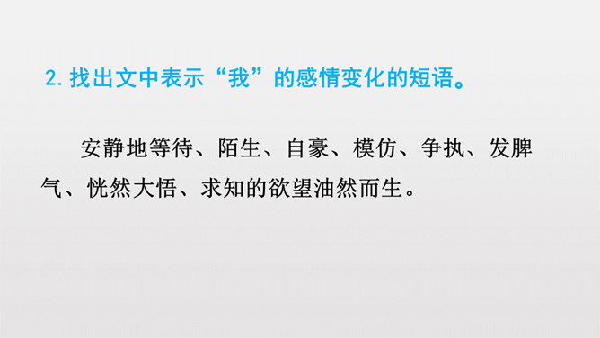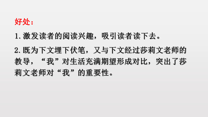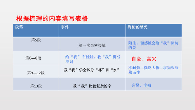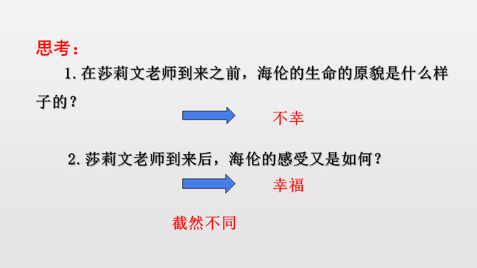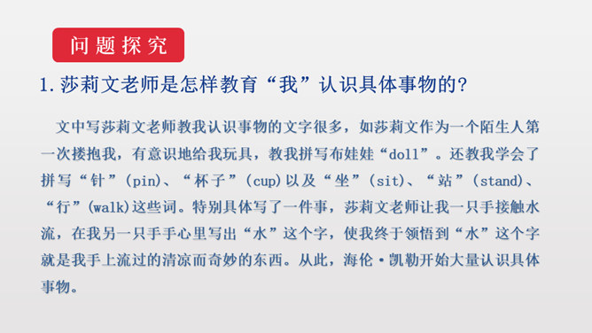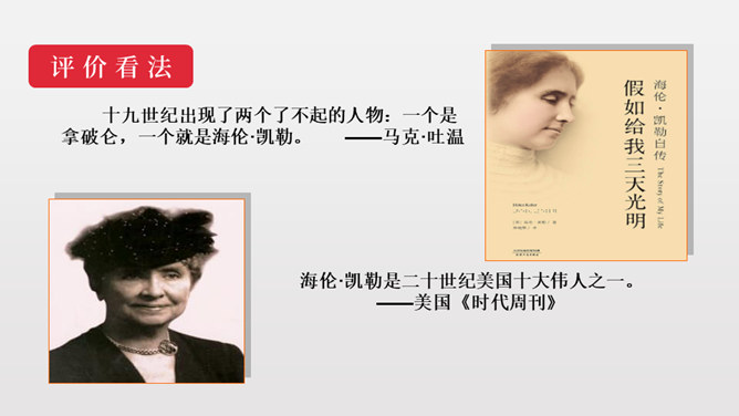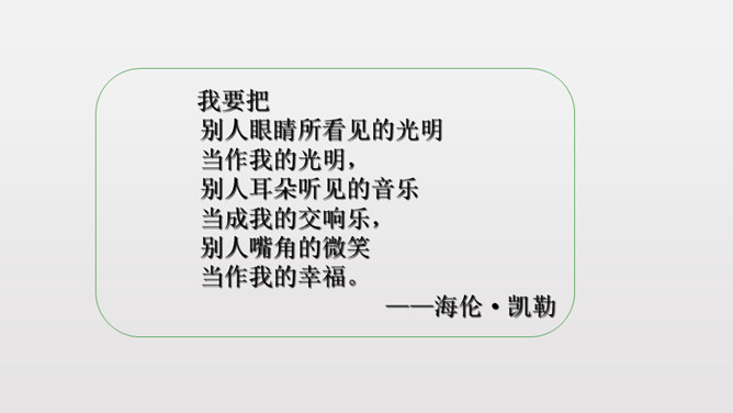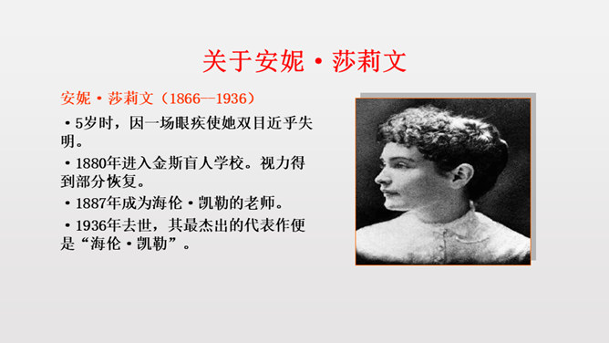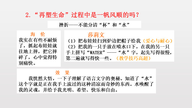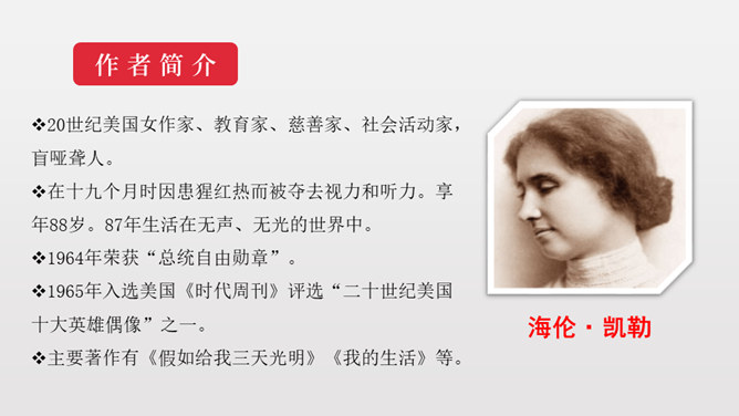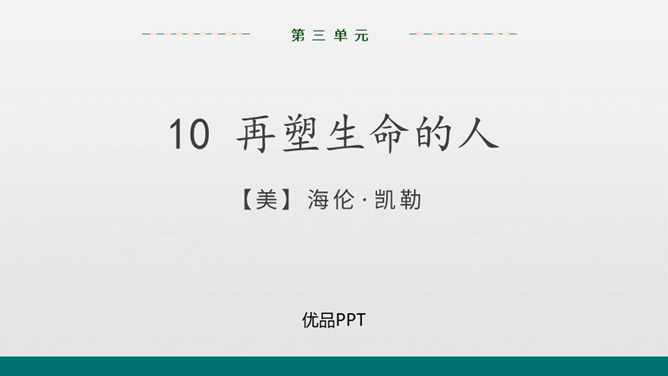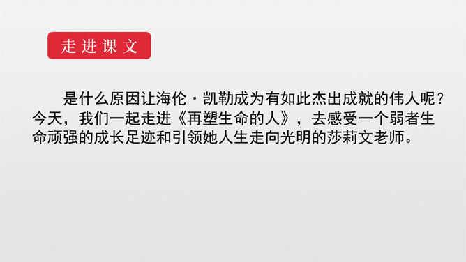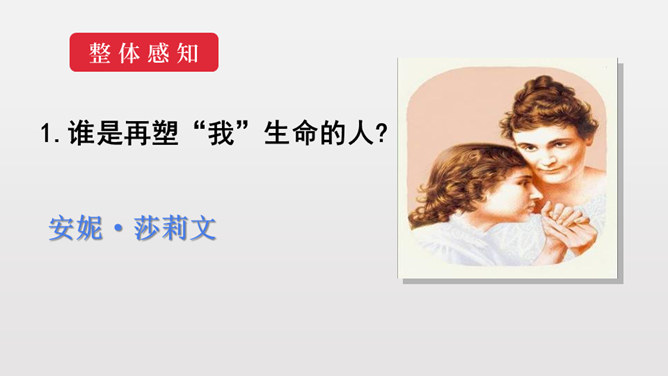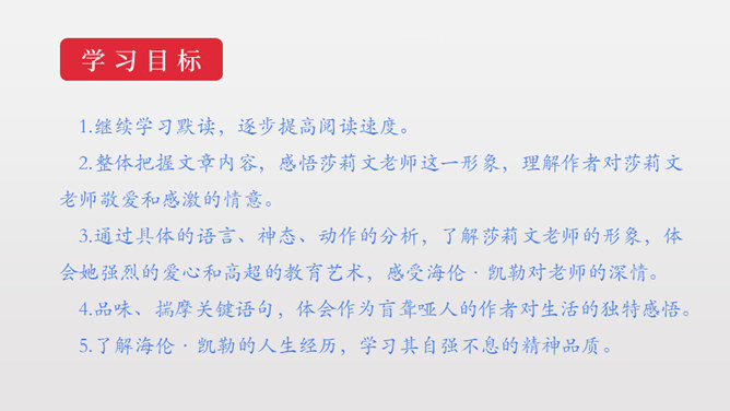 1.继续学习默读,逐步提高阅读速度。2.整体把握文章内容,感悟莎莉文老师这一形象,理解作者对莎莉文老师敬爱和感激的情意。3.通过具体的语言、神态、动作的分析,了解莎莉文老师的形象,体会她强烈的爱心和高超的教育艺术,感受海伦·凯勒对老师的深情。4.品味、揣摩关键语句,体会作为盲聋哑人的作者对生活的独特感悟。5.了解海伦·凯勒的人生经历,学习其自强不息的精神品质。所属专题:再塑生命的人ppt。