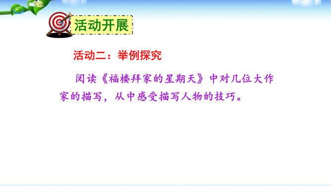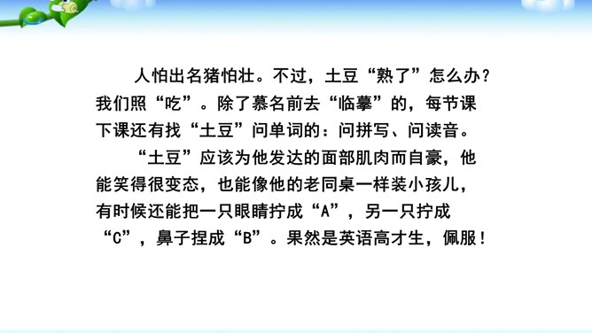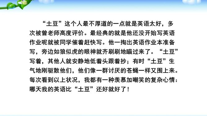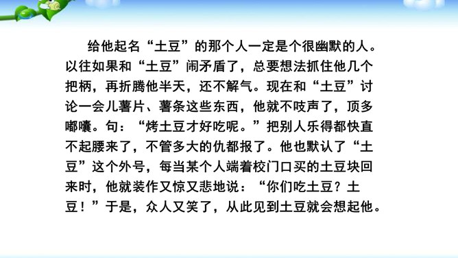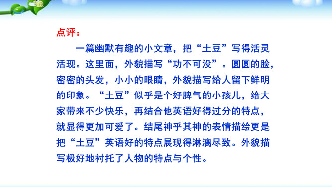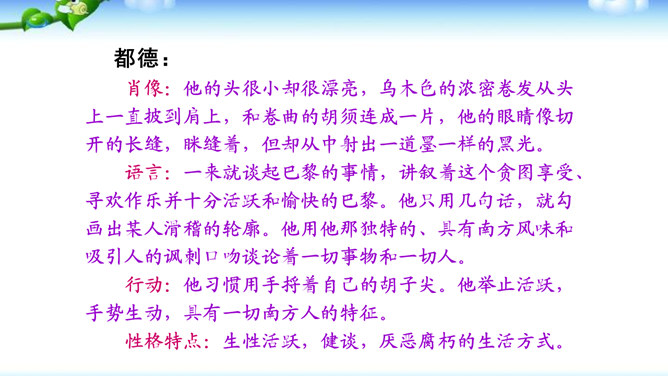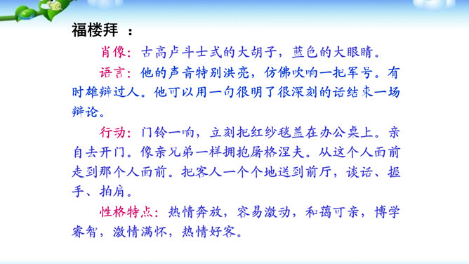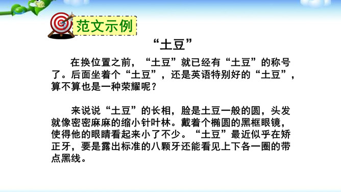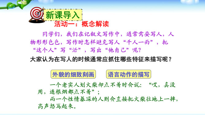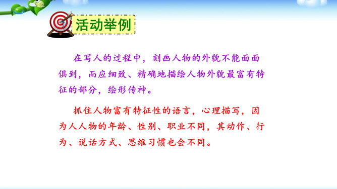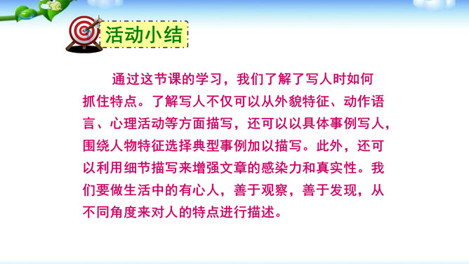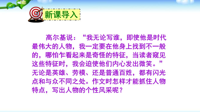 高尔基说:“我无论写谁,即使他是时代最伟大的人物,我一定要在他身上找到不一般的,哪怕乍看起来是奇怪的特征,当读者窥见这些特征时,我会迫使他们内心发出微笑。”无论是英雄、劳模、还是普通百姓,都有闪光点和与众不同之处。作文时怎样才能抓住人物特点,写出人物的个性风采呢?同学们,我们在记叙文写作中,通常需要写人,人物形形色色,写作时怎样避免写人“千人一面”,把“这个人”写“活”,写出“他自己”呢?所属专题:写人要抓住特点ppt。