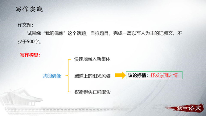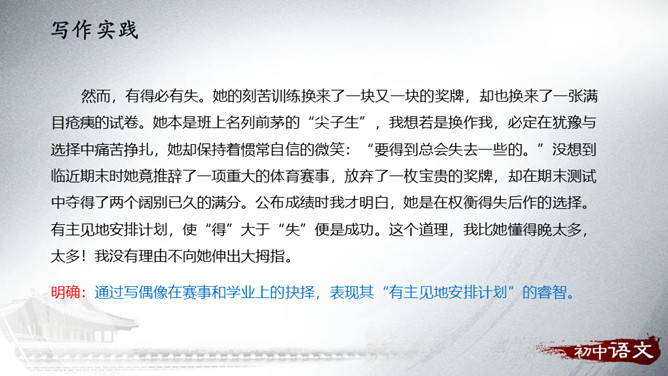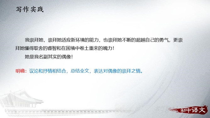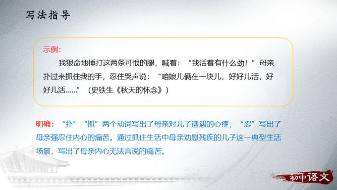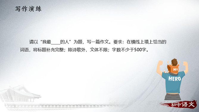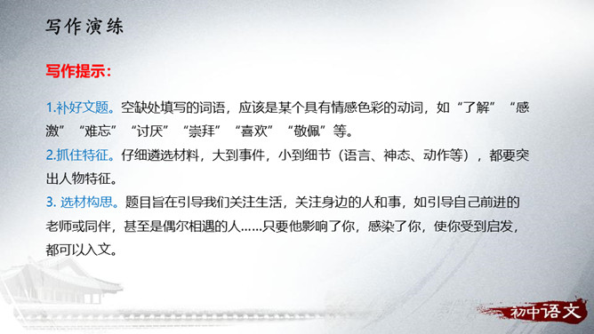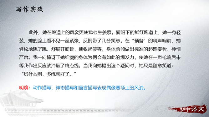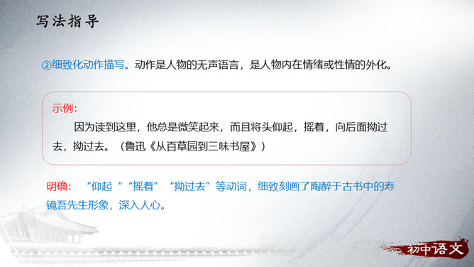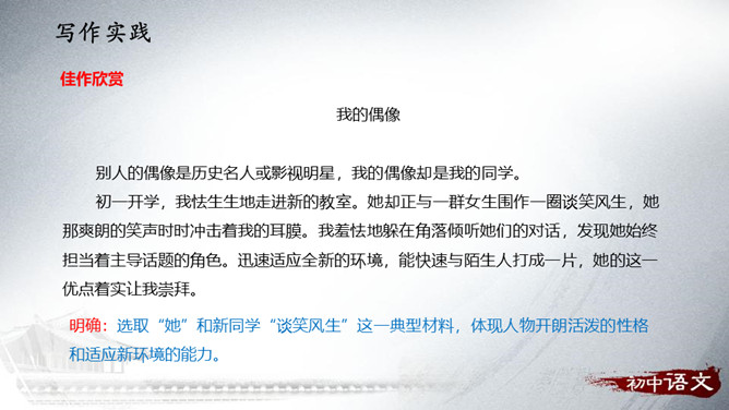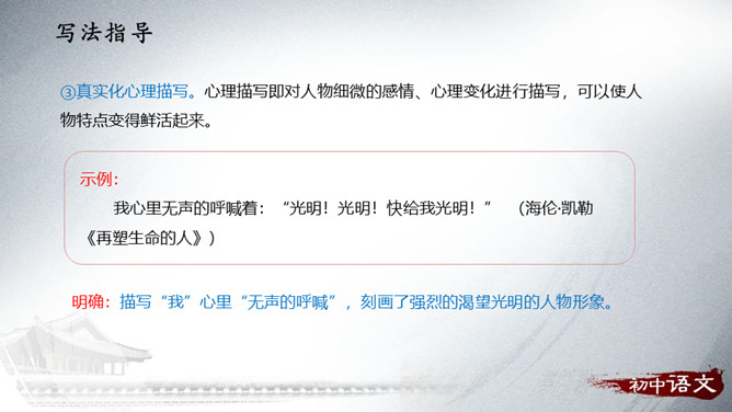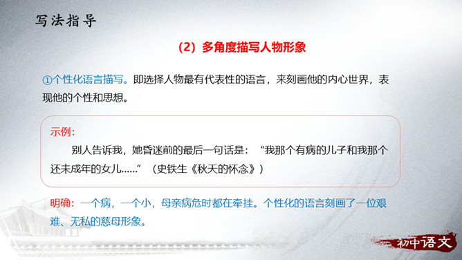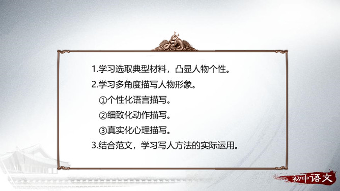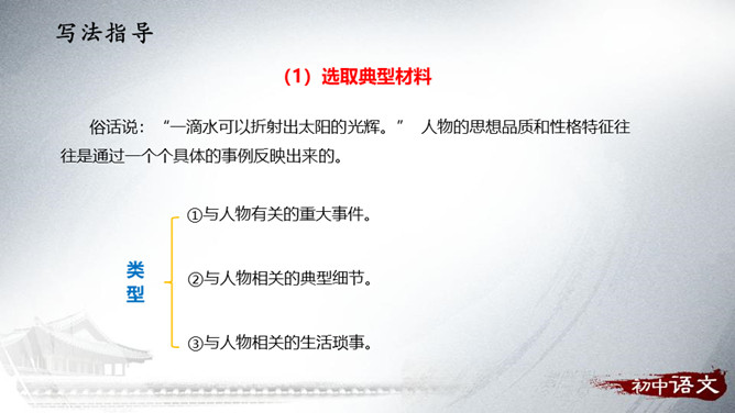 1.学习选取典型材料,凸显人物个性。2.学习多角度描写人物形象。①个性化语言描写。即选择人物最有代表性的语言,来刻画他的内心世界,表现他的个性和思想。②细致化动作描写。动作是人物的无声语言,是人物内在情绪或性情的外化。③真实化心理描写。心理描写即对人物细微的感情、心理变化进行描写,可以使人物特点变得鲜活起来。3.结合范文,学习写人方法的实际运用。俗话说:“一滴水可以折射出太阳的光辉。” 人物的思想品质和性格特征往往是通过一个个具体的事例反映出来的。所属专题:写人要抓住特点ppt。