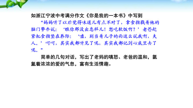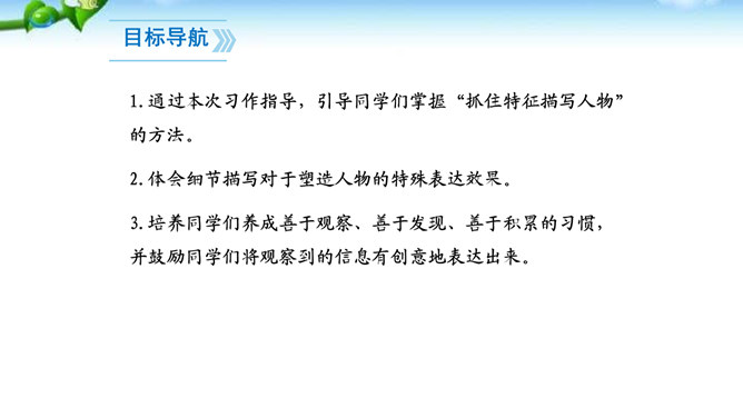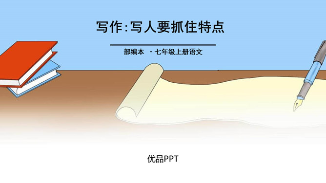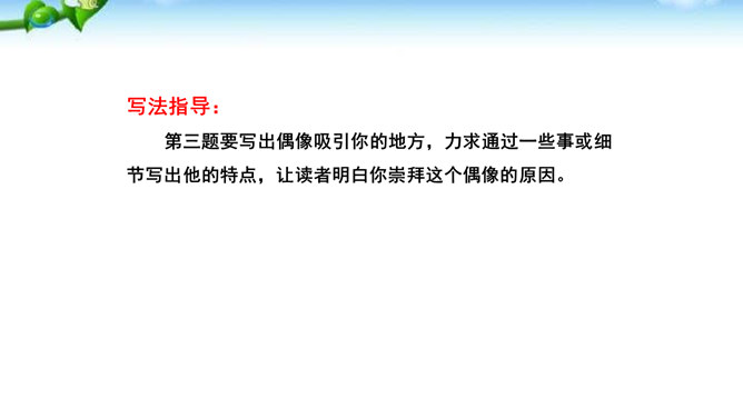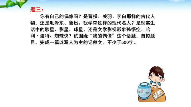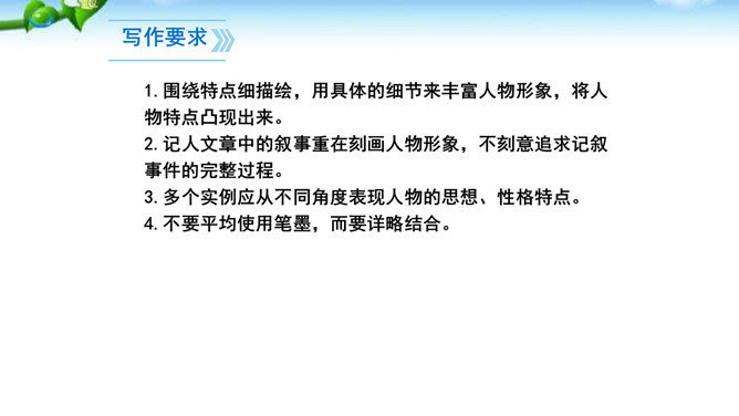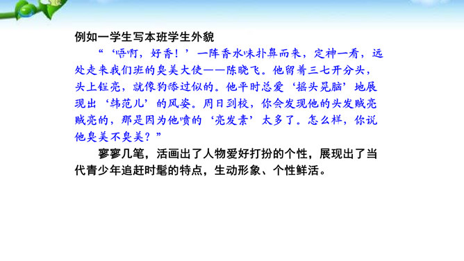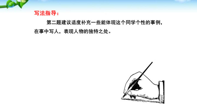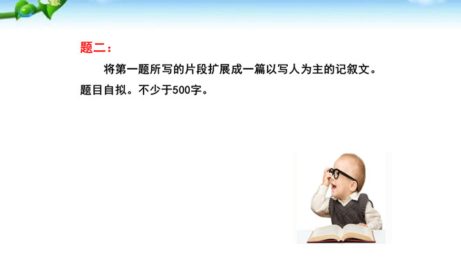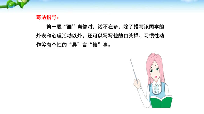 题一:片段写作。从班上选择你熟悉的一个同学,用200字左右给他“画”一幅肖像。写好后,读给同学们听,看看他们能否猜出你写的是谁。如果被很多同学猜中了,那就说明你写得很棒!写法指导:第一题“画”肖像时,话不在多,除了描写该同学的外表和心理活动以外,还可以写写他的口头禅、习惯性动作等有个性的“异”言“糗”事。题二:将第一题所写的片段扩展成一篇以写人为主的记叙文。题目自拟。不少于500字。所属专题:写人要抓住特点ppt。
