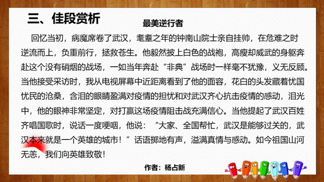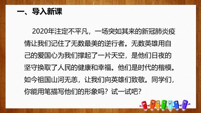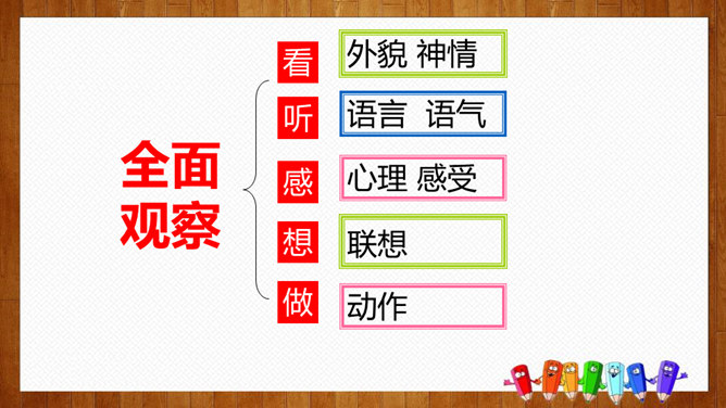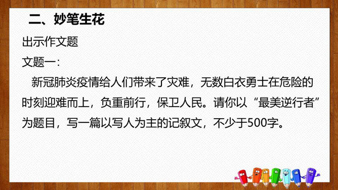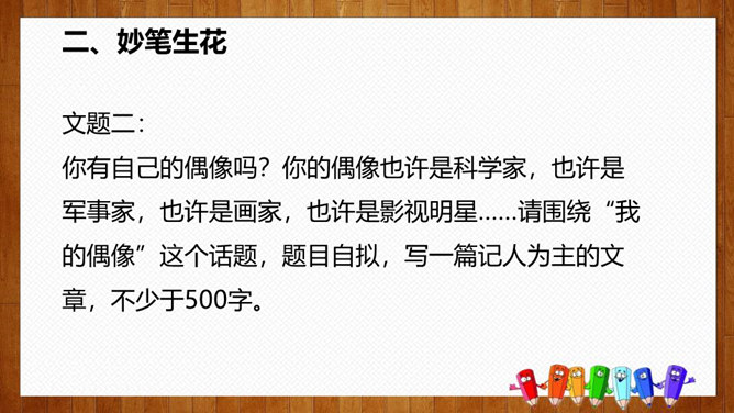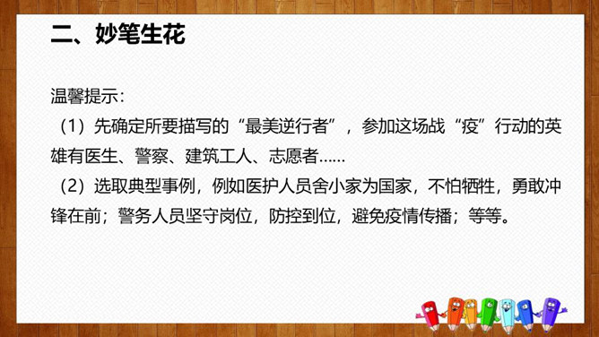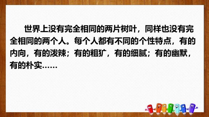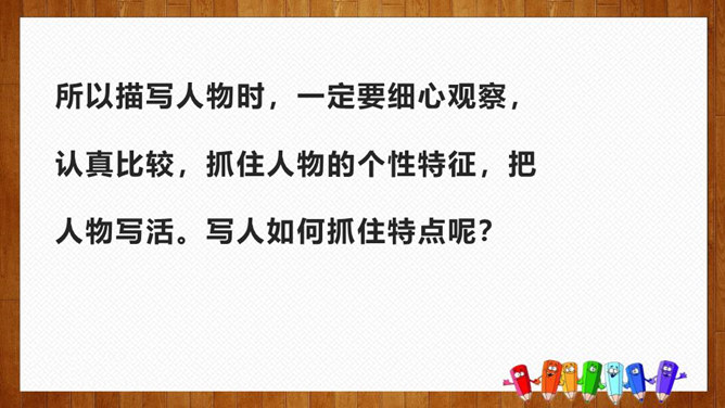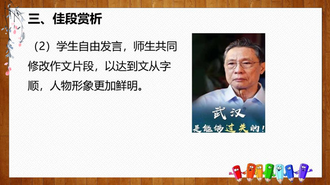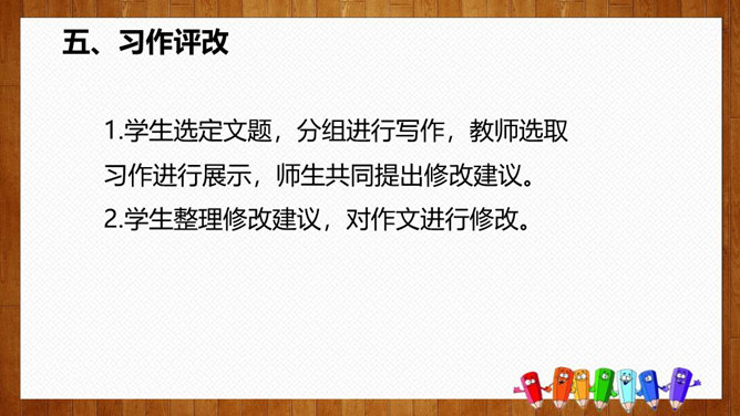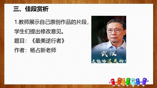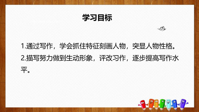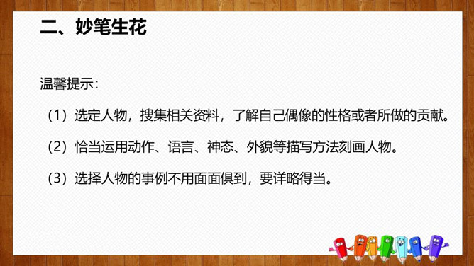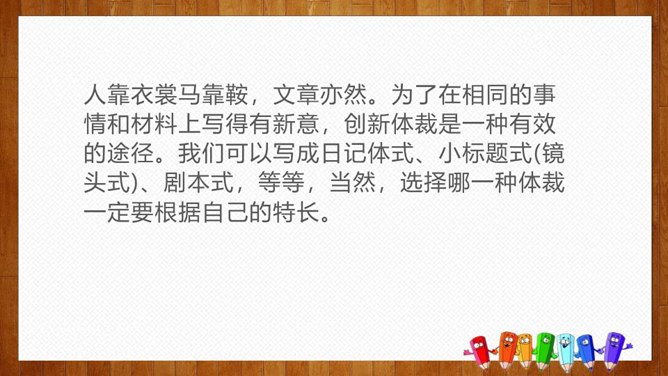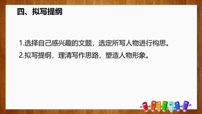 1.选择自己感兴趣的文题,选定所写人物进行构思。2.拟写提纲,理清写作思路,塑造人物形象。靠衣裳马靠鞍,文章亦然。为了在相同的事情和材料上写得有新意,创新体裁是一种有效的途径。我们可以写成日记体式、小标题式(镜头式)、剧本式,等等,当然,选择哪一种体裁一定要根据自己的特长。1.学生选定文题,分组进行写作,教师选取习作进行展示,师生共同提出修改建议。2.学生整理修改建议,对作文进行修改。所属专题:写人要抓住特点ppt。