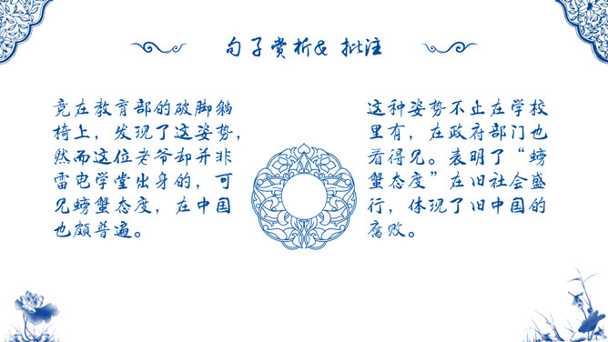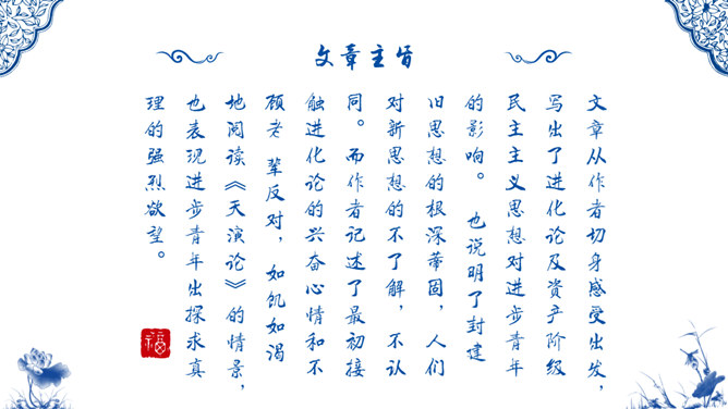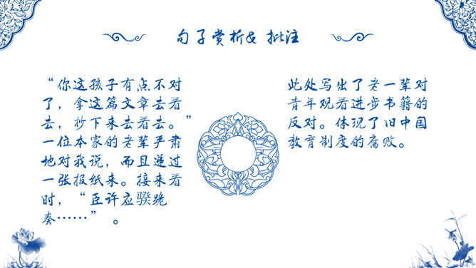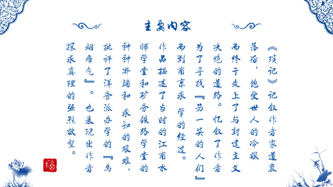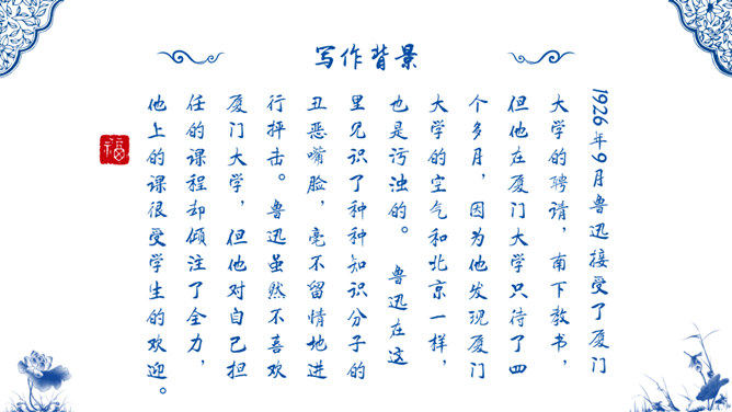 1926年9月鲁迅接受了厦门大学的聘请,南下教书,但他在厦门大学只待了四个多月,因为他发现厦门大学的空气和北京一样,也是污浊的。 鲁迅在这里见识了种种知识分子的丑恶嘴脸,毫不留情地进行抨击。鲁迅虽然不喜欢厦门大学,但他对自己担任的课程却倾注了全力,他上的课很受学生的欢迎。《琐记》记叙作者家道衰落后,饱受世人的冷眼 而终于走上了与封建主义决绝的道路。忆叙了作者为了寻找“另一类的人们”而到南京求 学的经过。作品描述了当时的江南水师学堂和矿务铁路学堂的种种弊端和 求知的艰难,批评了洋务派办学的“乌烟瘴气”。所属专题:朝花夕拾:消除与经典的隔膜ppt。