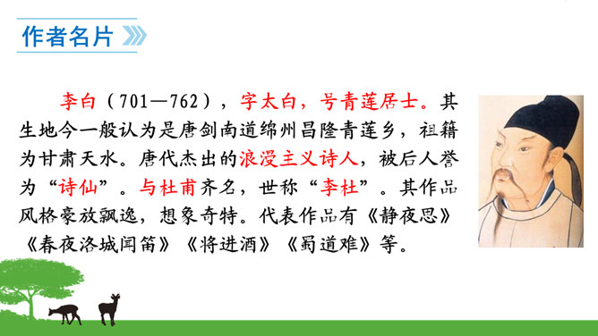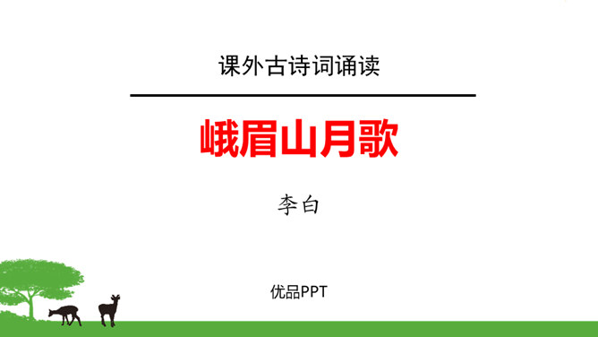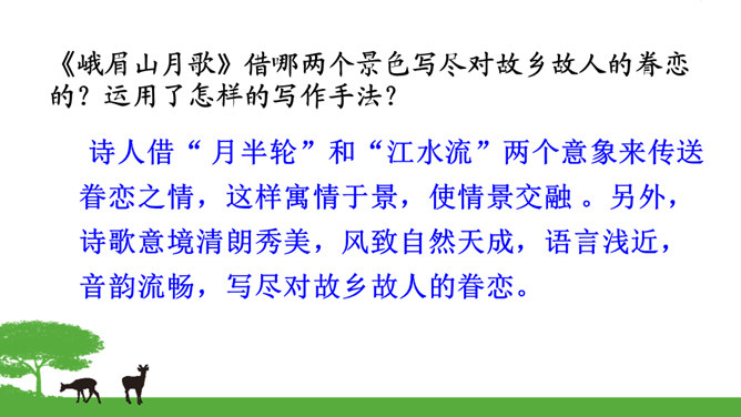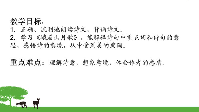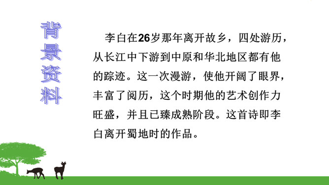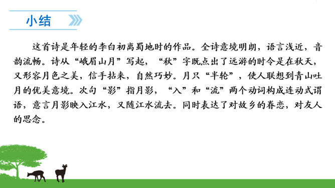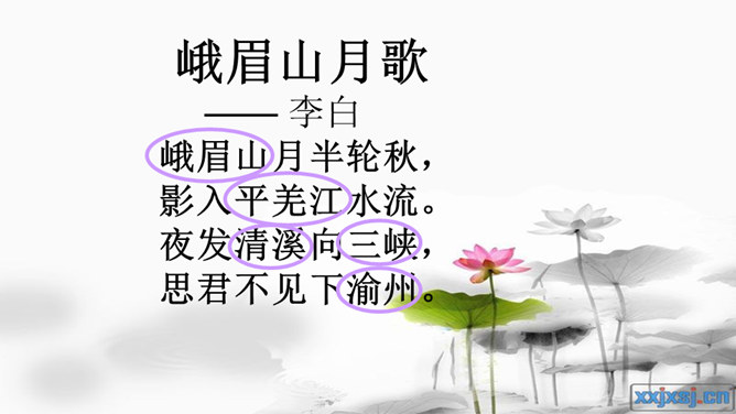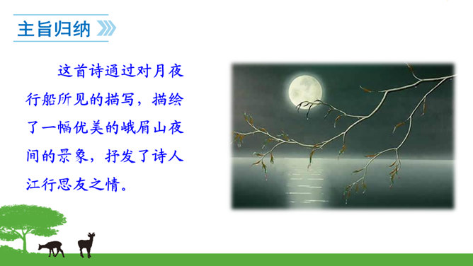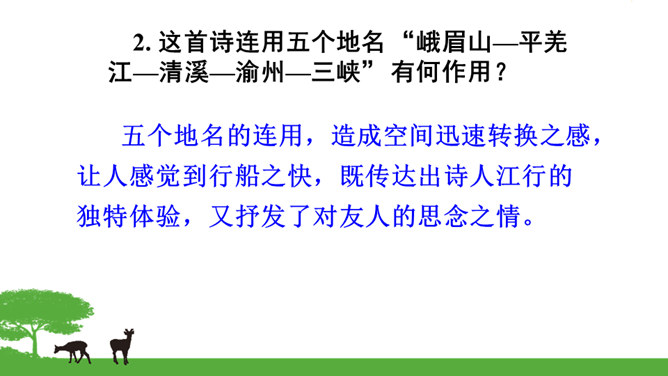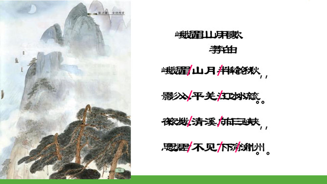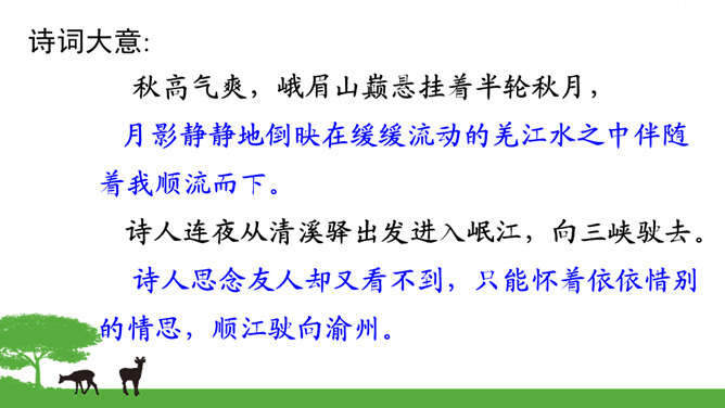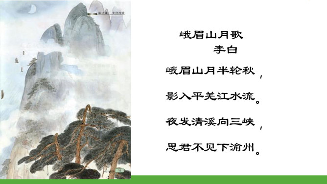 教学目标:1.正确、流利地朗读诗文,背诵诗文。2.能解释诗句中重点词和诗句的意思,感悟诗的意境,从中受到美的熏陶。重点难点:理解诗意,想象意境,体会作者的感情。读这首诗,你看看,这首诗应该怎么划停顿和重音呢?这首诗连用五个地名 “峨眉山—平羌江—清溪—渝州—三峡” 有何作用?五个地名的连用,造成空间迅速转换之感,让人感觉到行船之快,既传达出诗人江行的独特体验,又抒发了对友人的思念之情。所属专题:峨眉山月歌ppt。