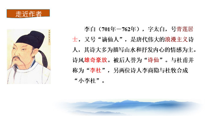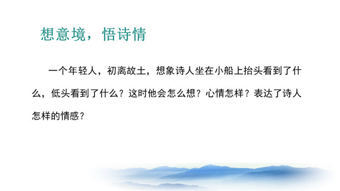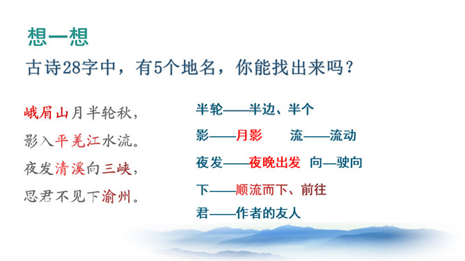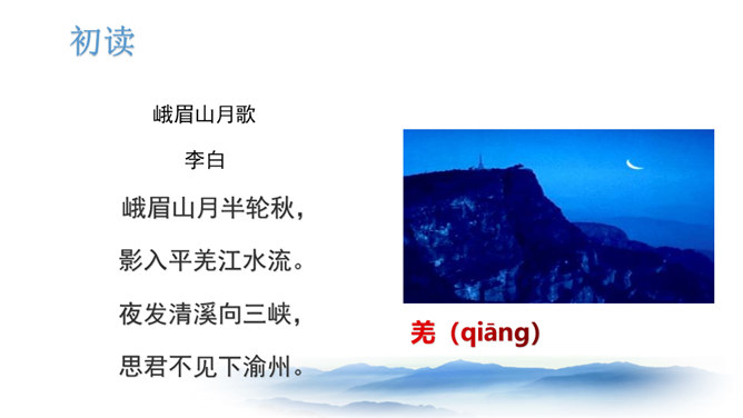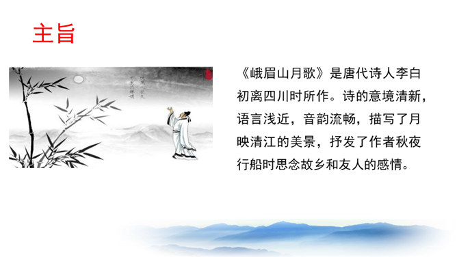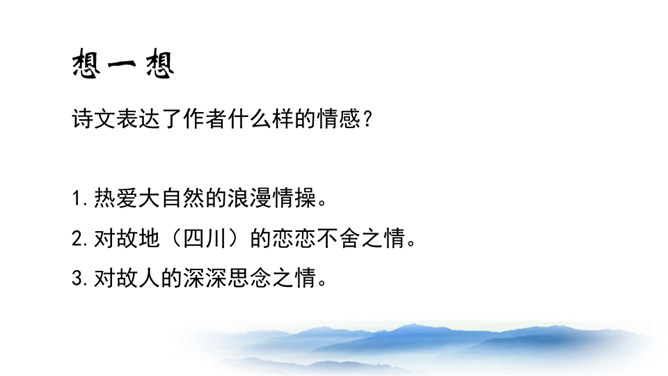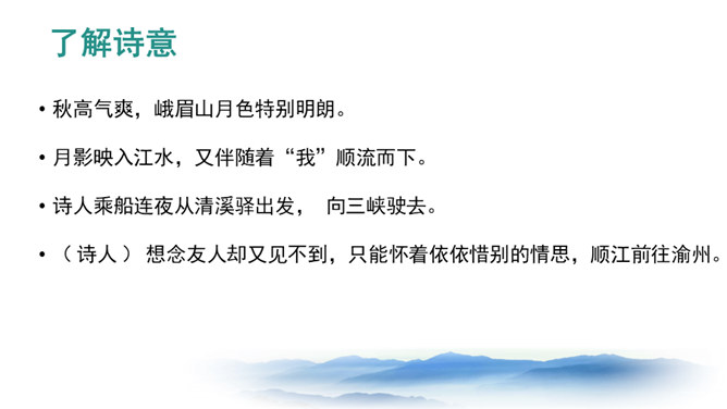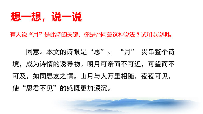 一个年轻人,初离故土,想象诗人坐在小船上抬头看到了什么,低头看到了什么?这时他会怎么想?心情怎样?表达了诗人怎样的情感?有人说“月”是此诗的关键,你是否同意这种说法?试加以说明。同意。本文的诗眼是“思”。 “月” 贯串整个诗境,成为诗情的诱导物。明月可亲而不可近,可望而不可及,如同思友之情。山月与人万里相随,夜夜可见,使“思君不见”的感慨更加深沉。诗文表达了作者什么样的情感?所属专题:峨眉山月歌ppt。