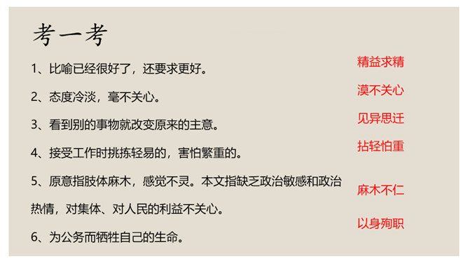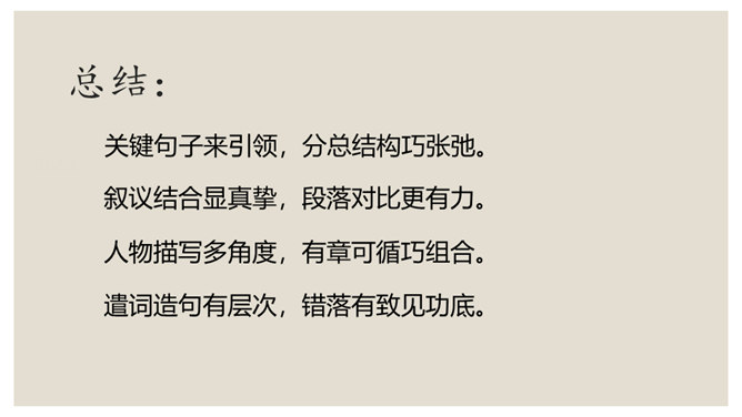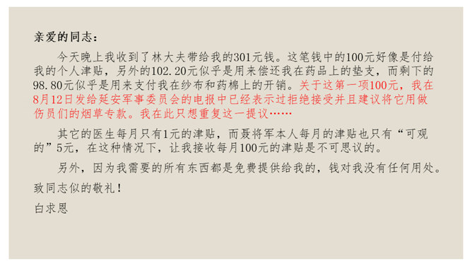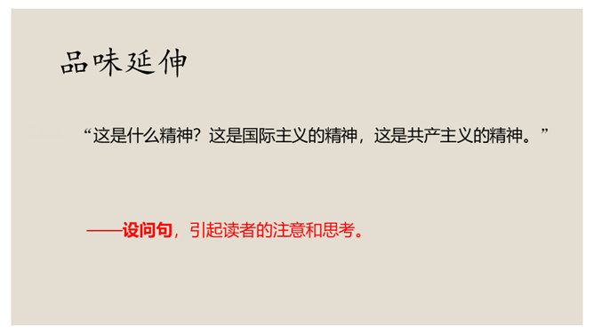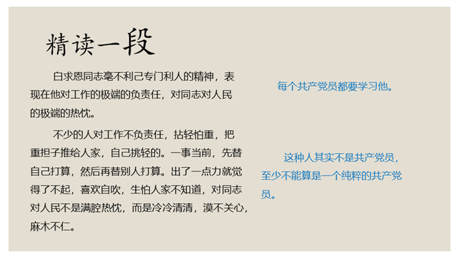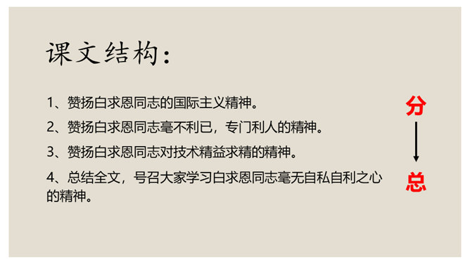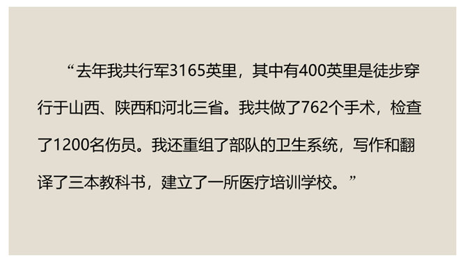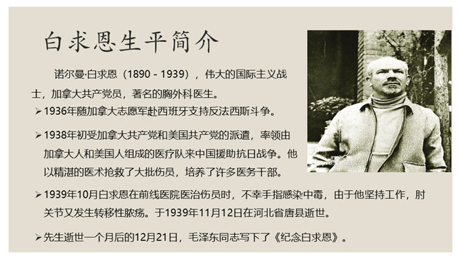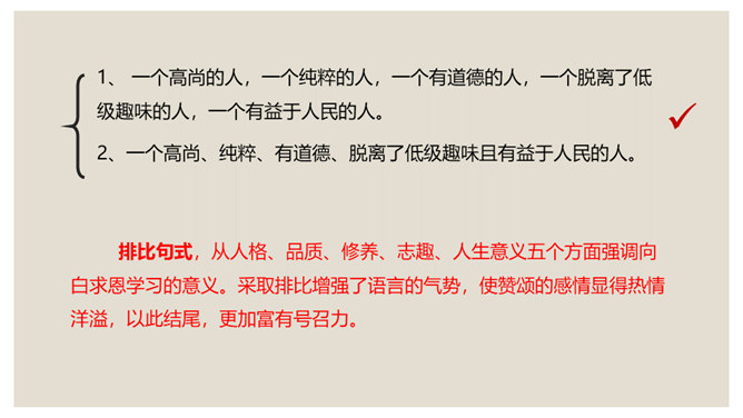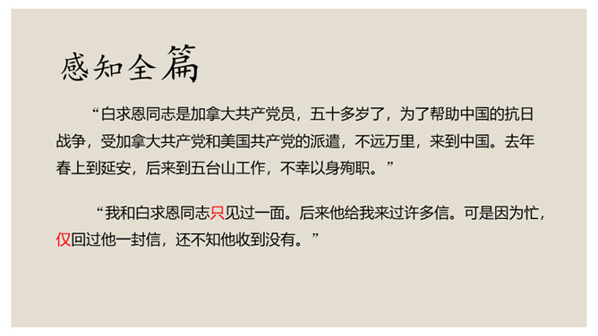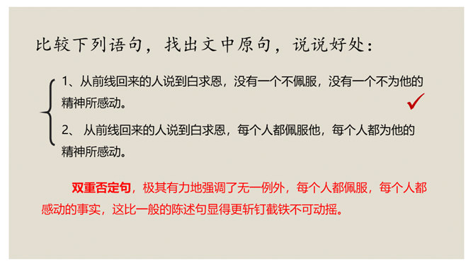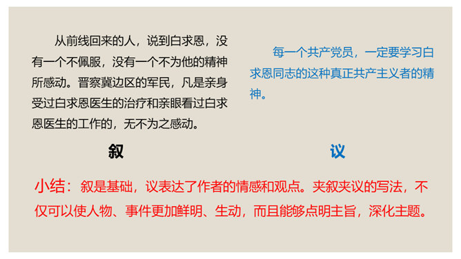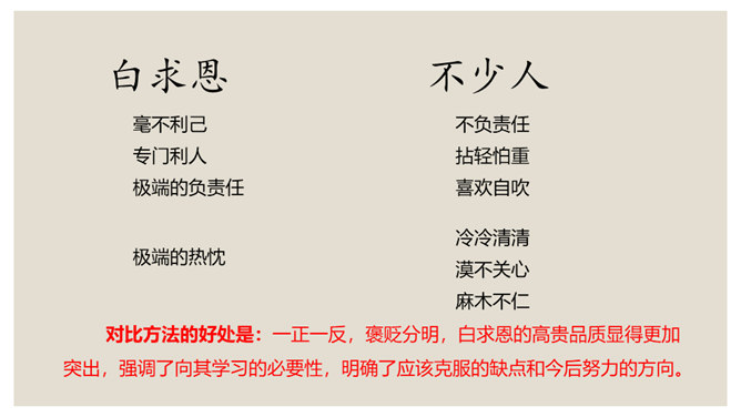 叙是基础,议表达了作者的情感和观点。夹叙夹议的写法,不仅可以使人物、事件更加鲜明、生动,而且能够点明主旨,深化主题。对比方法的好处是:一正一反,褒贬分明,白求恩的高贵品质显得更加突出,强调了向其学习的必要性,明确了应该克服的缺点和今后努力的方向。侧面介绍是为了补充正面介绍的不足,通过别人的眼光来写,增强了事实的可信度,强化了文章的表达效果。双重否定句,极其有力地强调了无一例外,每个人都佩服,每个人都感动的事实,这比一般的陈述句显得更斩钉截铁不可动摇。所属专题:纪念白求恩ppt。