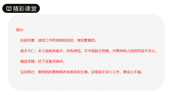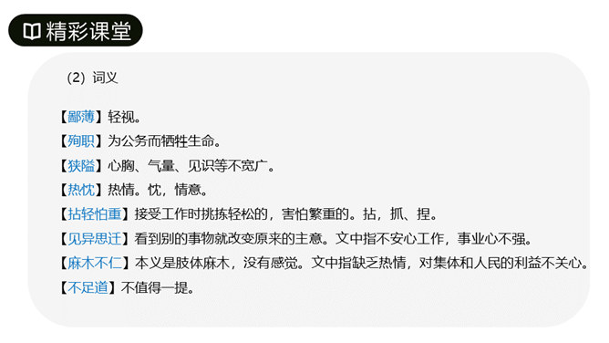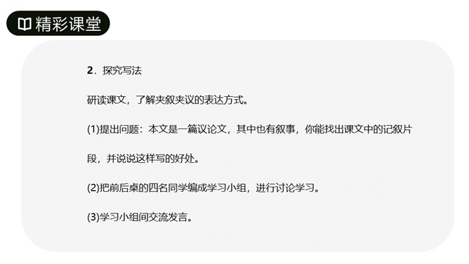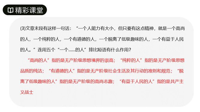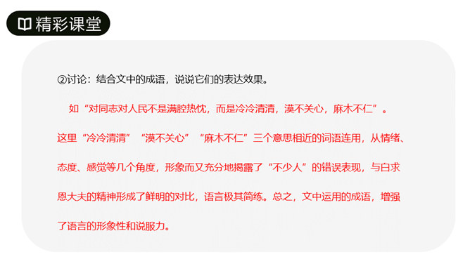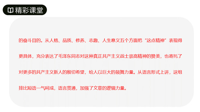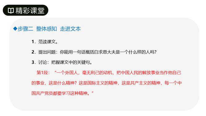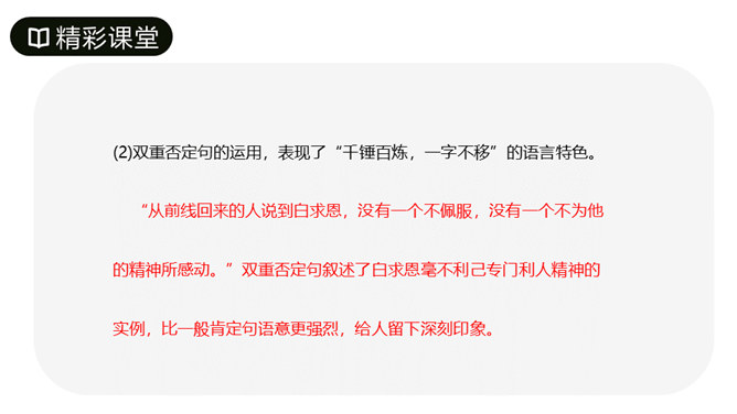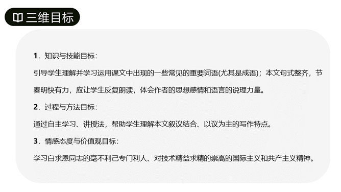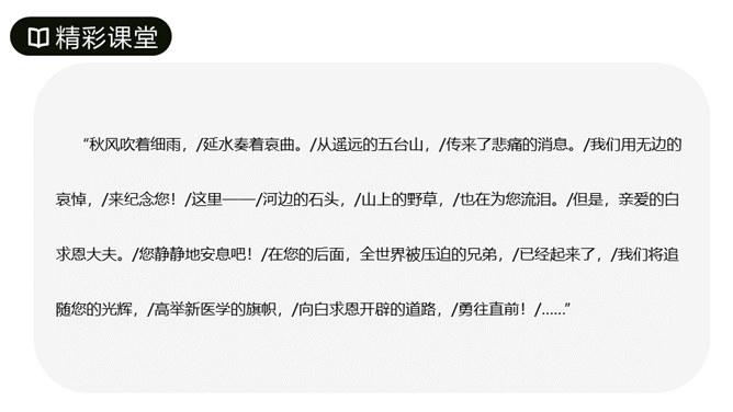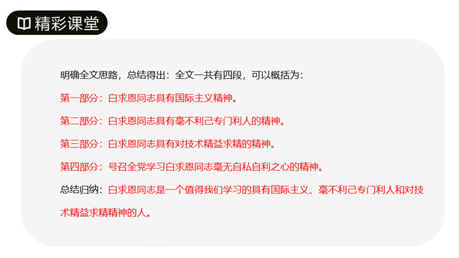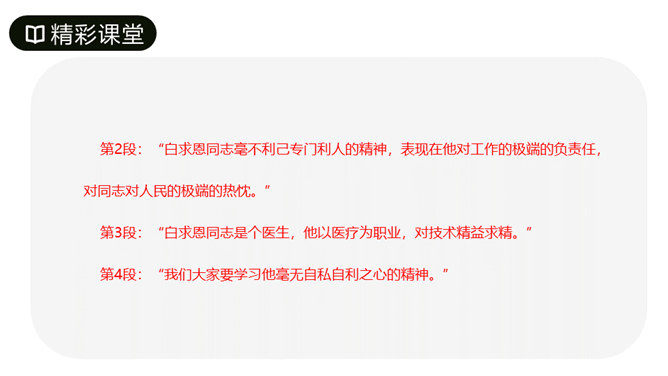 第1段先叙后议,叙白求恩的事迹,议他的国际主义精神。“白求恩同志是加拿大共产党员,五十多岁了,为了帮助中国的抗日战争,不幸以身殉职。”这一层概述了白求恩的政治面貌、年龄、受谁派遣、来华目的、路程、工作简历;让人们对白求恩同志的生平有所了解。从“一个外国人,毫无利己的动机”到这段结束,全属议论,揭示出白求恩同志的精神实质,透辟地论述了国际主义的内容,并指出我们也要实践列宁主义路线。第2段先议后叙,议白求恩毫不利己专门利人的精神,叙从前线回来的人及接受过白求恩治疗或亲眼见过白求恩治疗的人的所见所闻。所属专题:纪念白求恩ppt。