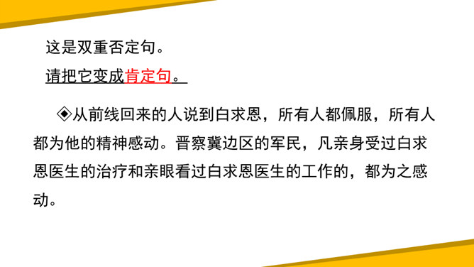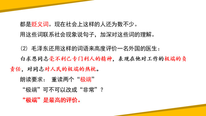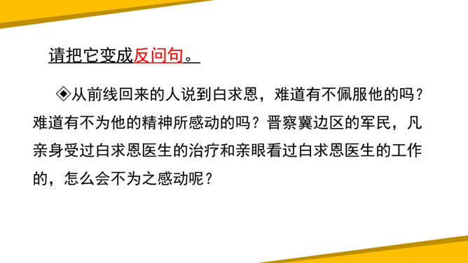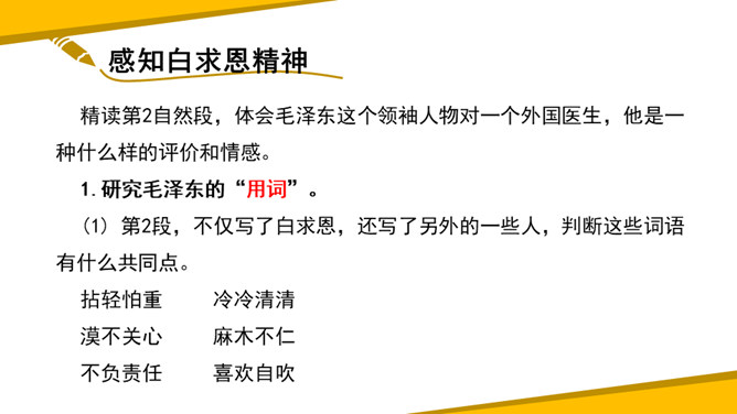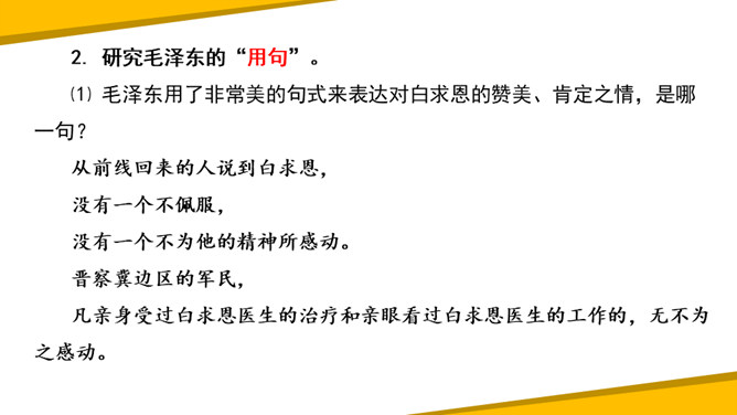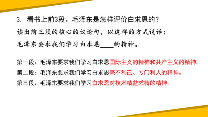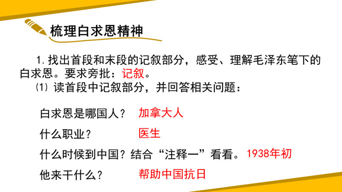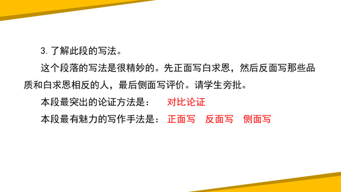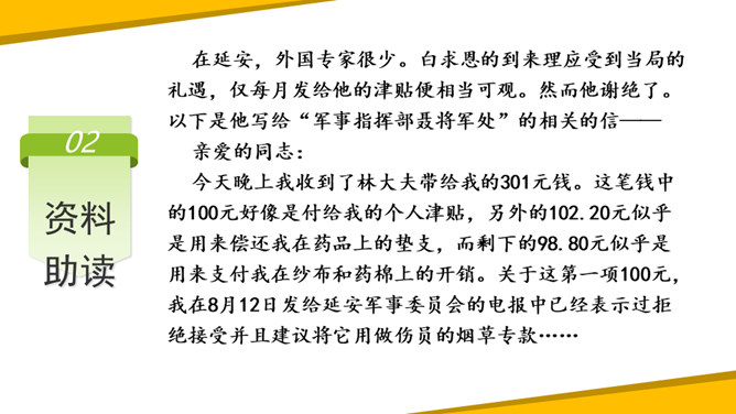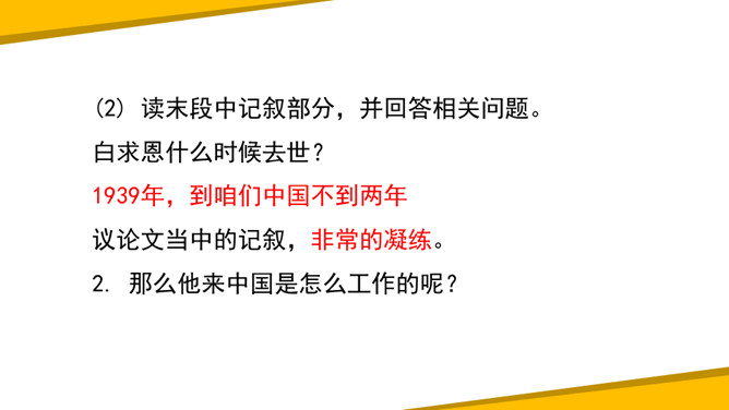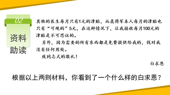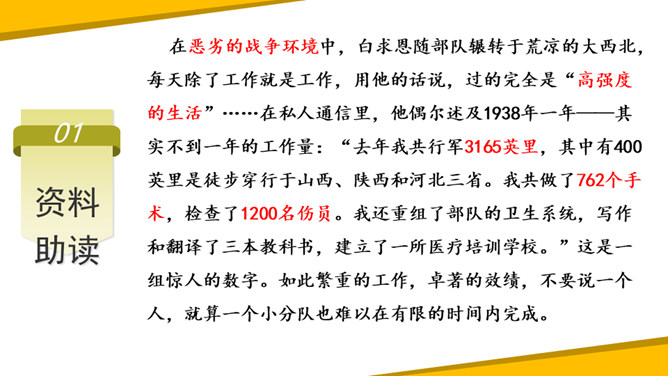 到了1938年的后半年,白求恩就已经非常苦闷了。因为他从一个相对发达的国家,到了一个非常非常闭塞的地方,他甚至晚上要靠吃安定药才能睡去。他的内心中弥漫着无穷的孤独与苦闷,这是真正的白求恩。同学们,当你看了这些资料之后,你又如何看待白求恩?白求恩跟你们一样,那样地热爱生活。作为49岁的男子,他充满了中年男性的睿智,就连他工作的时候都那样的迷人。但是,他把他的一切,把一切苦闷都埋在心里,走到了我们抗日的最前线,最后在我们的这片土地上牺牲。白求恩的伟大,不在于他没有苦闷、没有痛苦,而是在于他战胜了这些苦闷和痛苦。所属专题:纪念白求恩ppt。