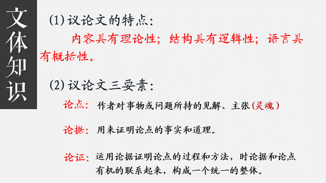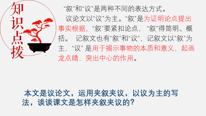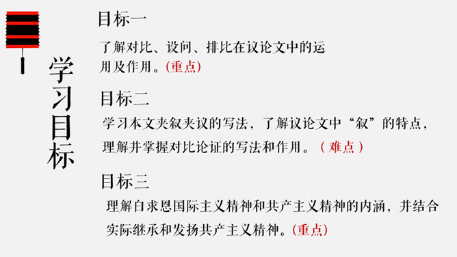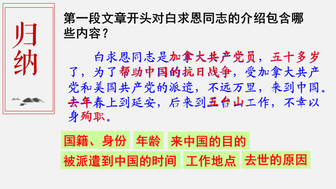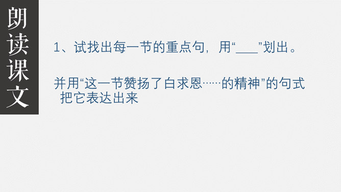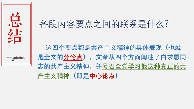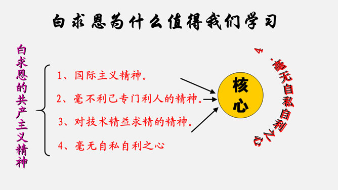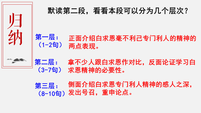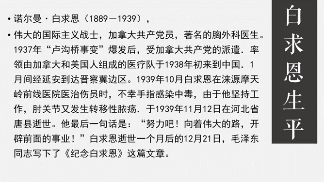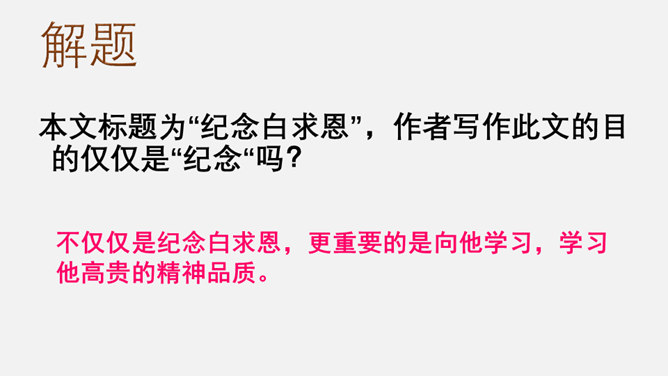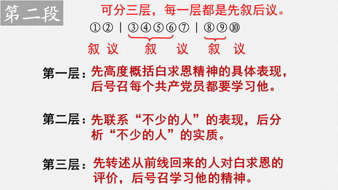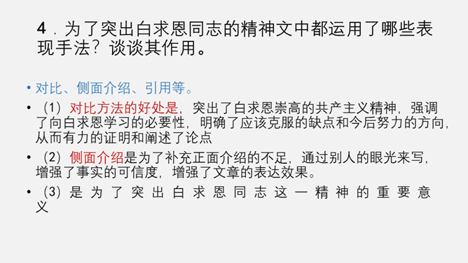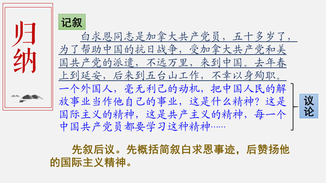 先叙后议。先简叙白求恩对技术的钻研和医术高明,由此及彼联系两种“一班人”给以批评教育。从人格、品质、修养、志趣、人生意义五个方面强调向白求恩学习的意义。采取排比增强了语言的气势,使赞颂的感情显得热情洋溢,同时也避免句子过于冗长,以此结尾,更加有力。这篇议论文运用夹叙夹议的写法,既能使读者由表及里的认识白求恩同志,又能使读者懂得向白求恩同志学习什么,为什么要向他学习。所属专题:纪念白求恩ppt。