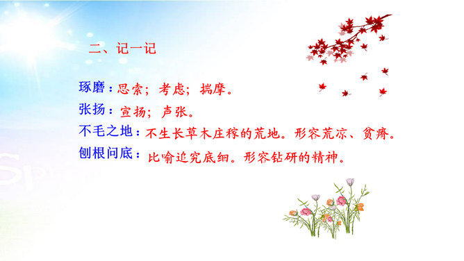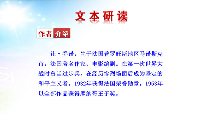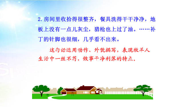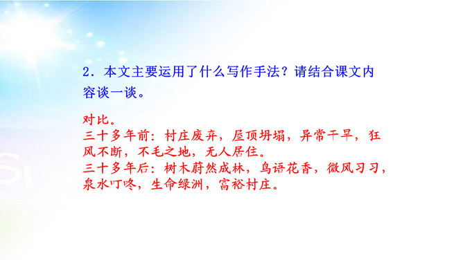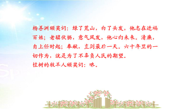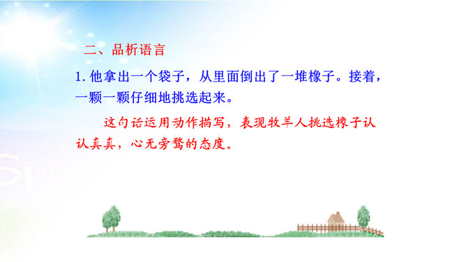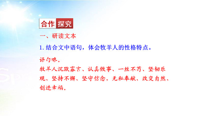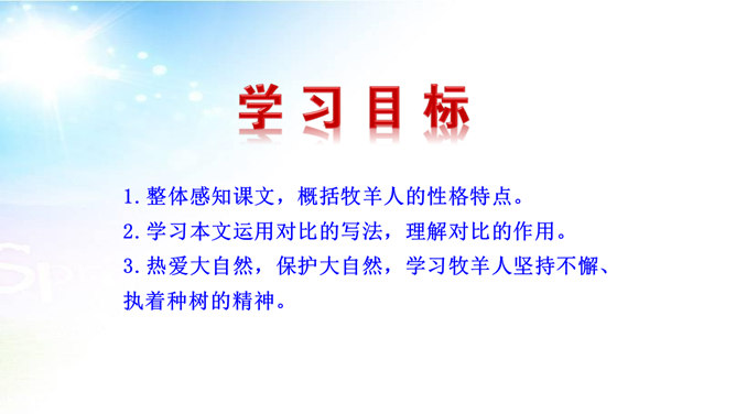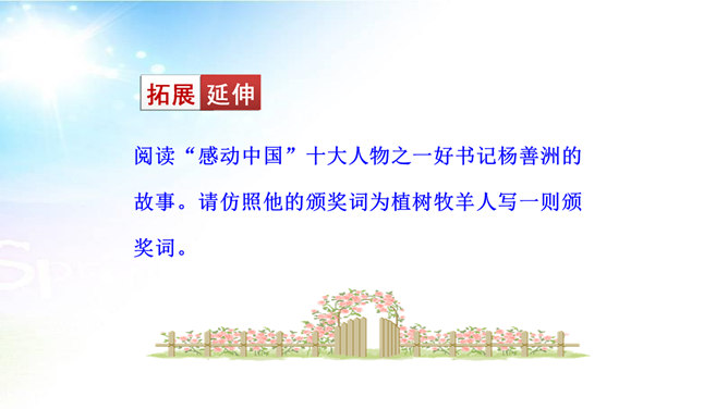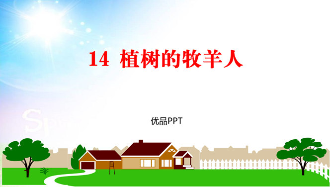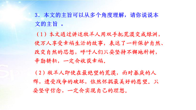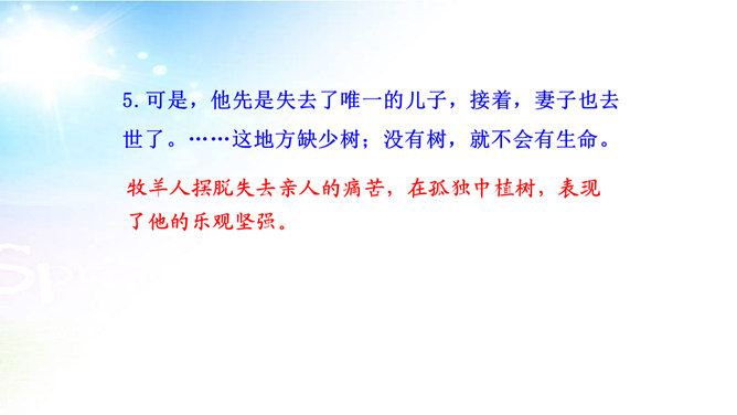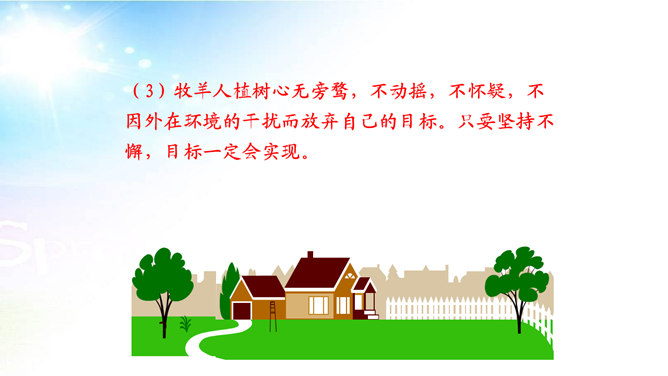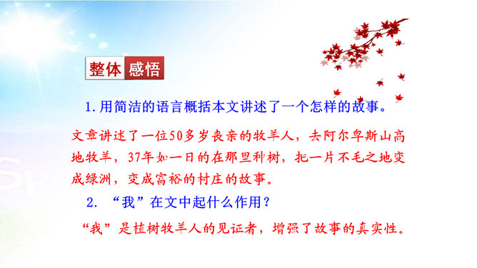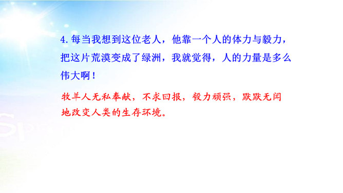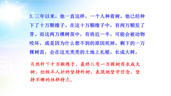 用简洁的语言概括本文讲述了一个怎样的故事。文章讲述了一位50多岁丧亲的牧羊人,去阿尔卑斯山高地牧羊,37年如一日的在那里种树,把一片不毛之地变成绿洲,变成富裕的村庄的故事。“我”在文中起什么作用? “我”是植树牧羊人的见证者,增强了故事的真实性。结合文中语句,体会牧羊人的性格特点。牧羊人沉默寡言、认真做事、一丝不苟、坚韧乐观、坚持不懈、坚守信念,无私奉献、改变自然、创造幸福。所属专题:植树的牧羊人ppt。