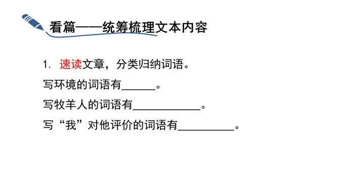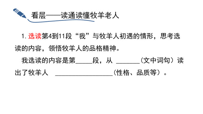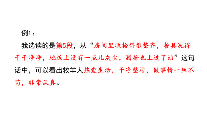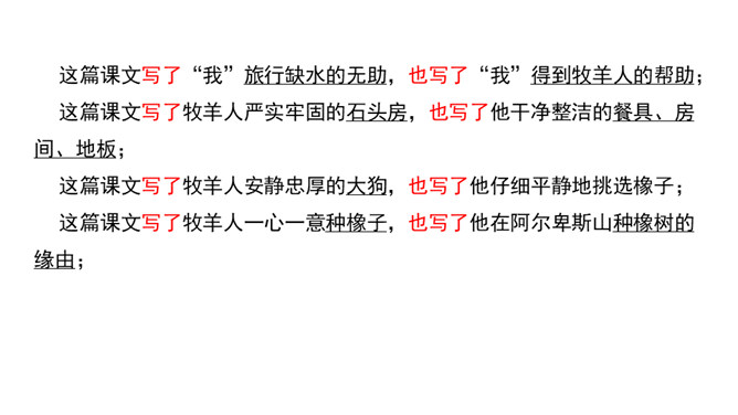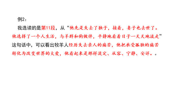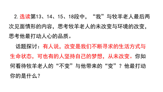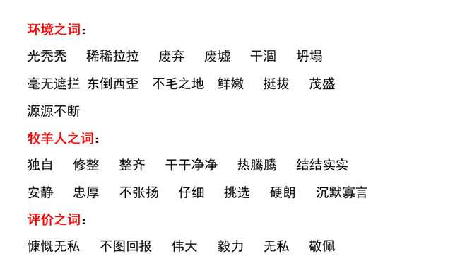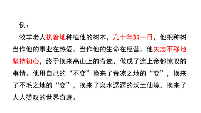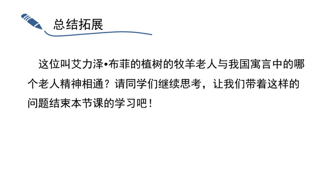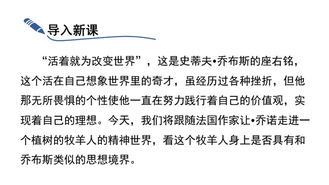 “活着就为改变世界”,这是史蒂夫•乔布斯的座右铭,这个活在自己想象世界里的奇才,虽经历过各种挫折,但他那无所畏惧的个性使他一直在努力践行着自己的价值观,实现着自己的理想。今天,我们将跟随法国作家让•乔诺走进一个植树的牧羊人的精神世界,看这个牧羊人身上是否具有和乔布斯类似的思想境界。从“房间里收拾得很整齐,餐具洗得干干净净,地板上没有一点儿灰尘,猎枪也上过了油”这句话中,可以看出牧羊人热爱生活,干净整洁,做事情一丝不苟,非常认真。所属专题:植树的牧羊人ppt。