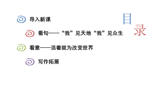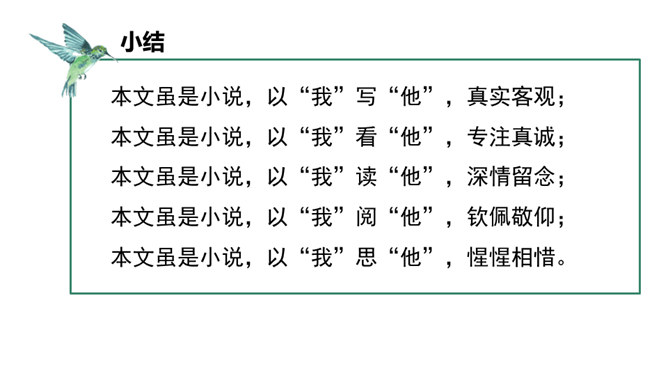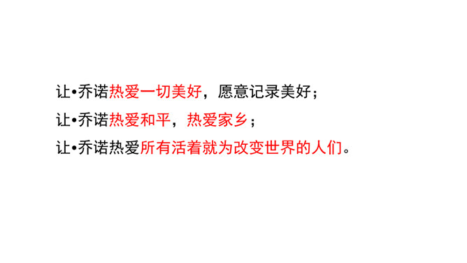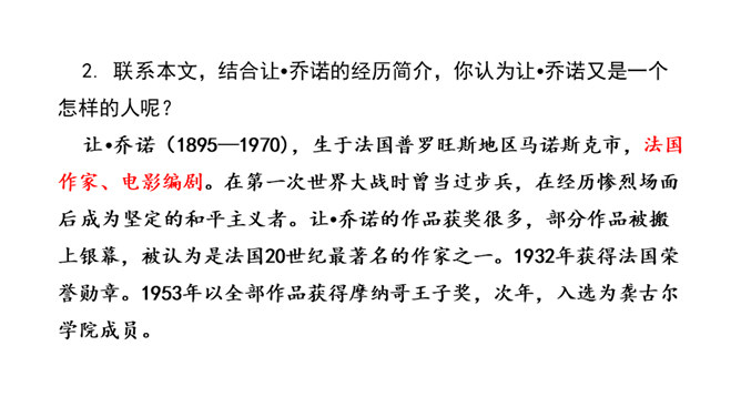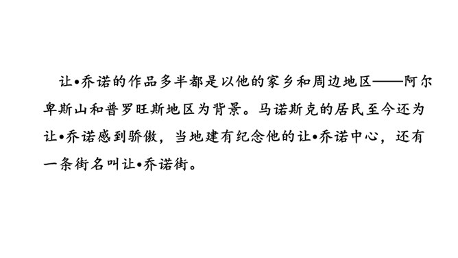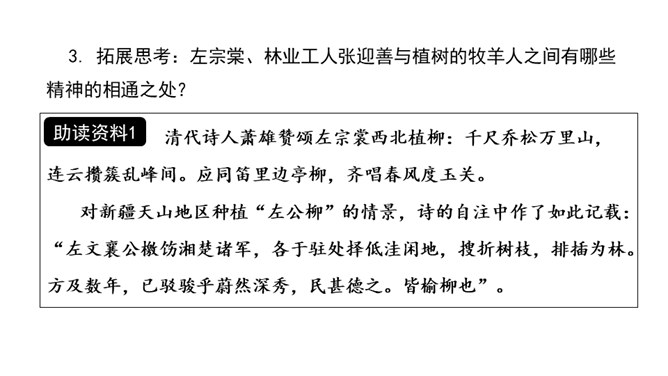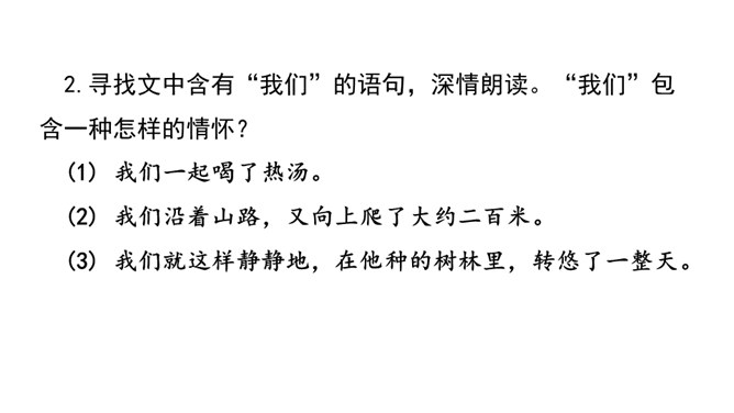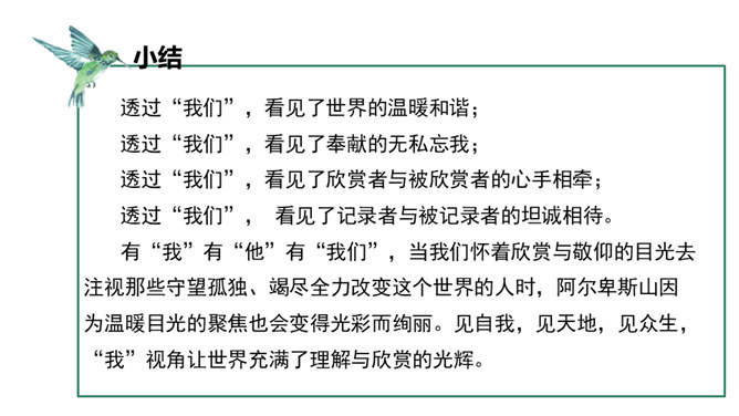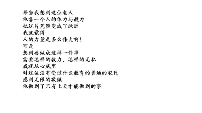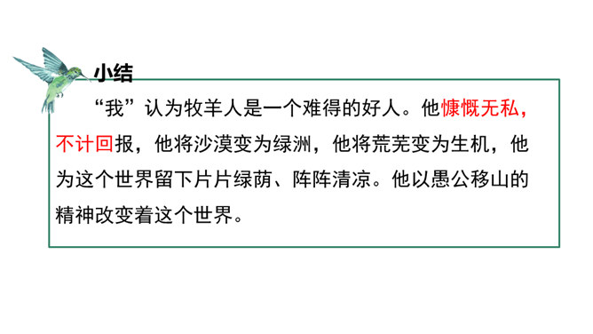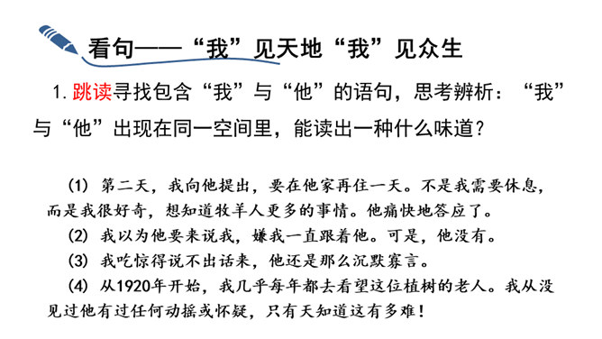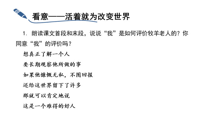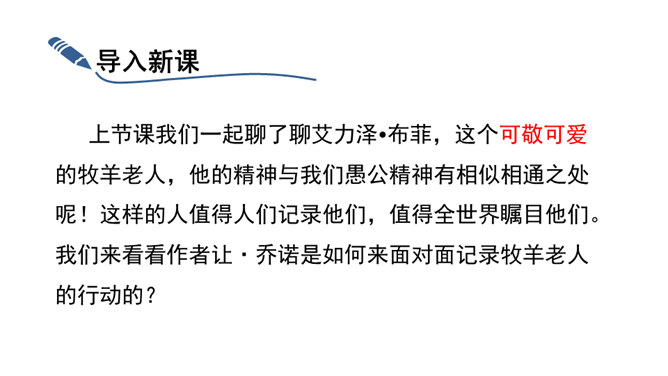 上节课我们一起聊了聊艾力泽•布菲,这个可敬可爱的牧羊老人,他的精神与我们愚公精神有相似相通之处呢!这样的人值得人们记录他们,值得全世界瞩目他们。我们来看看作者让·乔诺是如何来面对面记录牧羊老人的行动的?跳读寻找包含“我”与“他”的语句,思考辨析:“我”与“他”出现在同一空间里,能读出一种什么味道?寻找文中含有“我们”的语句,深情朗读。“我们”包含一种怎样的情怀?朗读课文首段和末段,说说“我”是如何评价牧羊老人的?你同意“我”的评价吗?所属专题:植树的牧羊人ppt。