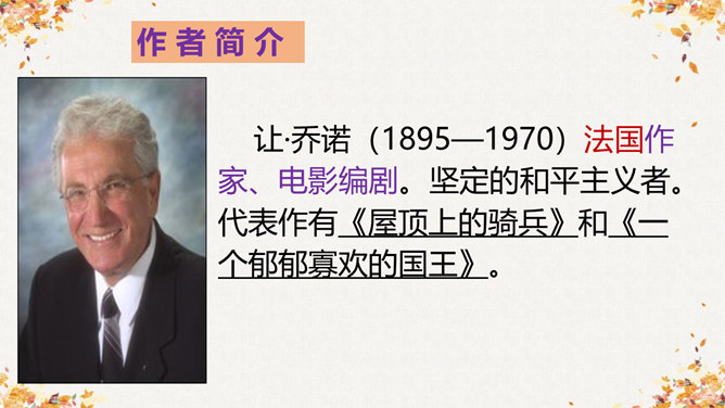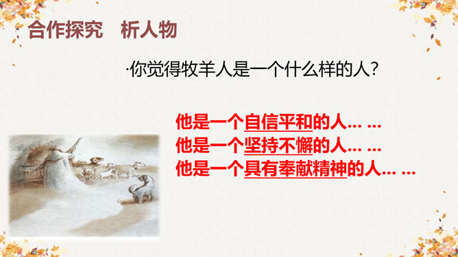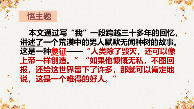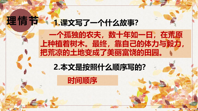 课文写了一个什么故事?一个孤独的农夫,数十年如一日,在荒原上种植着树木。最终,靠自己的体力与毅力,把荒凉的土地变成了美丽富饶的田园。本文是按照什么顺序写的?时间顺序。本文通过写“我”一段跨越三十多年的回忆,讲述了一个荒漠中的男人默默无闻种树的故事。这是一种象征——“人类除了毁灭,还可以像上帝一样创造。”“如果他慷慨无私,不图回报,还给这世界留下了许多,那就可以肯定地说,这是一个难得的好人。”所属专题:植树的牧羊人ppt。
