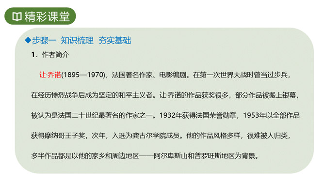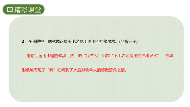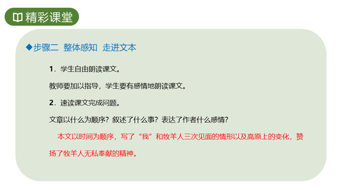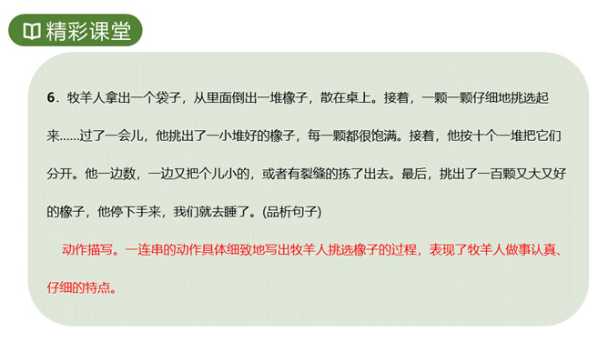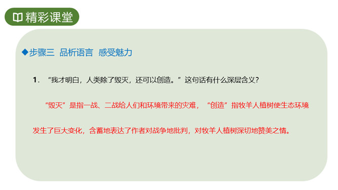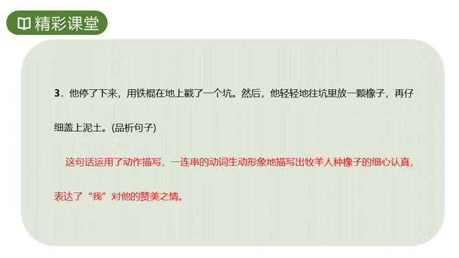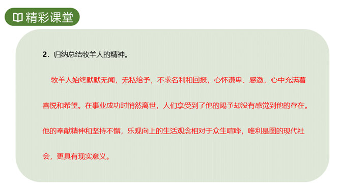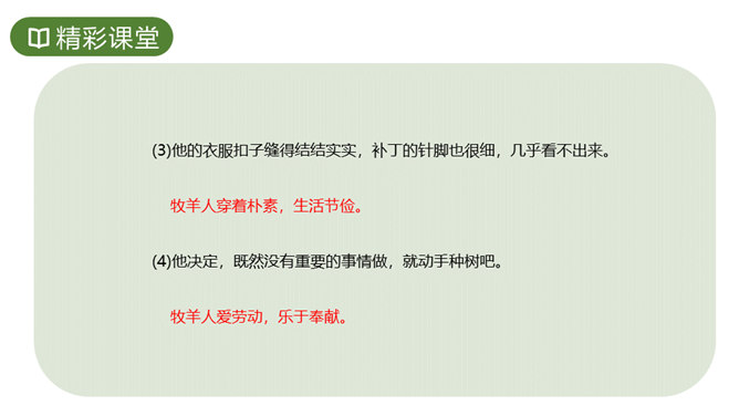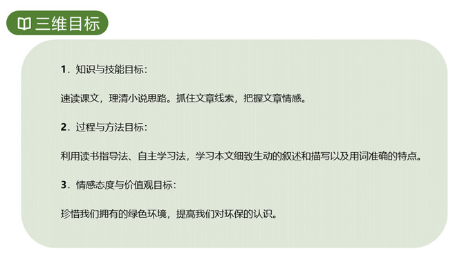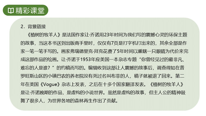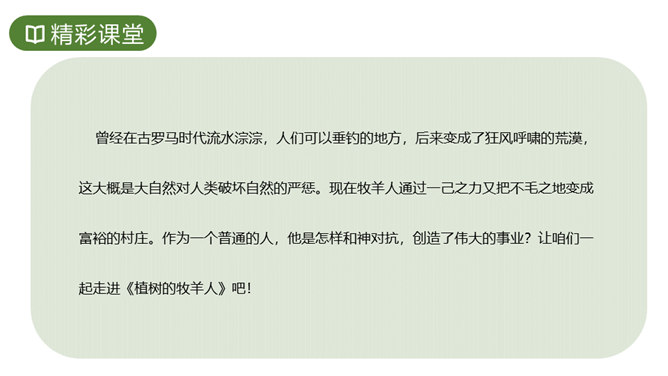 曾经在古罗马时代流水淙淙,人们可以垂钓的地方,后来变成了狂风呼啸的荒漠,这大概是大自然对人类破坏自然的严惩。现在牧羊人通过一己之力又把不毛之地变成富裕的村庄。作为一个普通的人,他是怎样和神对抗,创造了伟大的事业?让咱们一起走进课文吧!1.知识与技能目标:速读课文,理清小说思路。抓住文章线索,把握文章情感。2.过程与方法目标:利用读书指导法、自主学习法,学习本文细致生动的叙述和描写以及用词准确的特点。3.情感态度与价值观目标:珍惜我们拥有的绿色环境,提高我们对环保的认识。所属专题:植树的牧羊人ppt。