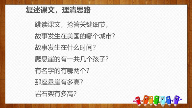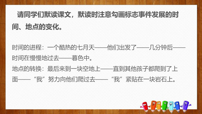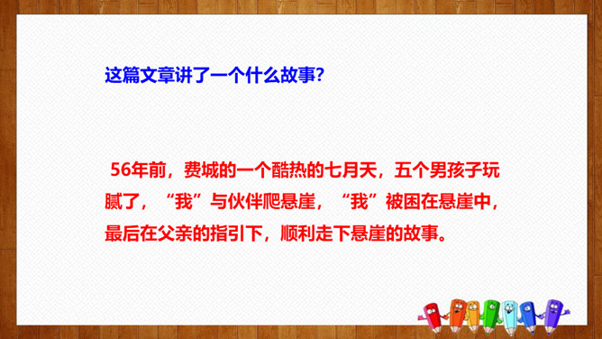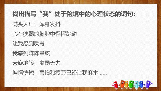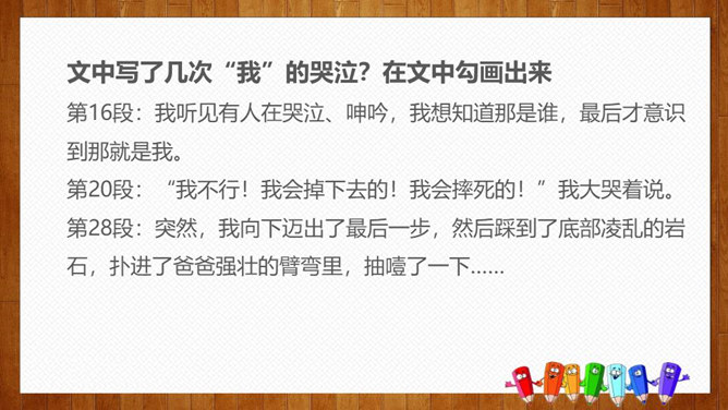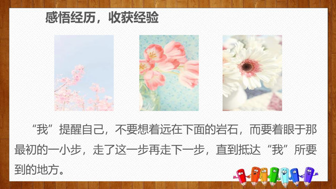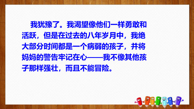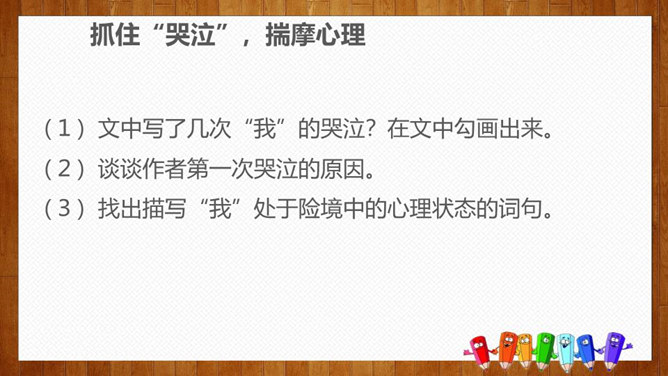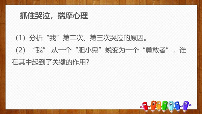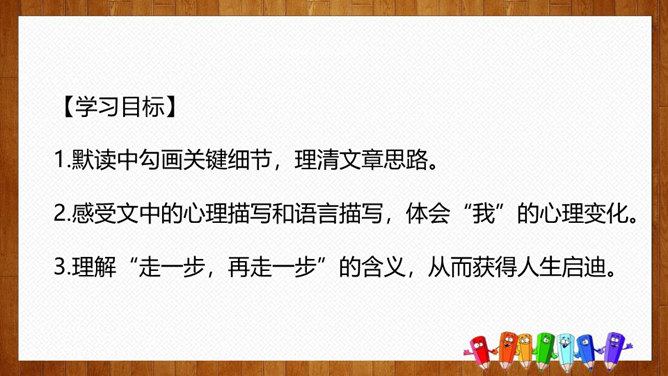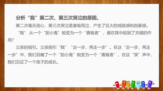 分析“我”第二次、第三次哭泣的原因。第二次毫无信心,第三次哭泣是喜极而泣,产生了巨大的成就感和自豪感。“我” 从一个“胆小鬼”蜕变为一个“勇敢者”,谁在其中起到了关键的作用?父亲的指引。父亲指引“我”“走一步,再走一步”。在这“走一步,再走一步”中,我们目睹了一个“胆小鬼”蜕变为一个“勇敢者”,在这“哭”声中,我们见证了一个孩子的成长。犹豫又渴望,表明“我”当时对要不要爬悬崖这件事的矛盾心理。所属专题:走一步再走一步ppt。