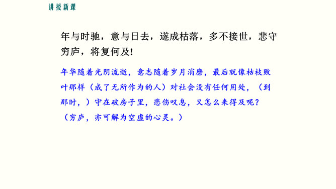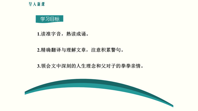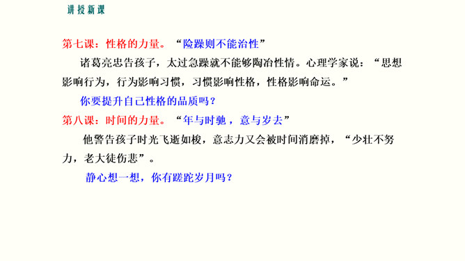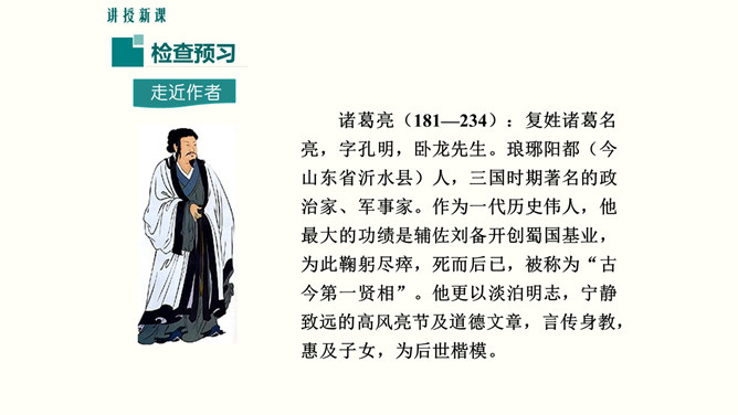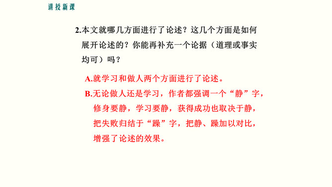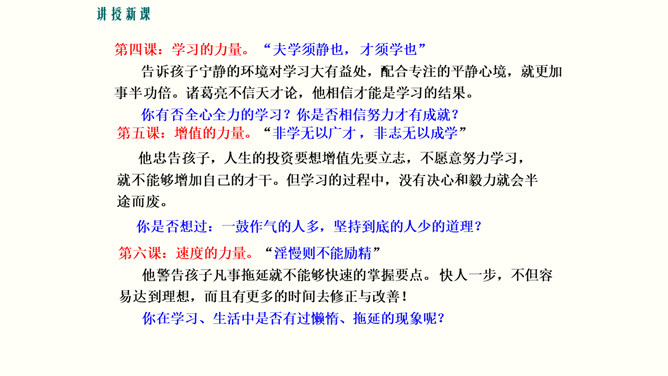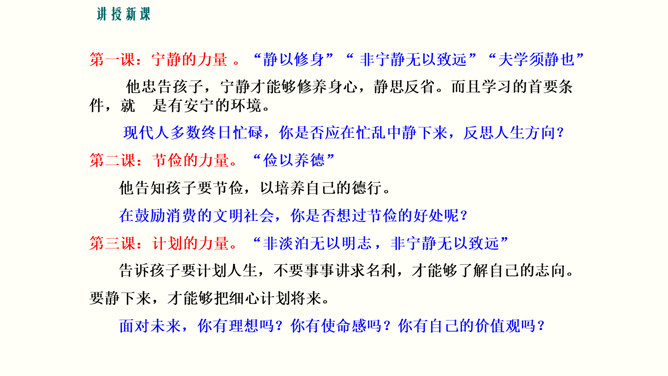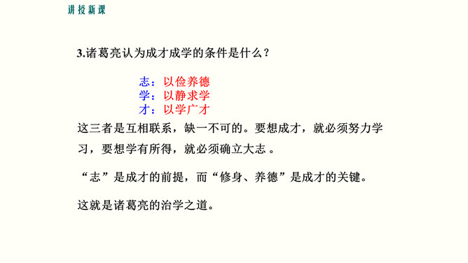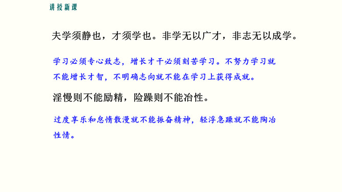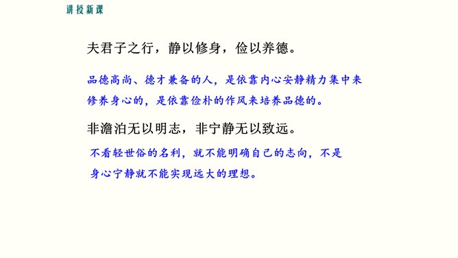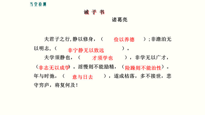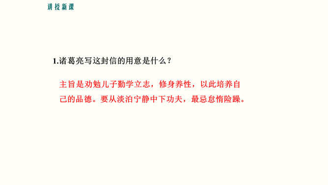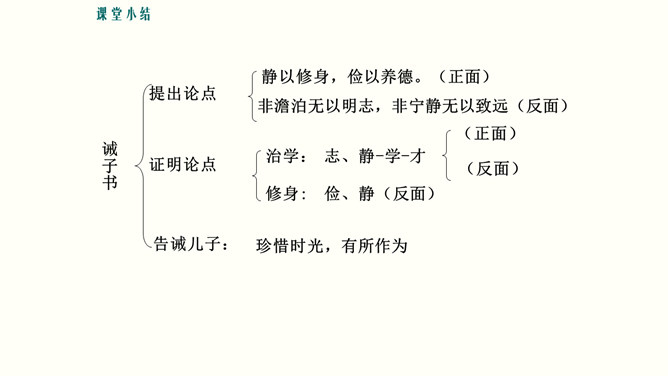 1.读准字音,熟读成诵。2.精确翻译与理解文章,注意积累警句。3.领会文中深刻的人生理念和父对子的拳拳亲情。诸葛亮写这封信的用意是什么?主旨是劝勉儿子勤学立志,修身养性,以此培养自己的品德。要从淡泊宁静中下功夫,最忌怠惰险躁。本文就哪几方面进行了论述?这几个方面是如何展开论述的?你能再补充一个论据(道理或事实均可)吗?就学习和做人两个方面进行了论述。无论做人还是学习,作者都强调一个“静”字,修身要静,学习要静,获得成功也取决于静,把失败归结于“躁”字,把静、躁加以对比,增强了论述的效果。所属专题:诫子书ppt。