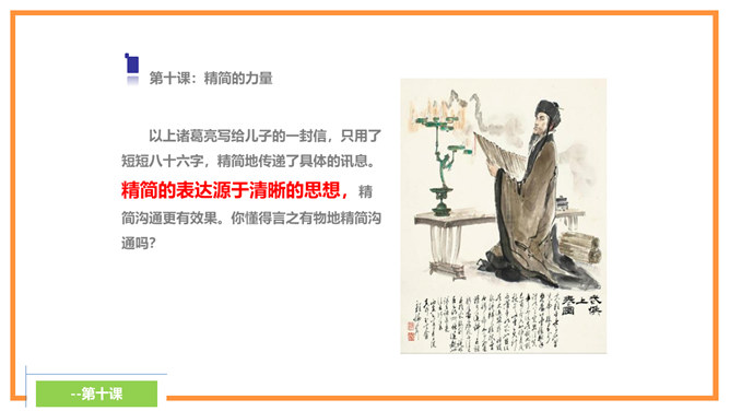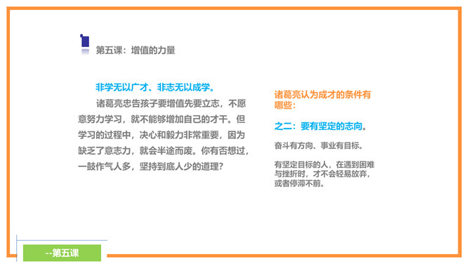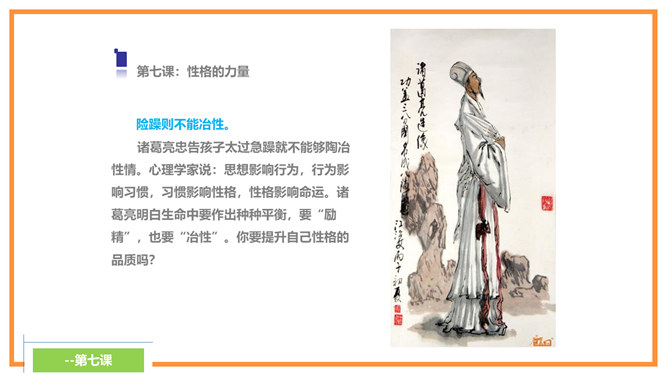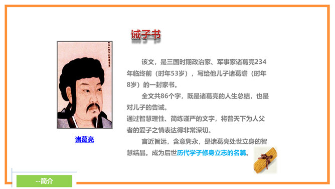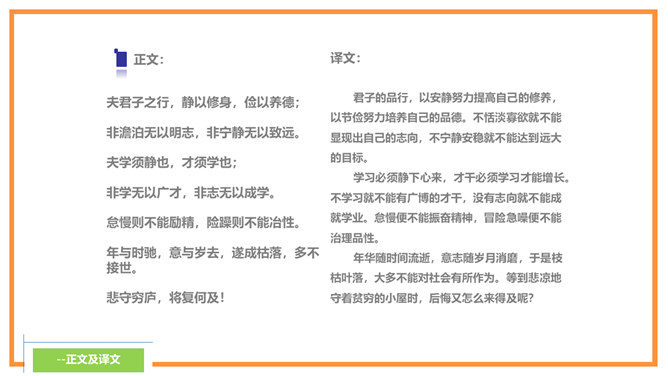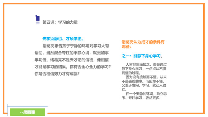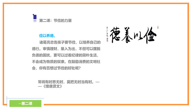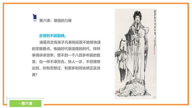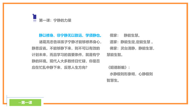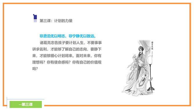 诸葛亮忠告诉孩子宁静才能够修养身心,静思反省。不能够静下来,则不可以有效的计划未来,而且学习的首要条件,就是有宁静的环境。现代人大多数终日忙碌,你是否应在忙乱中静下来,反思人生方向?诸葛亮忠告孩子要节俭,以培养自己的德行。审慎理财,量入为出,不但可以摆脱负债的困扰,更可以过着纪律的简朴生活,不会成为物质的奴隶。在鼓励消费的文明社会,你有否想过节俭的好处呢?所属专题:诫子书ppt。