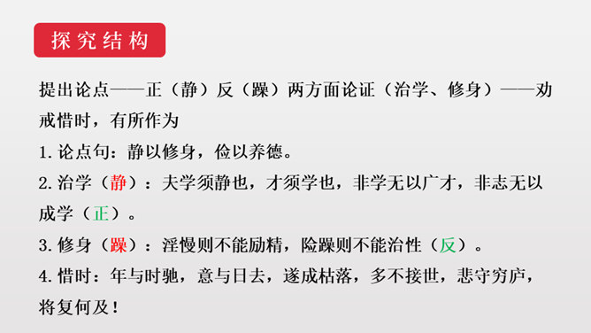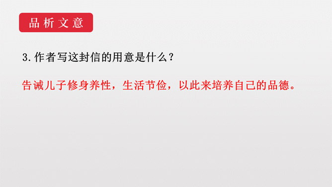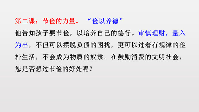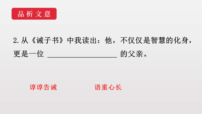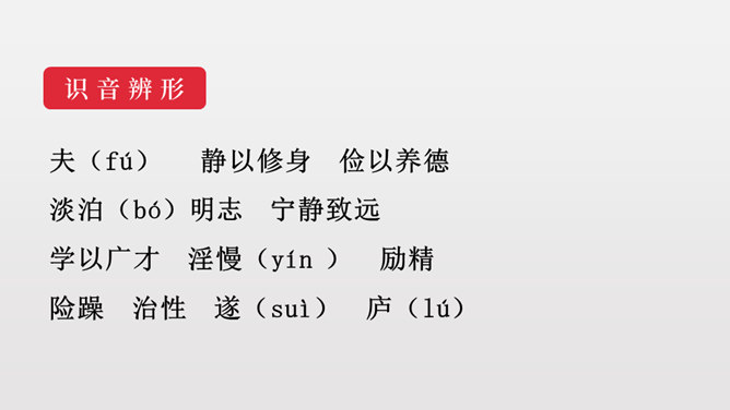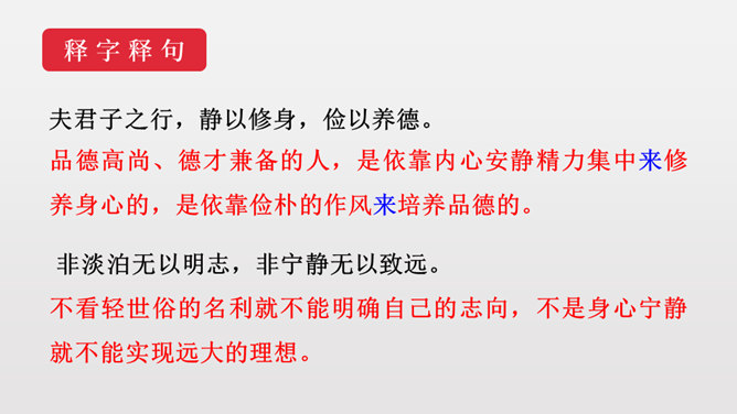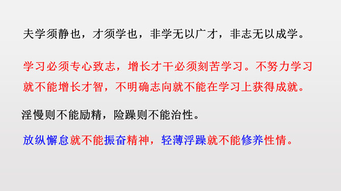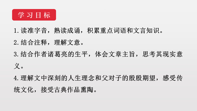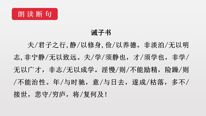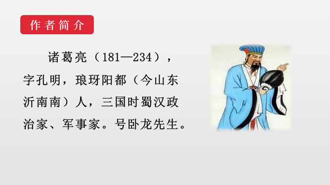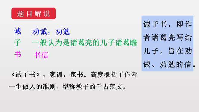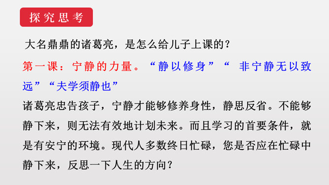 大名鼎鼎的诸葛亮,是怎么给儿子上课的? 第一课:宁静的力量。“静以修身”“ 非宁静无以致远”“夫学须静也” 诸葛亮忠告孩子,宁静才能够修养身性,静思反省。不能够静下来,则无法有效地计划未来。而且学习的首要条件,就是有安宁的环境。现代人多数终日忙碌,您是否应在忙碌中静下来,反思一下人生的方向?第二课:节俭的力量。 “俭以养德” 他告知孩子要节俭,以培养自己的德行。审慎理财,量入为出,不但可以摆脱负债的困扰,更可以过着有规律的俭朴生活,不会成为物质的奴隶。在鼓励消费的文明社会,您是否想过节俭的好处呢?所属专题:诫子书ppt。