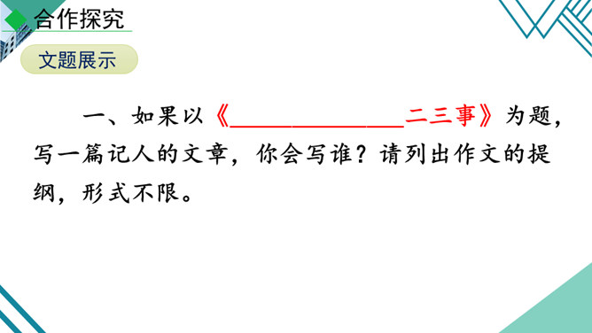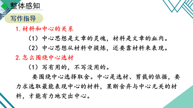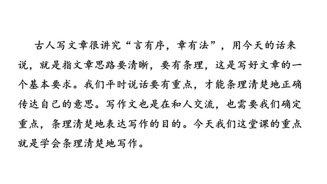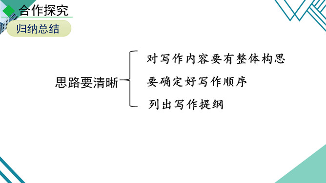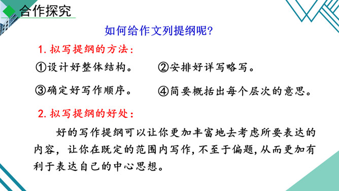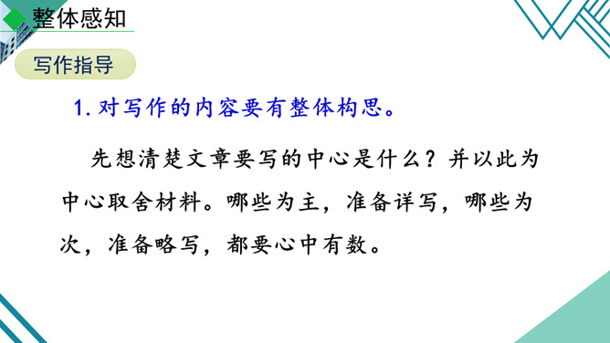 结构安排,是作文提纲中最主要的部分,设计时需要注意做到以下五点:①安排好材料的组织顺序。先写什么后写什么,全文一共分为几段,每段写什么……都要写清楚,并根据列出的内容确定好写作的顺序。②确定内容的详略。依据表达中心的需要,确定好哪些内容是主要的,哪些内容是次要的,并标出“详”“次详”“略”的字样;重点段落将分几层来写,具体列出准备详写的内容。③依据文章选定的材料及要表达的中心确定好开头、结尾,并在提纲中简单注明。④设计好点题的时机及具体的方式、方法。⑤考虑好层次之间、段落之间衔接过渡的方法,标注清楚需要照应的内容及方法。所属专题:思路要清晰ppt。