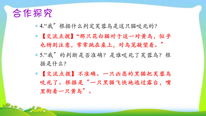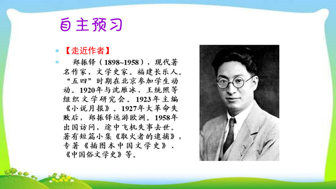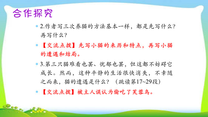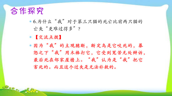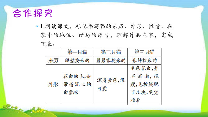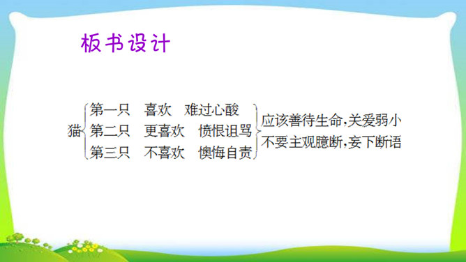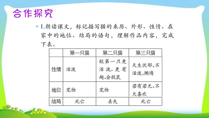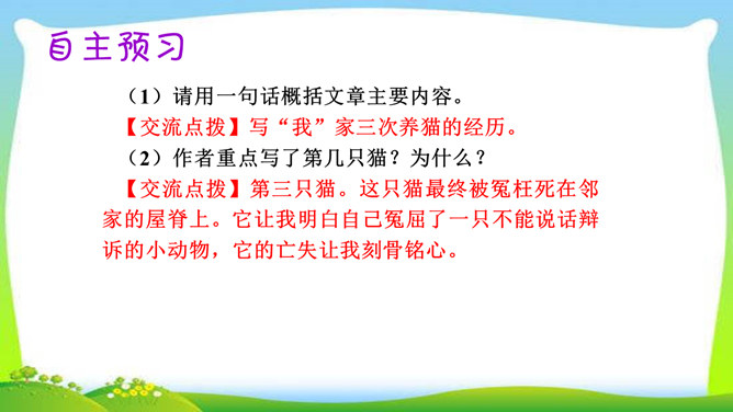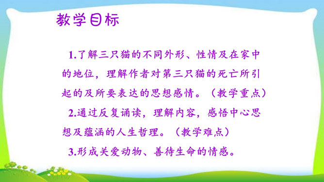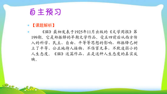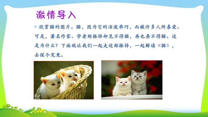 教学目标:1.了解三只猫的不同外形、性情及在家中的地位,理解作者对第三只猫的死亡所引起的及所要表达的思想感情。(教学重点)2.通过反复诵读,理解内容,感悟中心思想及蕴涵的人生哲理。(教学难点)3.形成关爱动物、善待生命的情感。欣赏猫的图片。猫,因为它的活泼乖巧,而被许多人所喜爱。可是,著名作家、学者郑振铎却见不得猫,再也养不得猫。这是为什么?下面就让我们一起走近郑振铎,一起解读《猫》,去探个究竟。所属专题:猫ppt。